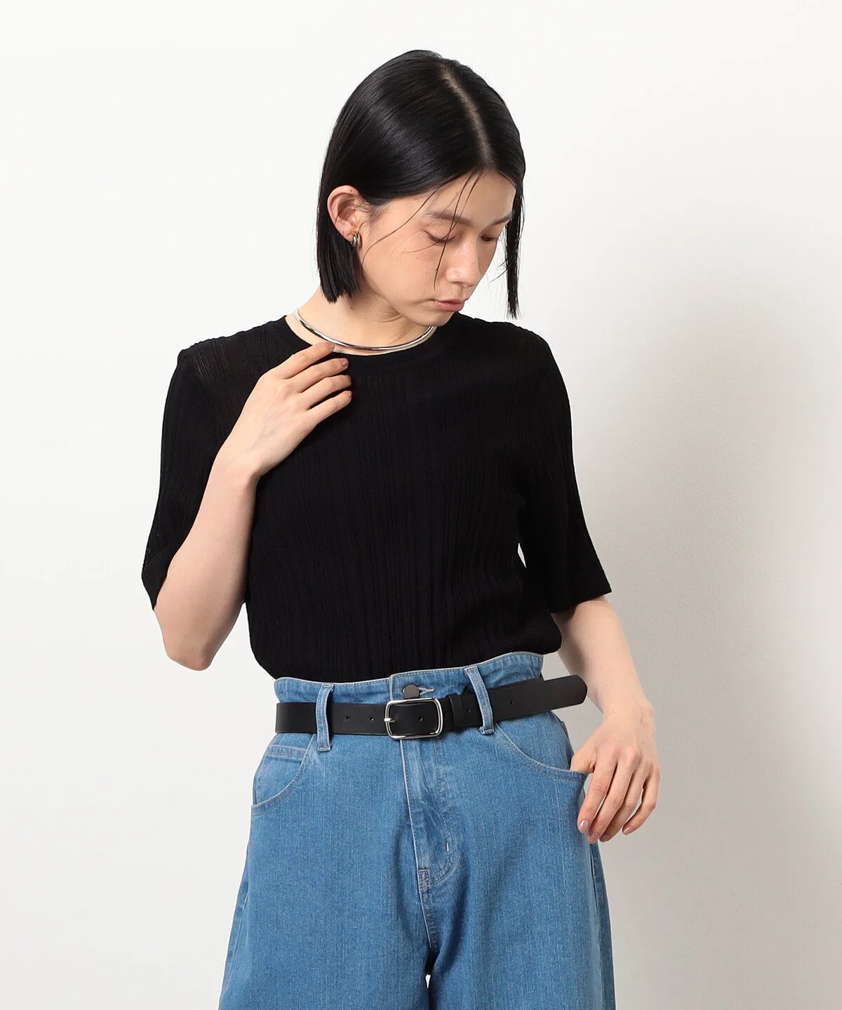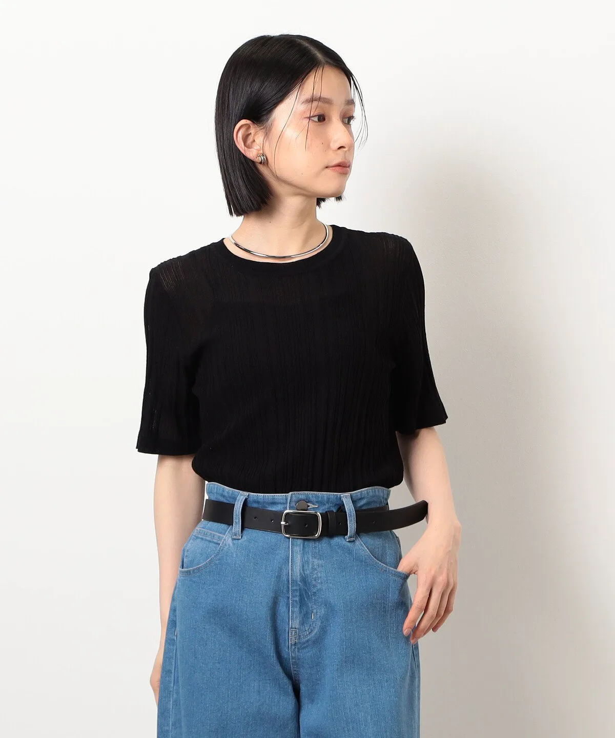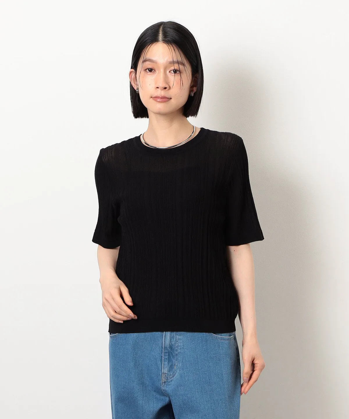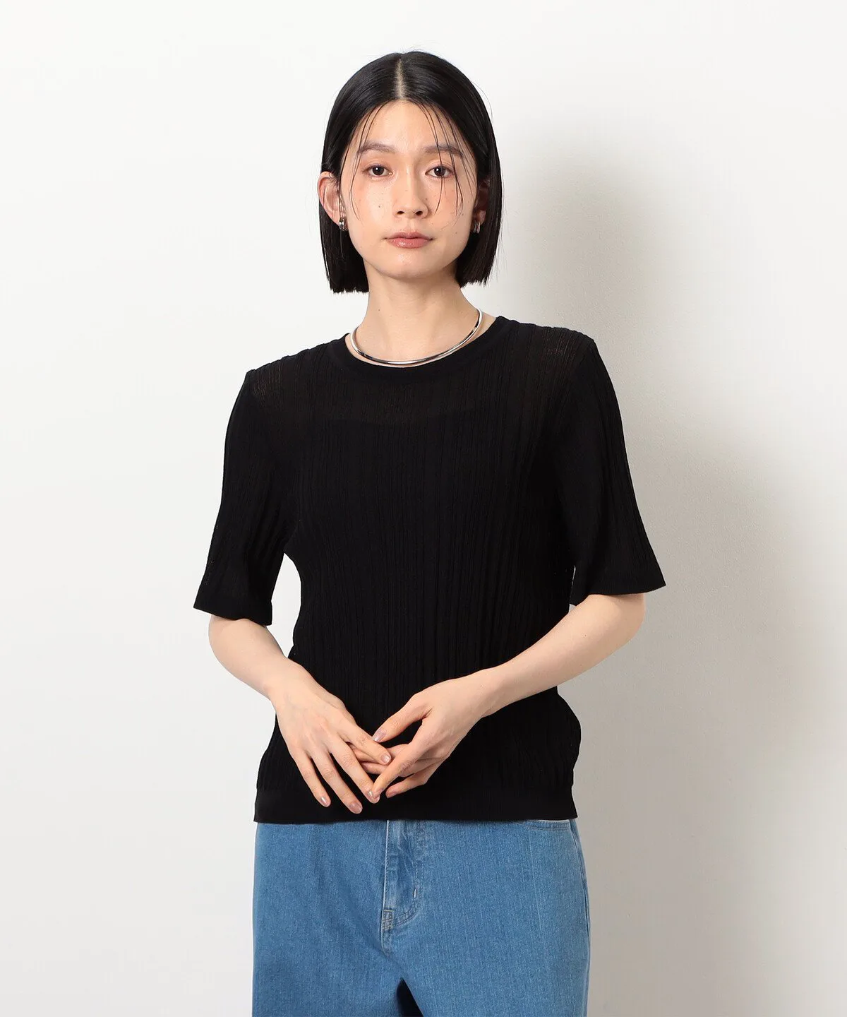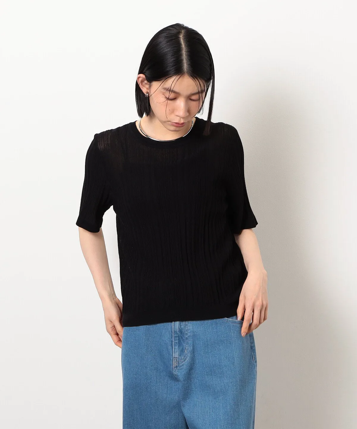 Вязаный топ с привлекательной ребристой отделкой случайного шага на прозрачном материале.