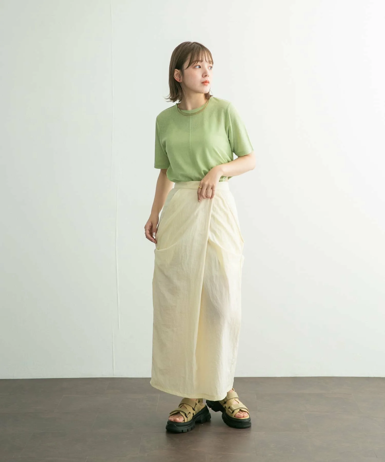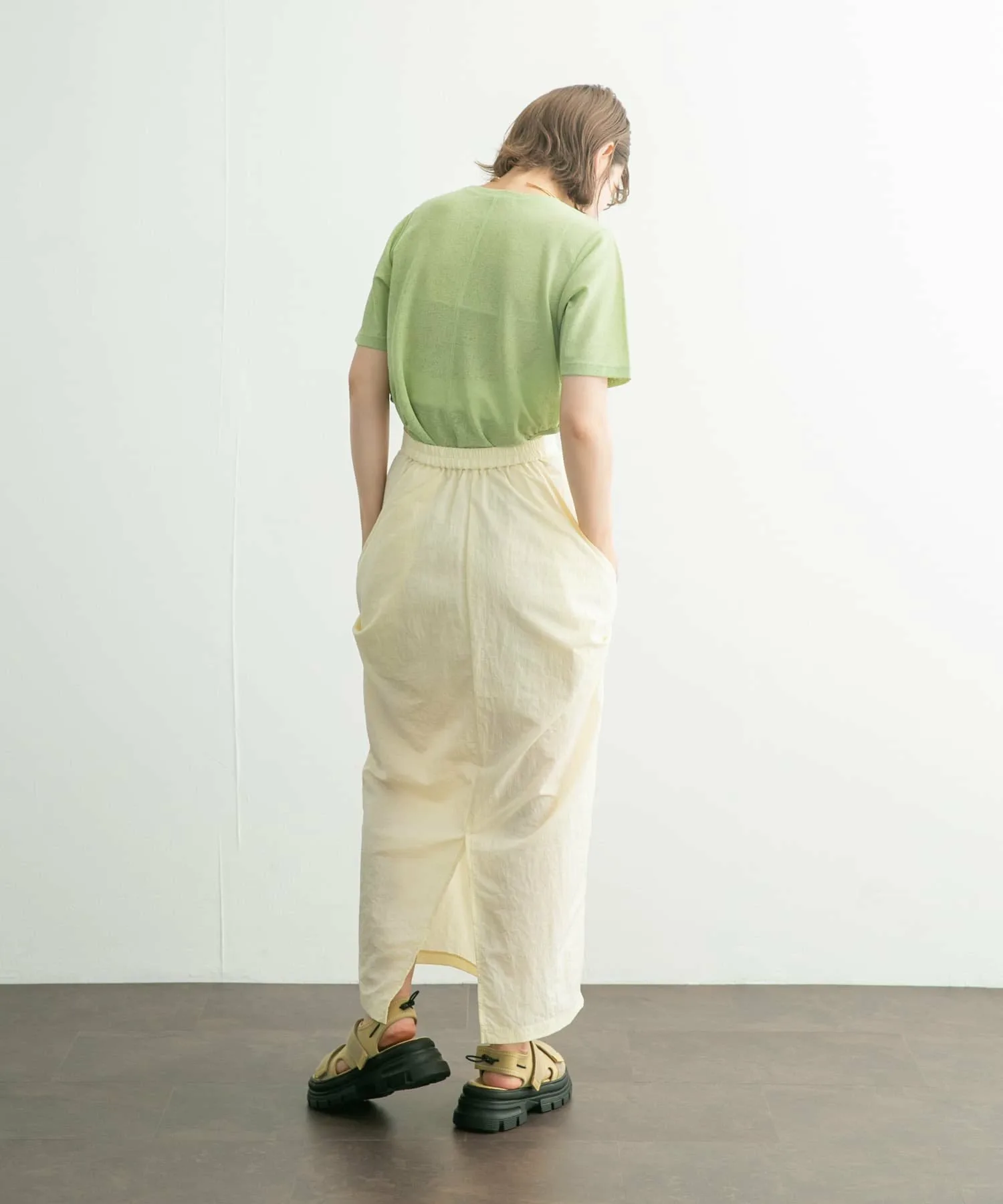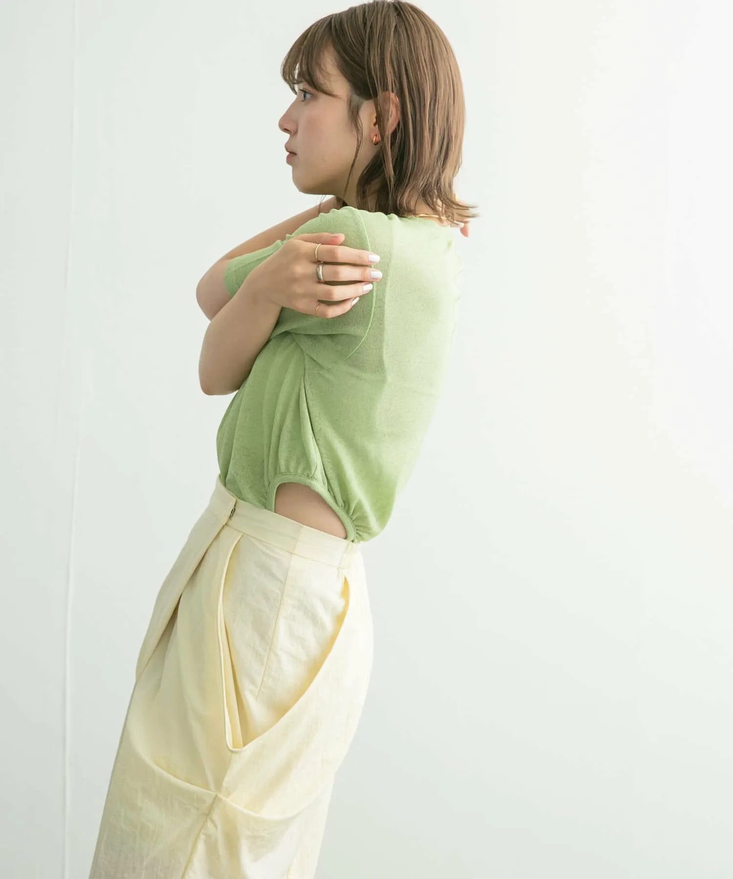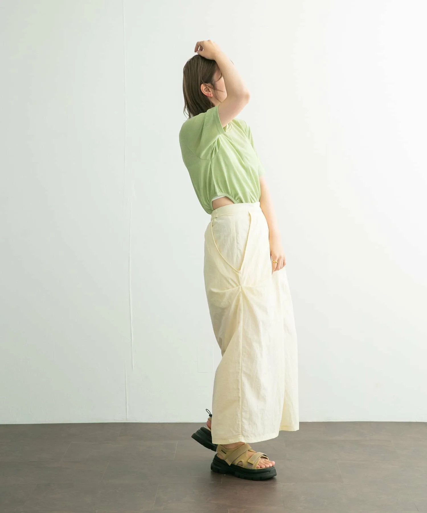 Сшитый крой с петлей на поясе, которая ненавязчиво демонстрирует кожу. Слегка плотный материал и закругленный край также являются отличительными чертами. Это вещь, которая добавит изюминку вашему повседневному образу.