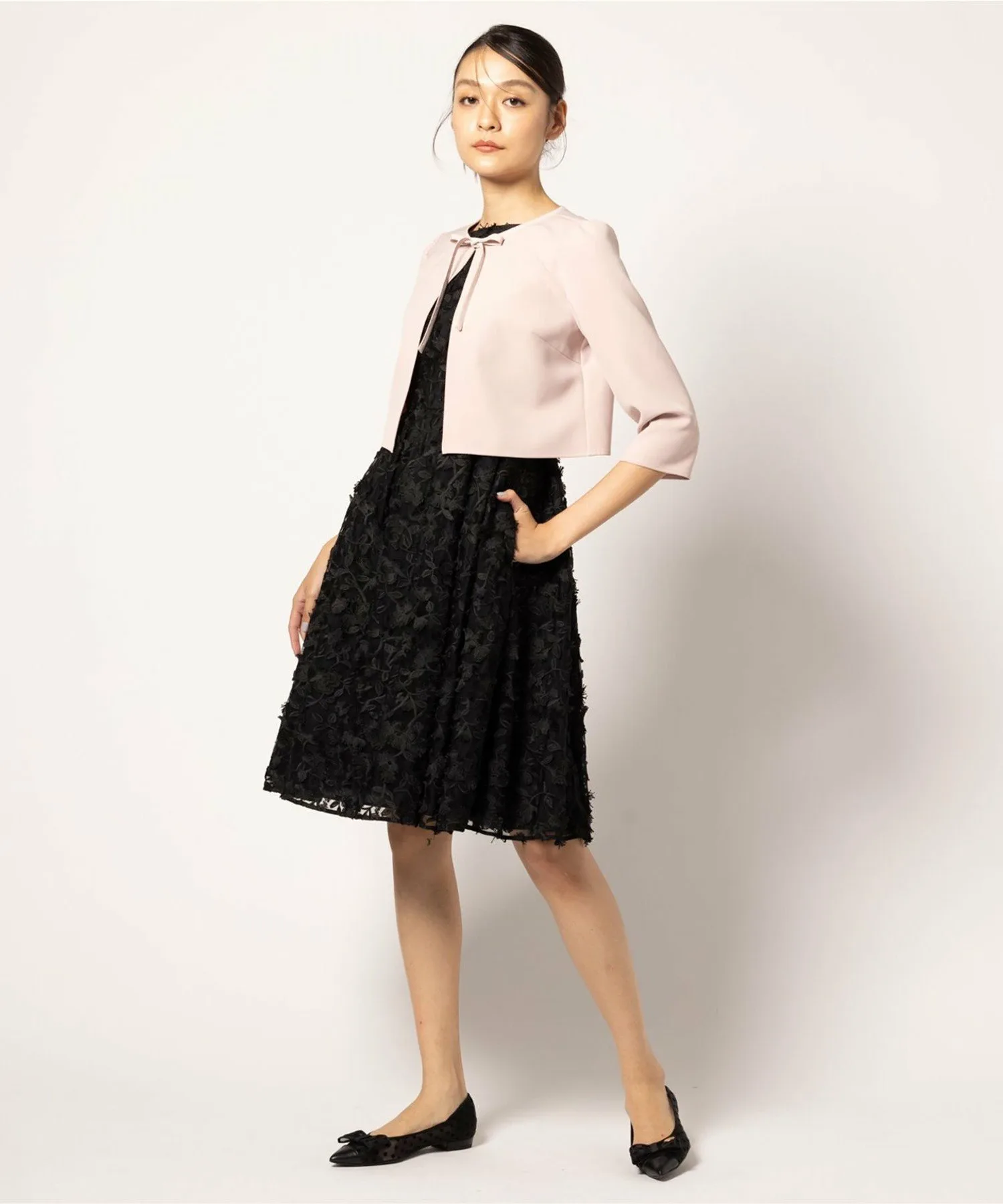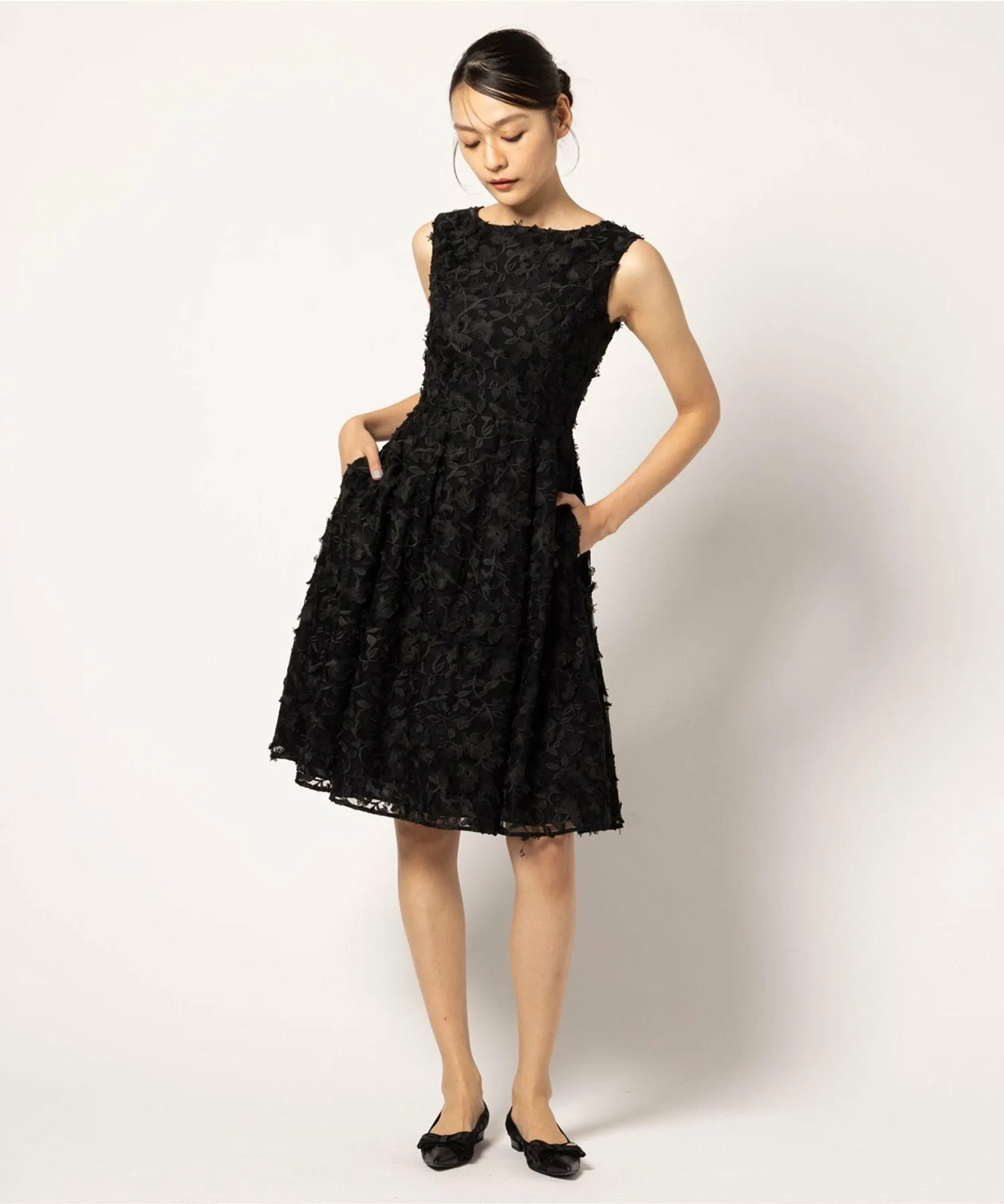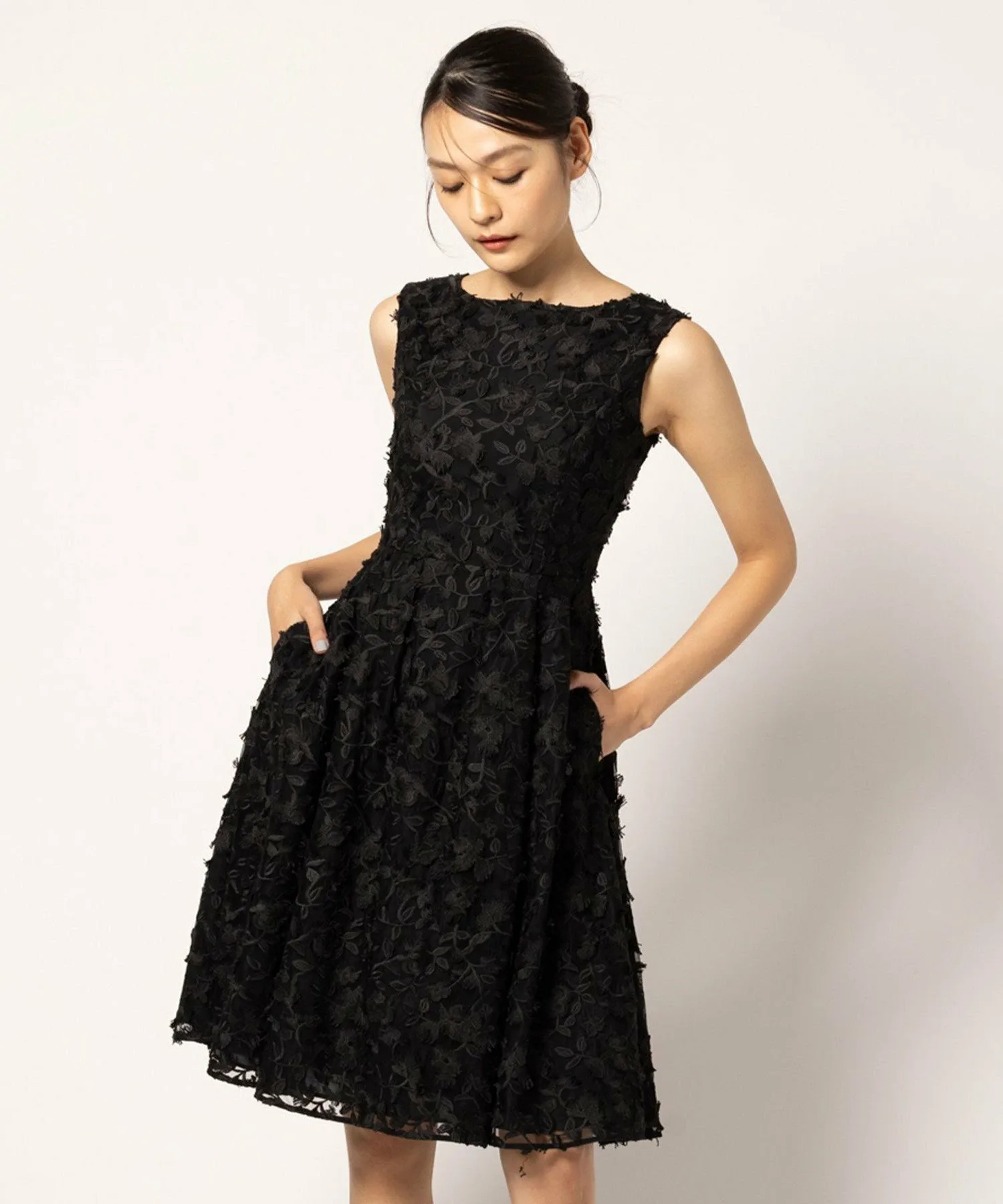 В нем используется импортная вышитая ткань, которая создает трехмерное и изысканное впечатление, но при этом очень красиво смотрится в одном цвете.