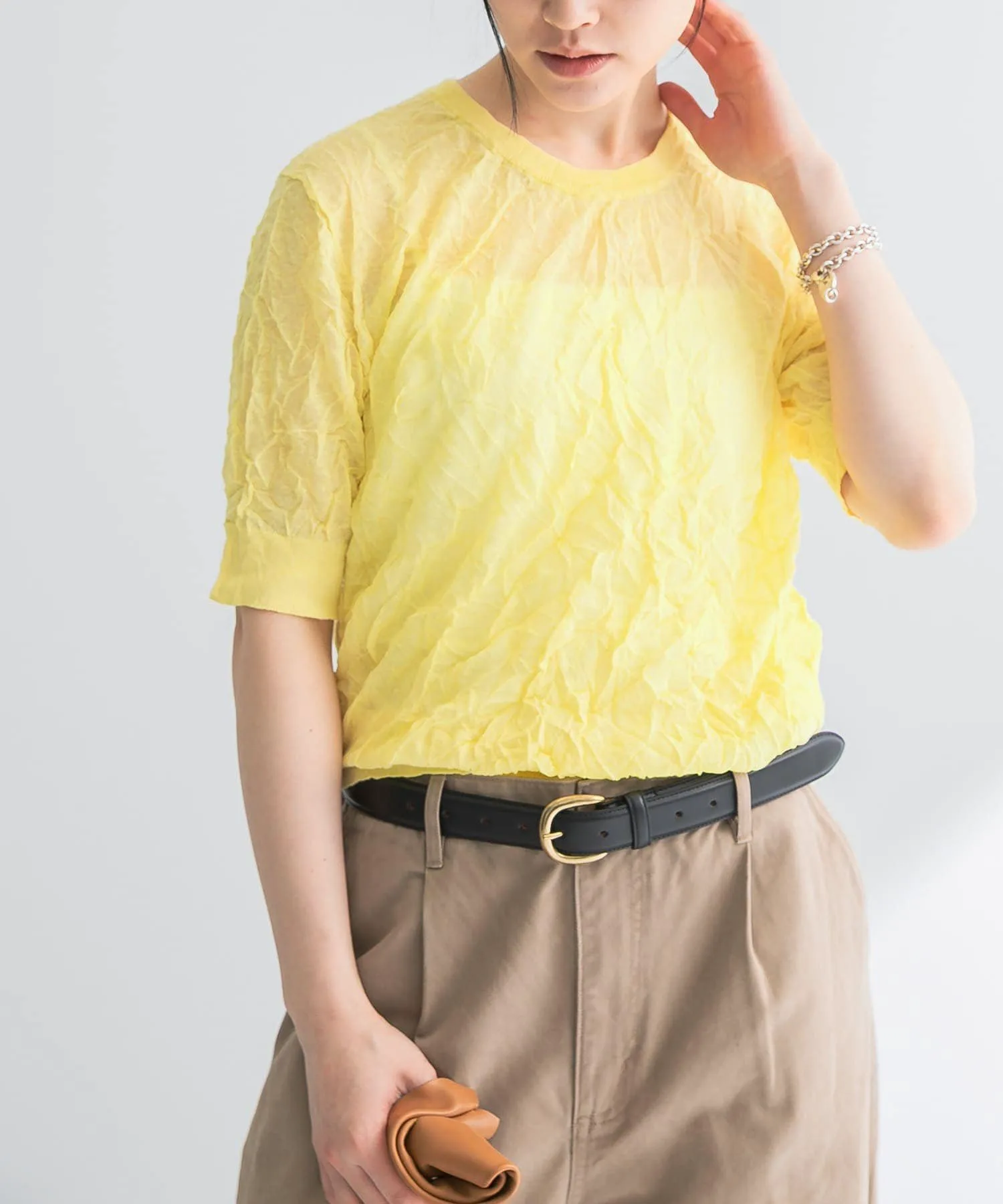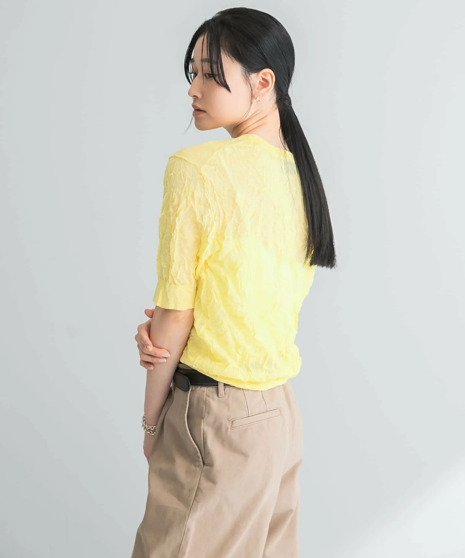 У нас также есть трикотаж с воротником-стойкой из смеси льна (URA5-22T012), изготовленный из того же материала.