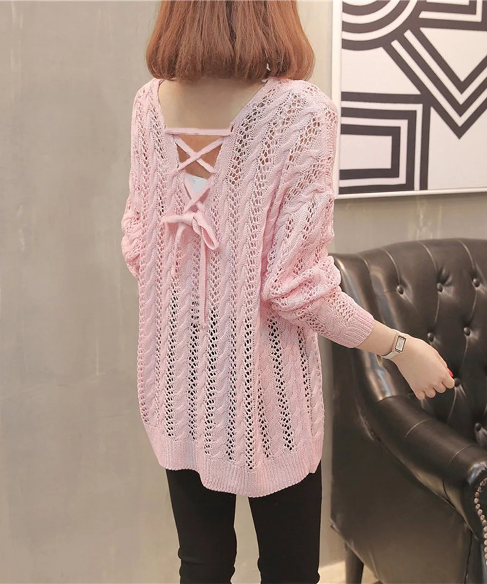 Женский вязаный пуловер с V-образным вырезом, свободный летний свитер с длинными рукавами и сетчатой вязкой. Сексуальный.