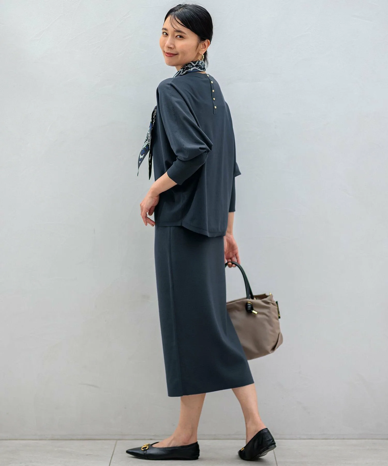 Этот пуловер с рукавами «летучая мышь» популярен каждый год. Благодаря тому, что передняя и задняя части немного отличаются, ношение его с немного откинутым назад воротником создает более мягкий, женственный образ. Длинная ребристая отделка и разрезы на манжетах — ключевые особенности. Эта универсальная вещь может сочетаться как с брюками, так и с юбками. Мы также рекомендуем сочетать его с юбкой из той же серии. Доступен в восьми цветах: светло-серый (#003), черный (#005), красный (#010), темно-коричневый (#035), синий (#070), серо-синий (#074), желтый (#040) и темно-зеленый (#065).