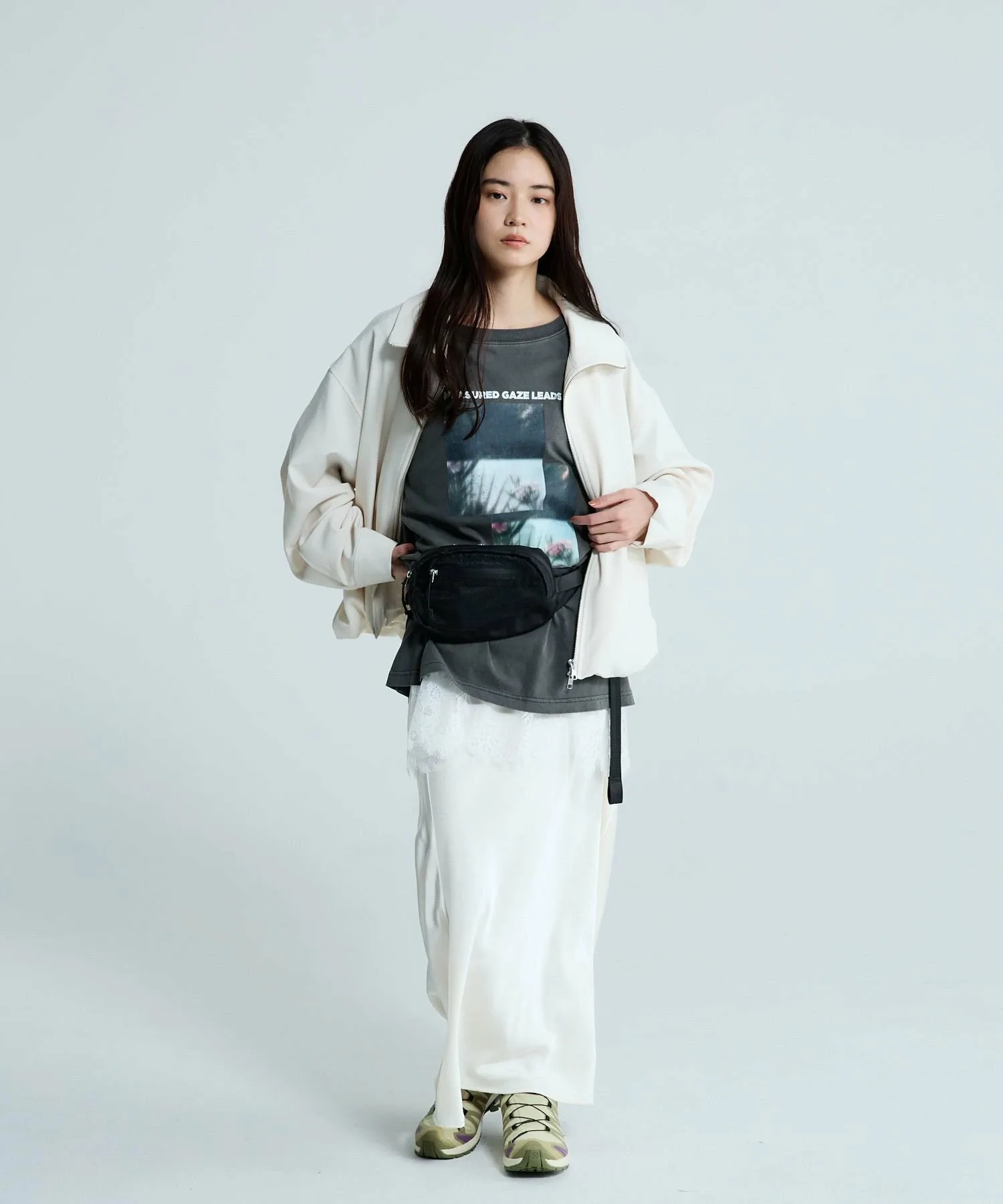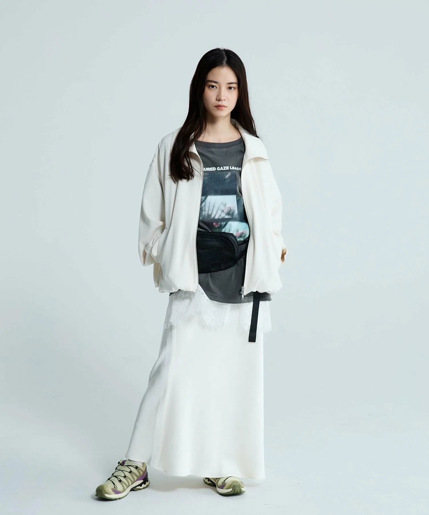 В этом сезоне отлично смотрится в сочетании с женственными вещами, такими как кружево и тюль.
