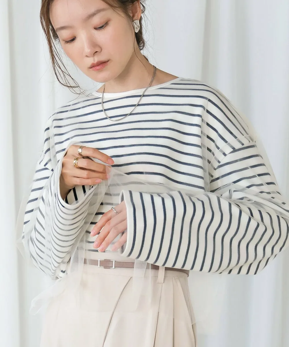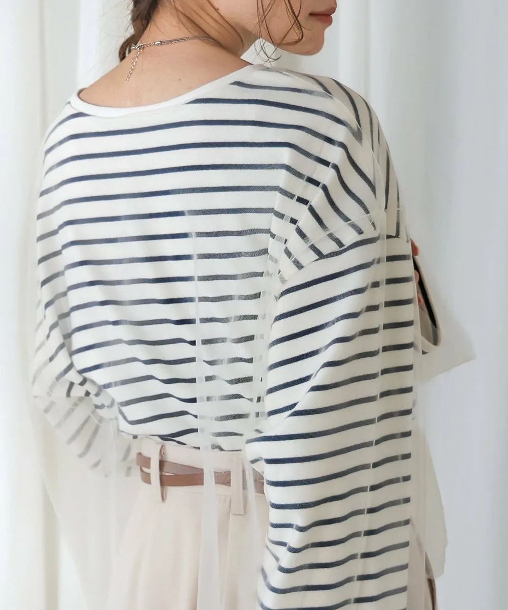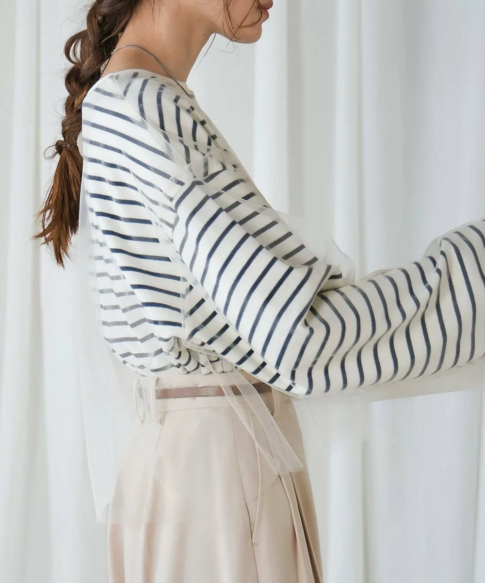 POINTЭтот легкий топ сочетает в себе нежную тюлевую ткань с повседневным полосатым узором. Короткая длина создает прекрасный баланс и визуально удлиняет ноги. Округлый силуэт, созданный приспущенными плечами, выглядит женственно и выгодно подчеркивает фигуру, что делает его отличным вариантом. Неглубокий вырез горловины создает утонченный образ, сочетая изысканность и непринужденность.