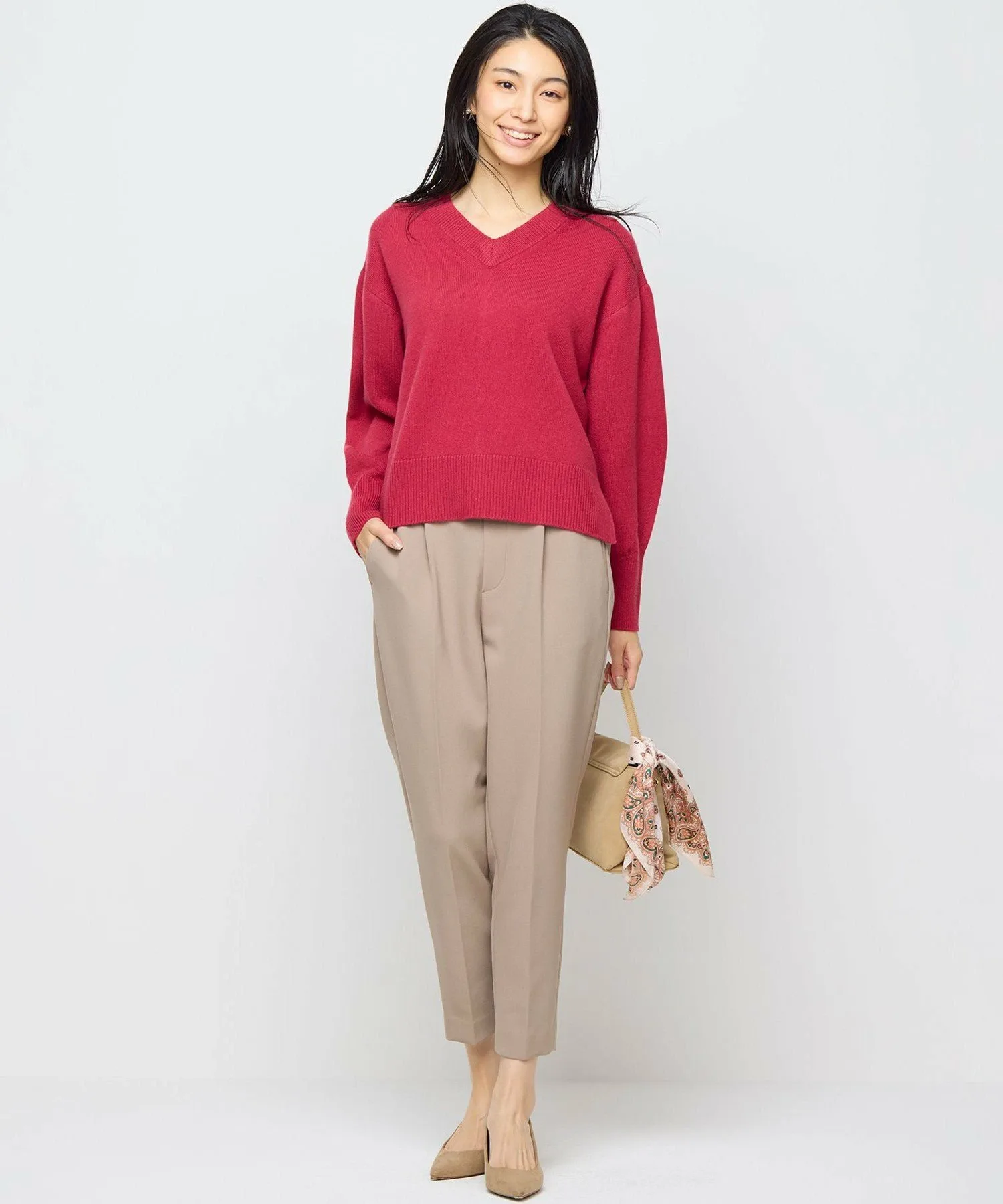 Серия «Шерсть-кашемир» \ Высококачественная смесь кашемира предлагает элегантные, красивые цвета. / Женственный V-образный вырез создает аккуратный, привлекательный образ. Дизайн: Этот женственный пуловер имеет неглубокий V-образный вырез спереди и сзади, создавая аккуратный, привлекательный образ. Рукава удобно сидят на некотором расстоянии от тела, а длинные манжеты с диагональной ребристой отделкой и глубокие боковые разрезы создают компактный, сбалансированный вид, придавая образу естественную изысканность. Задняя панель обеспечивает идеальный обзор спины, делая этот свитер простым, но эффектным. В зависимости от аксессуаров, которые вы с ним сочетаете, его можно носить как в повседневной жизни, так и на более торжественных мероприятиях. Материал: В этой смеси используется только лучший кашемир. Шерсть – это сверхтонкая шерсть, известная своей деликатной текстурой. Благодаря скручиванию двух типов пряжи достигается легкая, мягкая и пушистая текстура. Элегантные, яркие цвета, которые можно получить только с помощью высококачественной пряжи, также привлекательны.
