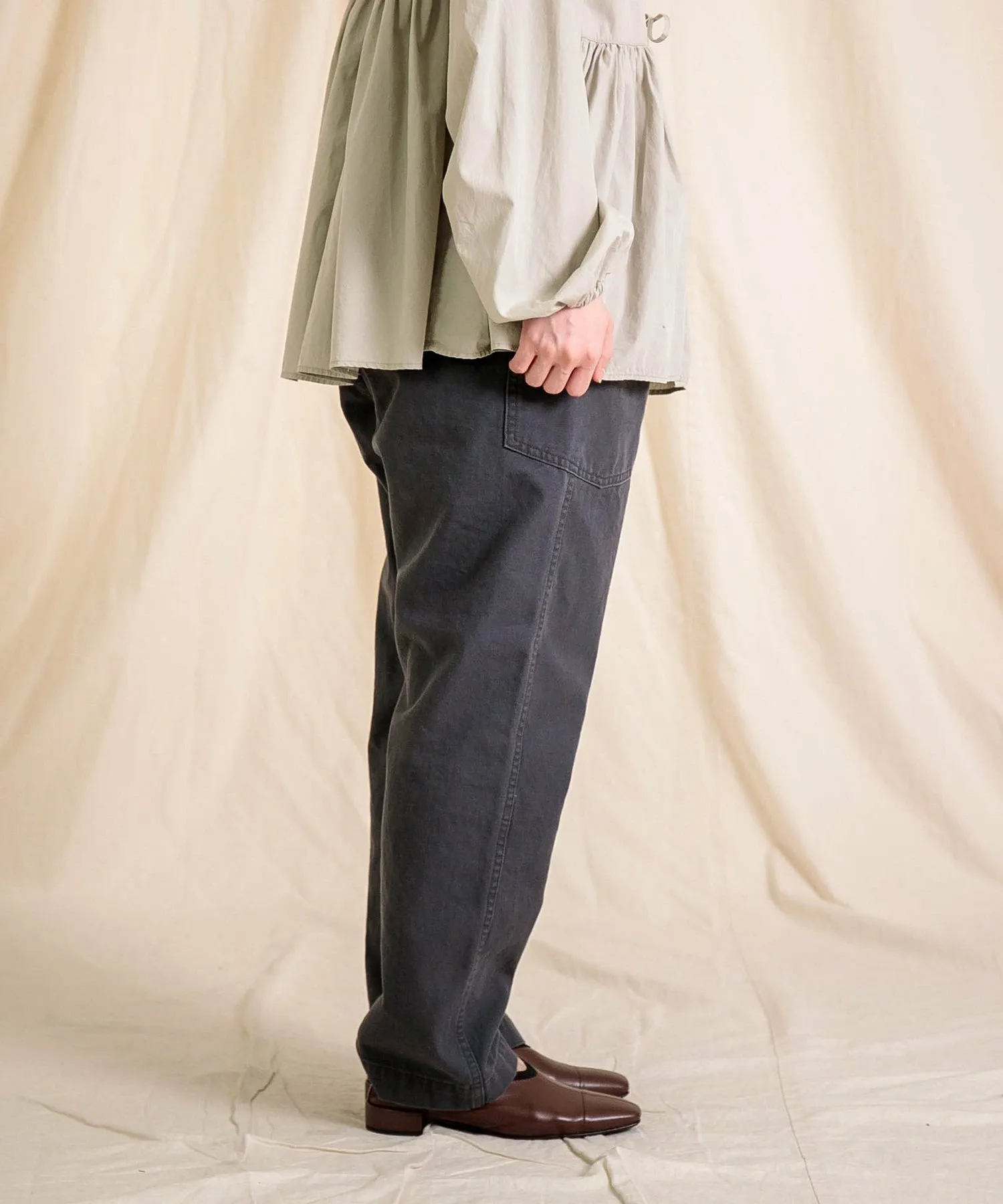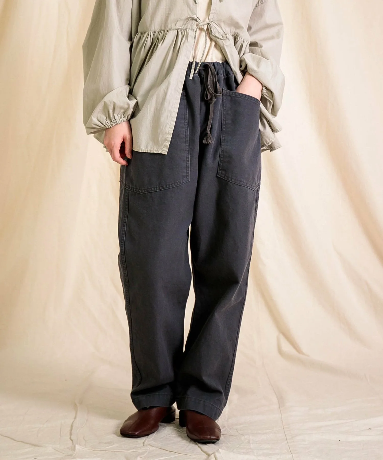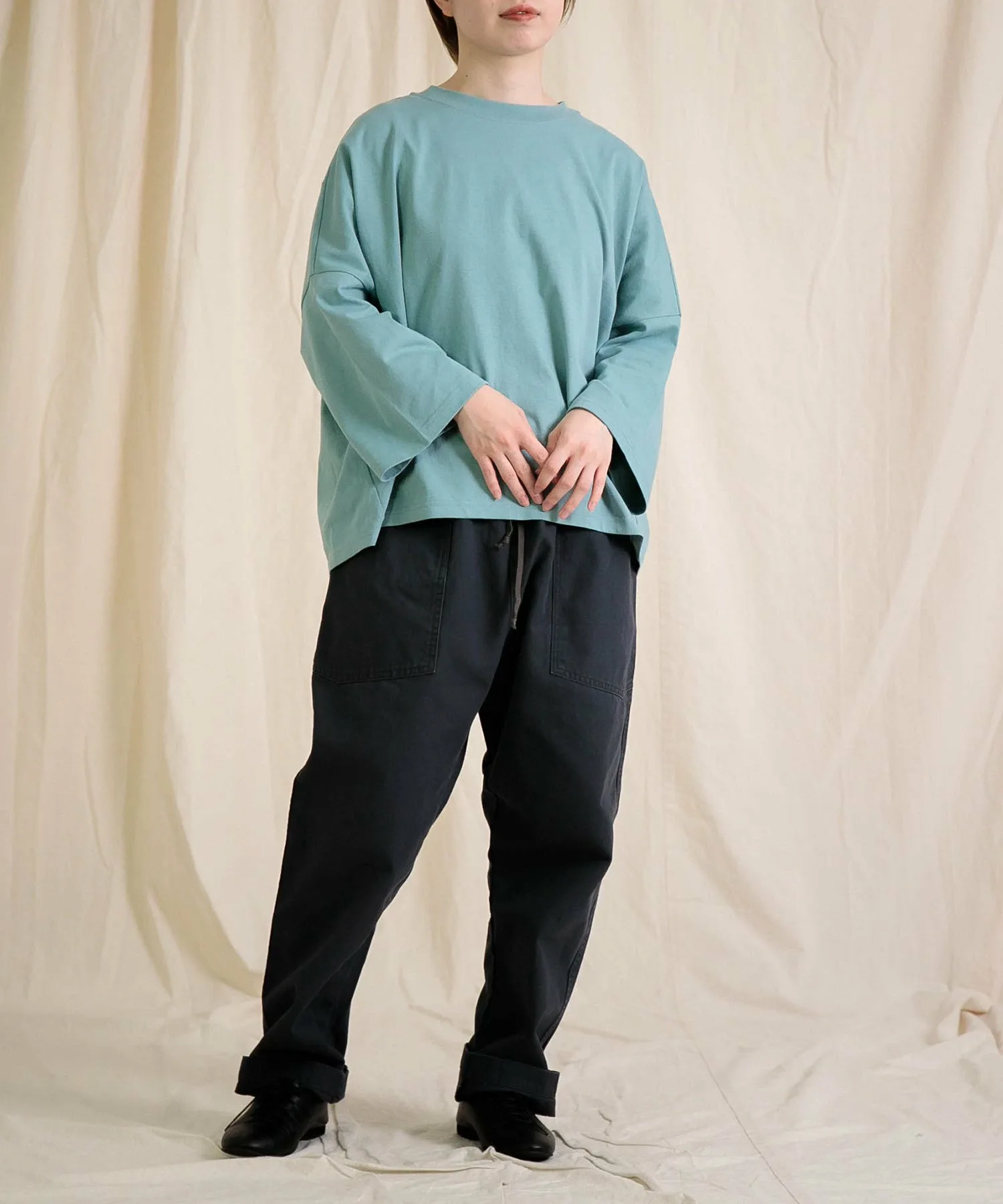 ◇ Отзыв о ношенииH155/Ношу размер 2 (свободный)Длина немного длинновата для моего роста, поэтому я рекомендую подвернуть ее. Изящный силуэт, сужающийся к низу, придает аккуратный вид.Хотя материал не толстый, он прочный, что делает его идеальным для повседневной носки.