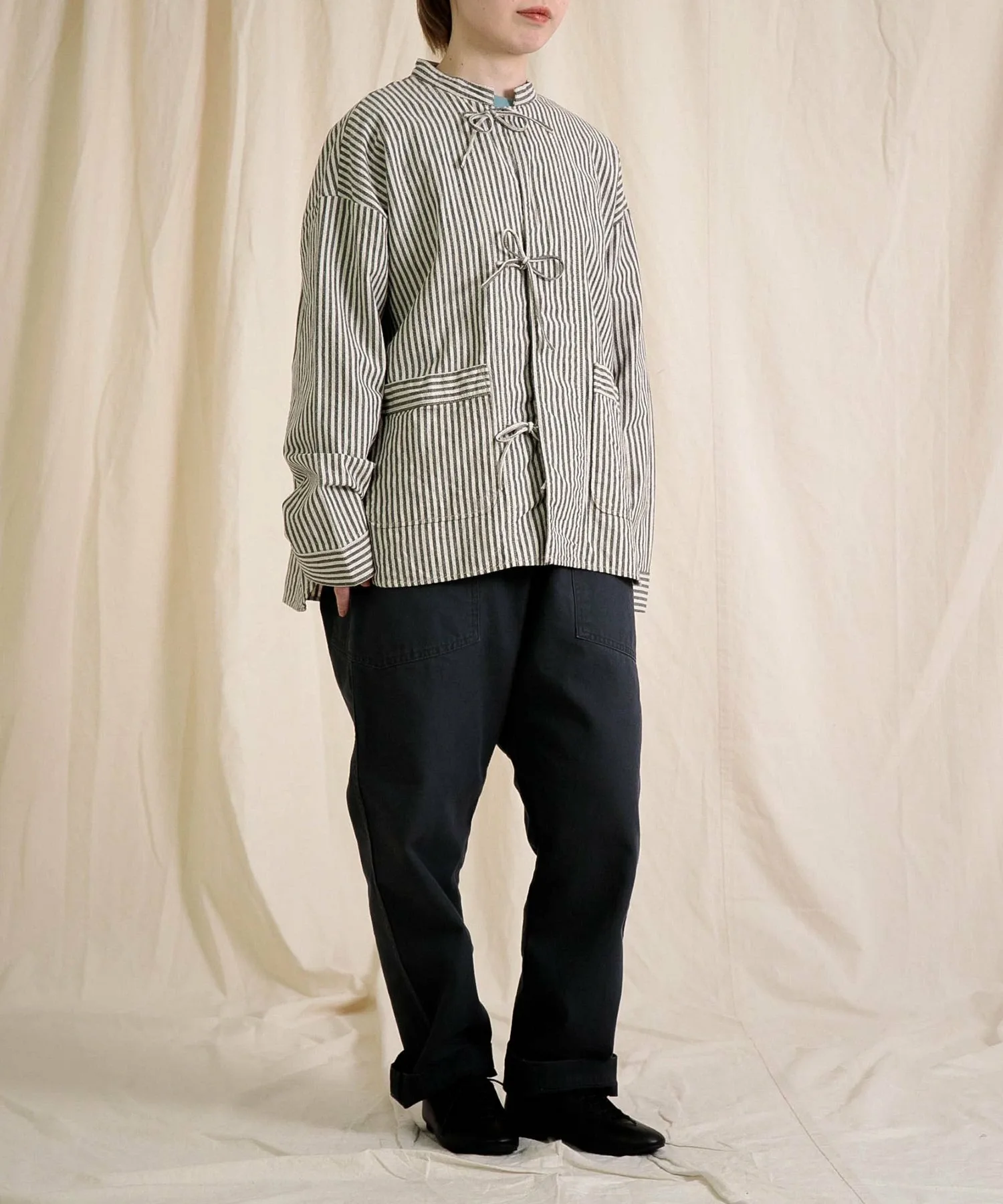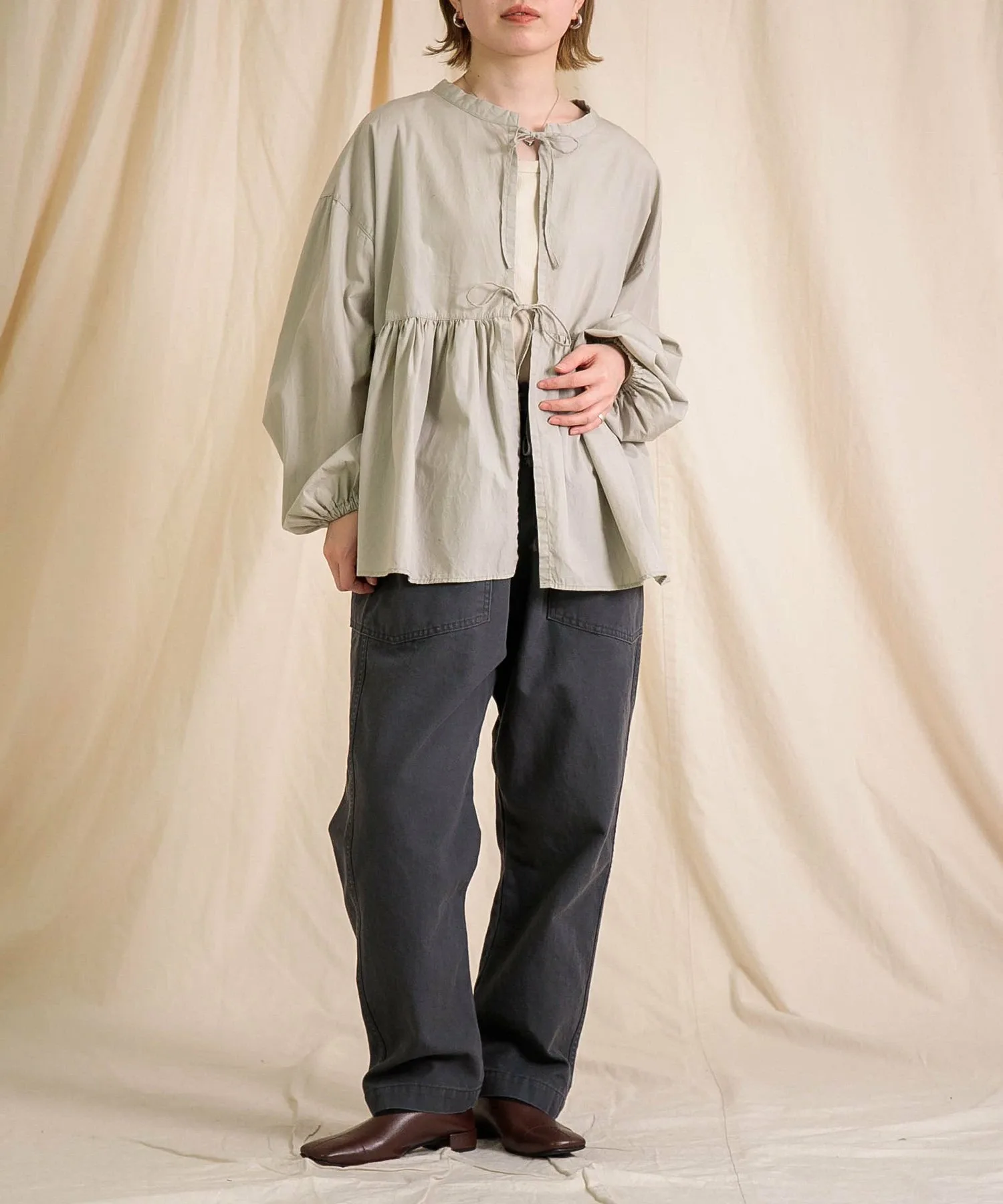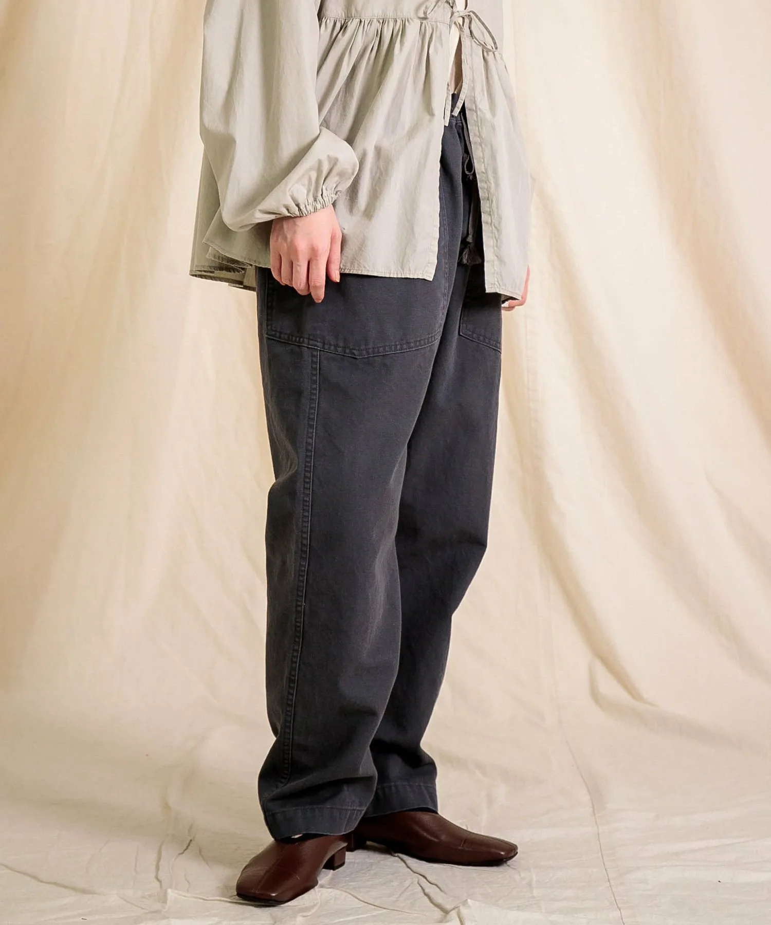 ◇ Отзыв о ношенииH155/Ношу размер 2 (свободный)Длина немного длинновата для моего роста, поэтому я рекомендую подвернуть ее. Изящный силуэт, сужающийся к низу, придает аккуратный вид.Хотя материал не толстый, он прочный, что делает его идеальным для повседневной носки.