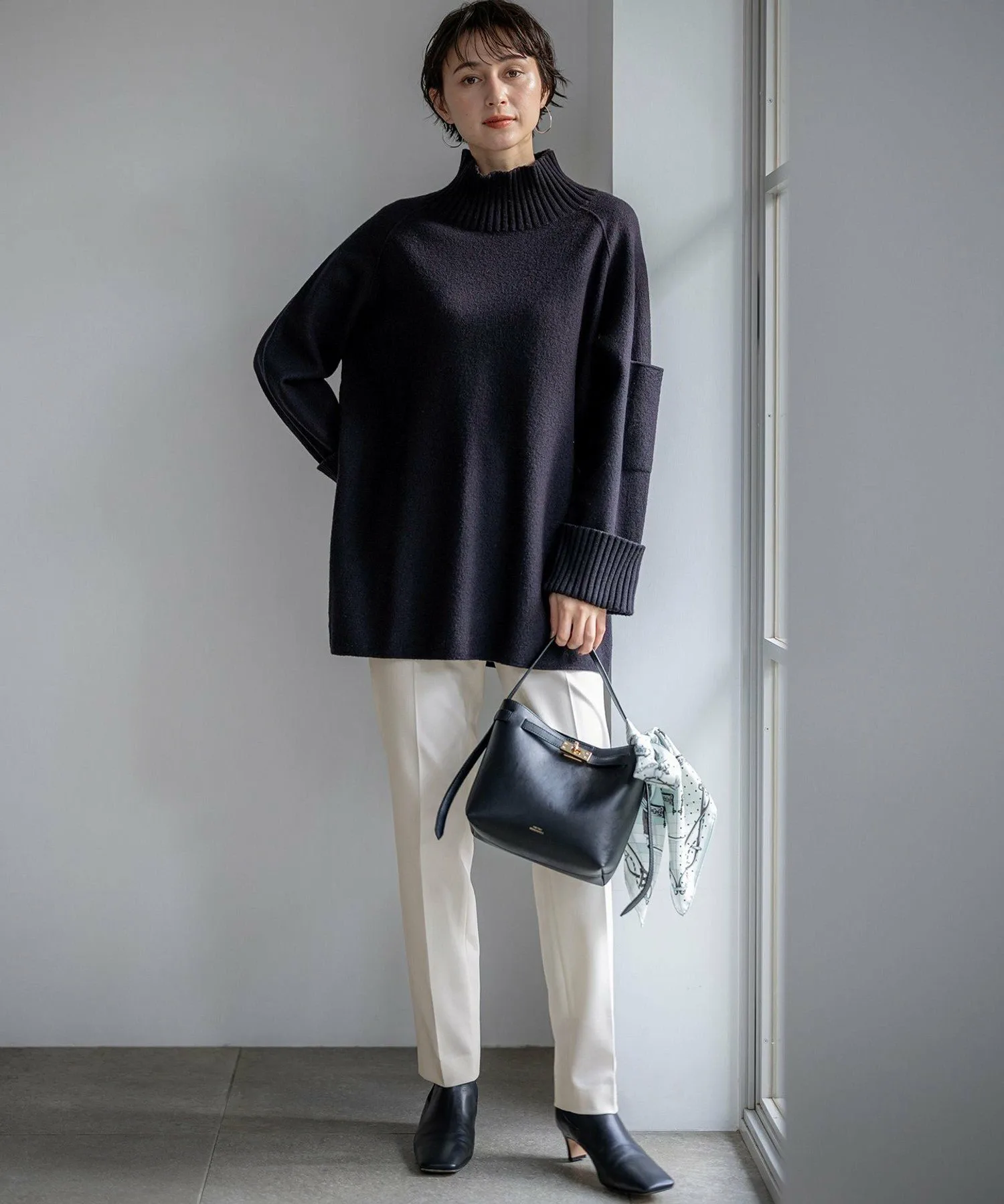 Это изделие изготовлено из высококачественной тонкой шерстяной пряжи, которая была тщательно спрессована (прокипячена) для создания гладкой, войлочной текстуры, в сочетании с толстой, пушистой объемной рубчиком. Использование тонкой шерстяной пряжи предотвращает затвердевание материала даже после прессования, сохраняя его мягкость и богатый объем, характерный для трикотажа. Он сочетает в себе комфортную эластичность с отличным сохранением тепла, обеспечивая тепло и комфорт даже в холодную погоду. Контраст между базовым материалом из вареной шерсти и выразительной объемной рубчиком подчеркивает приверженность 23ku натуральным материалам и изысканному дизайну.