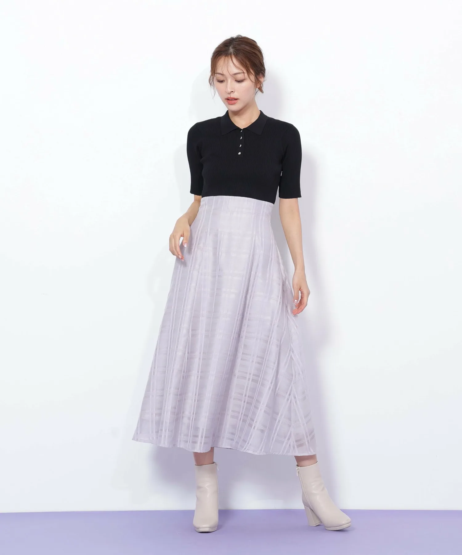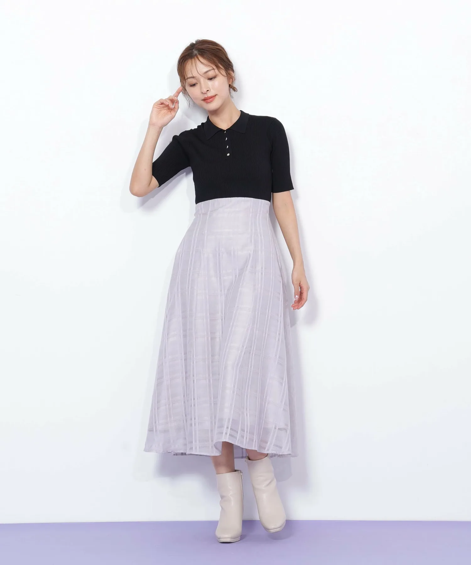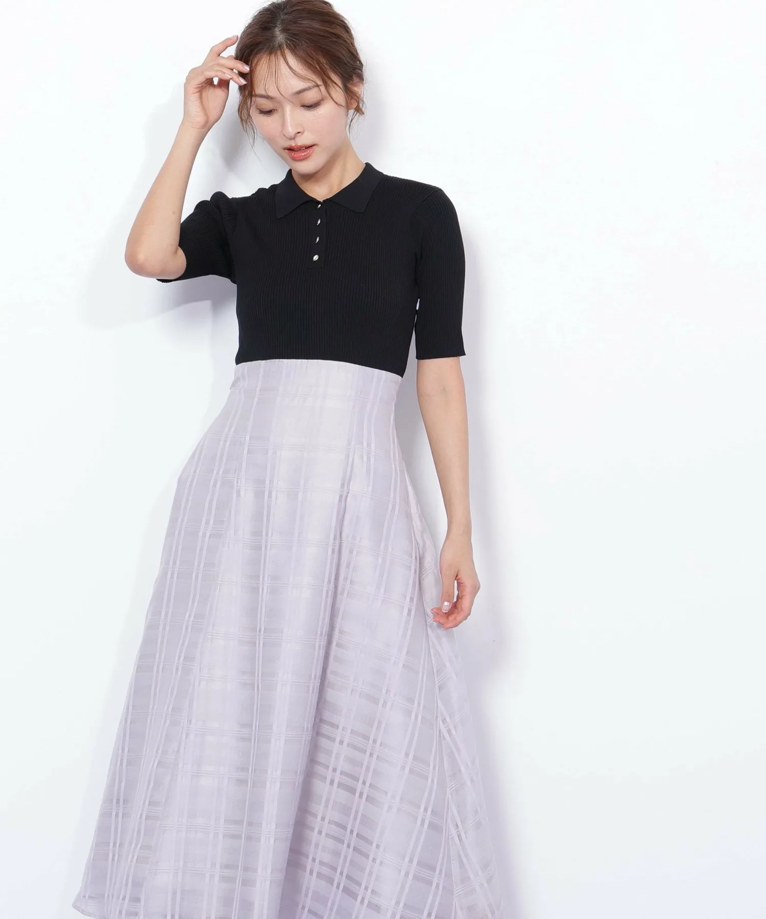 Платье-поло с оригинальным сочетанием различных материалов. Дизайн сочетает свободный воротник-поло и прозрачную клетчатую расклешенную юбку. Женственный силуэт легко колышется при каждом движении, создавая очаровательный образ. Это платье дополнит любой наряд, добавив нотку гламура. *Цвет может выглядеть по-разному в зависимости от условий освещения во время фотосъемки.
