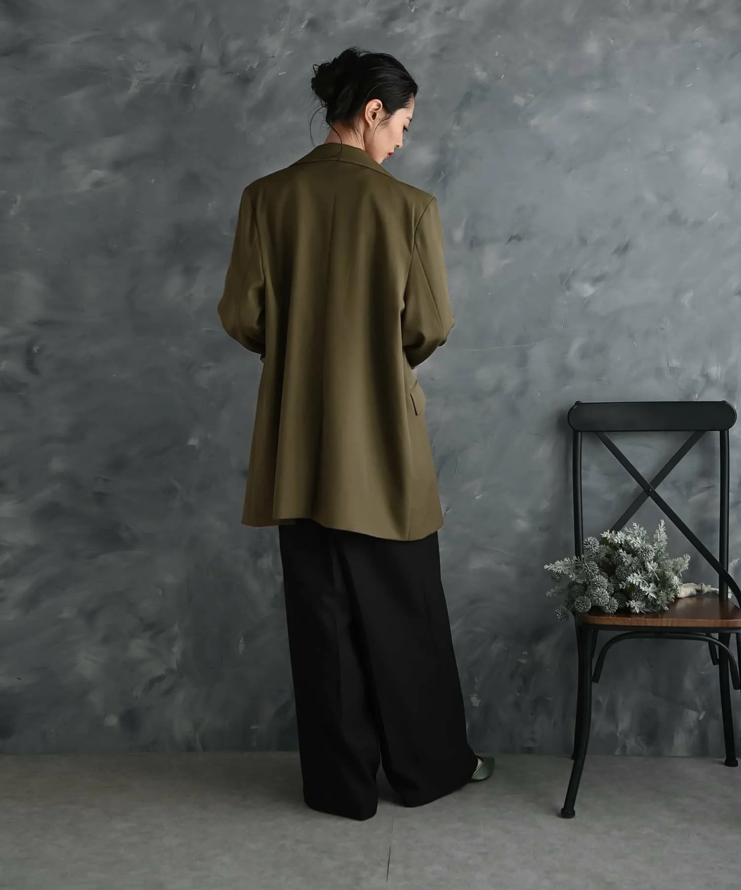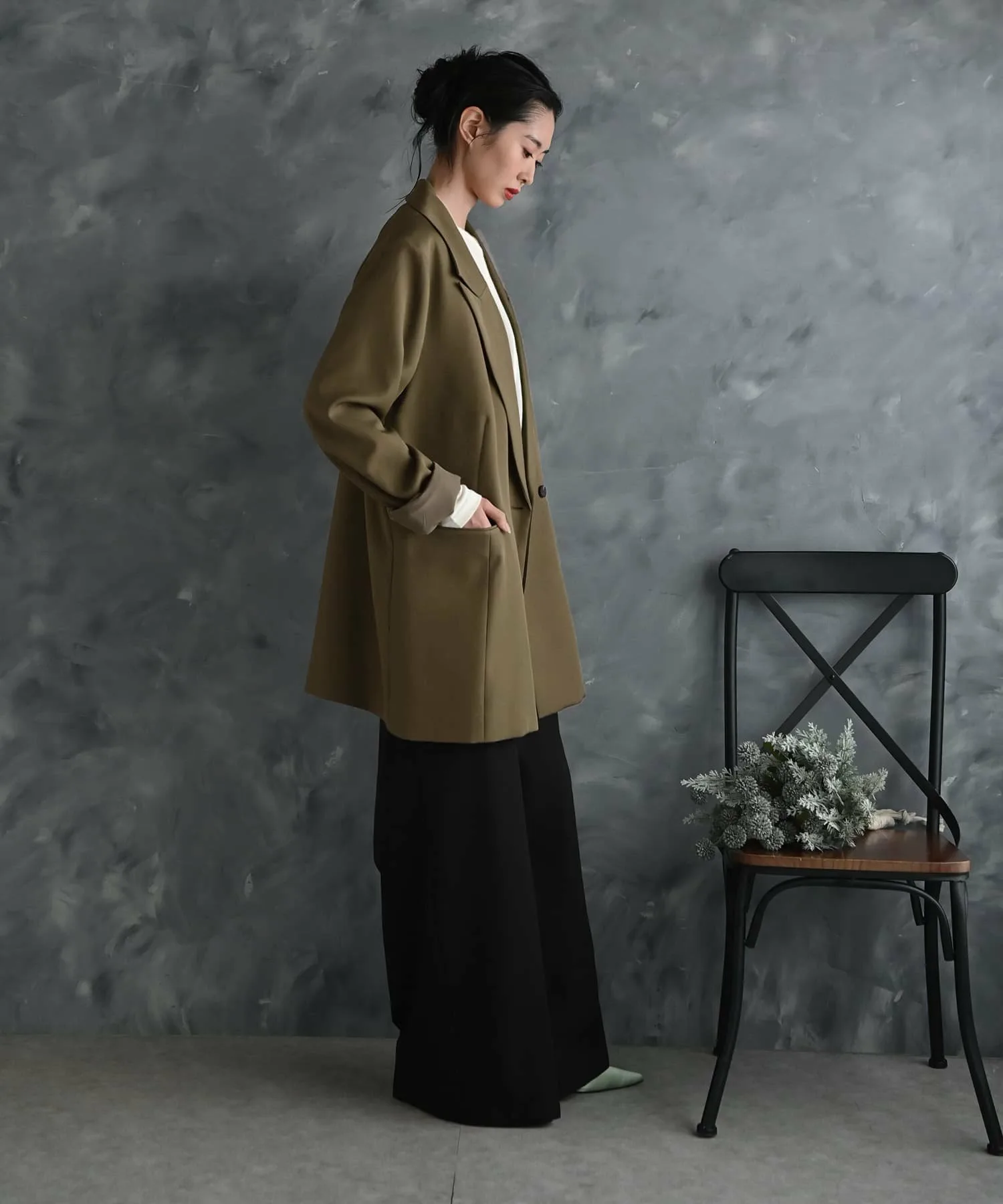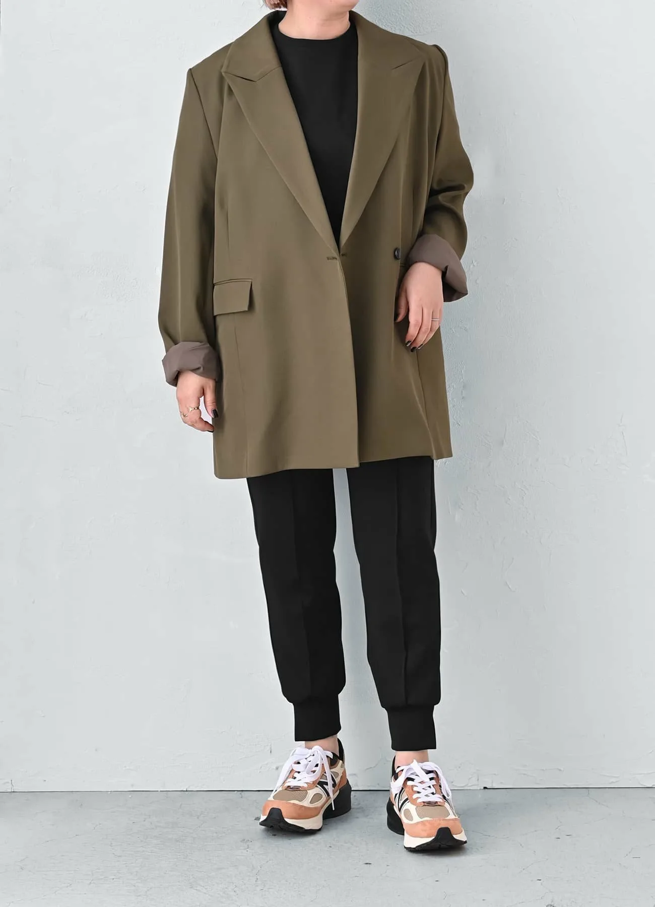 Пиджак приталенного кроя со свободным силуэтом, просторный по всей длине, включая плечи, рукава и ширину.