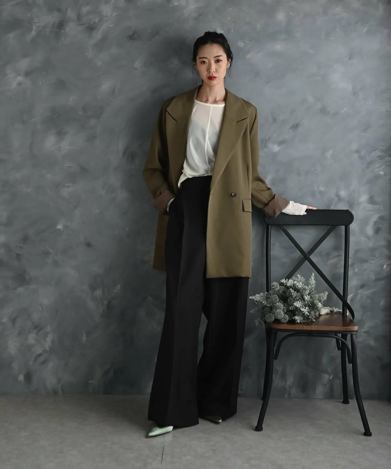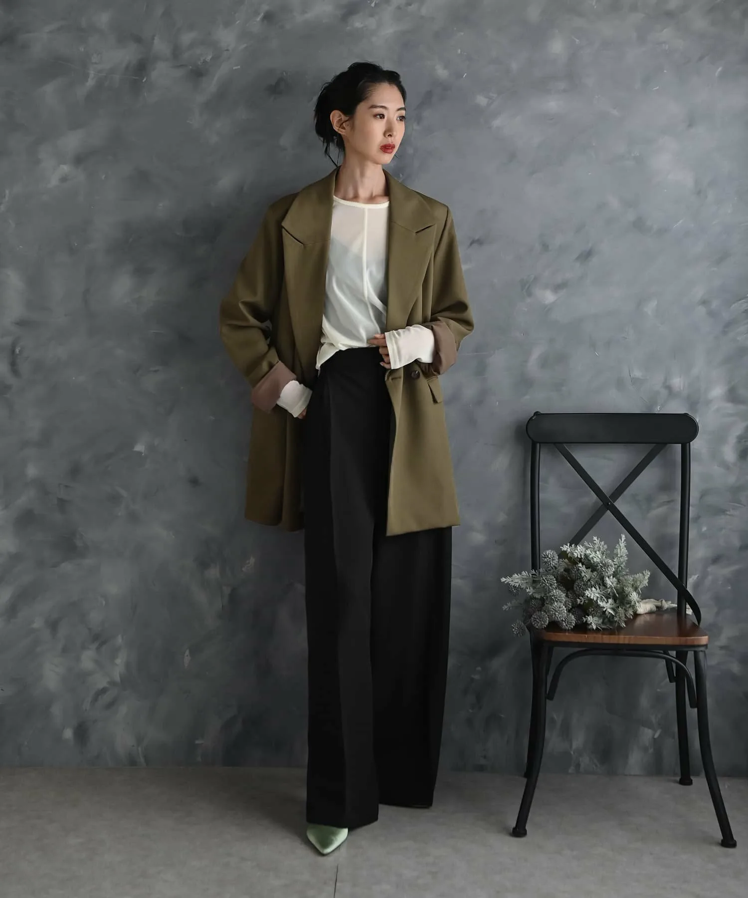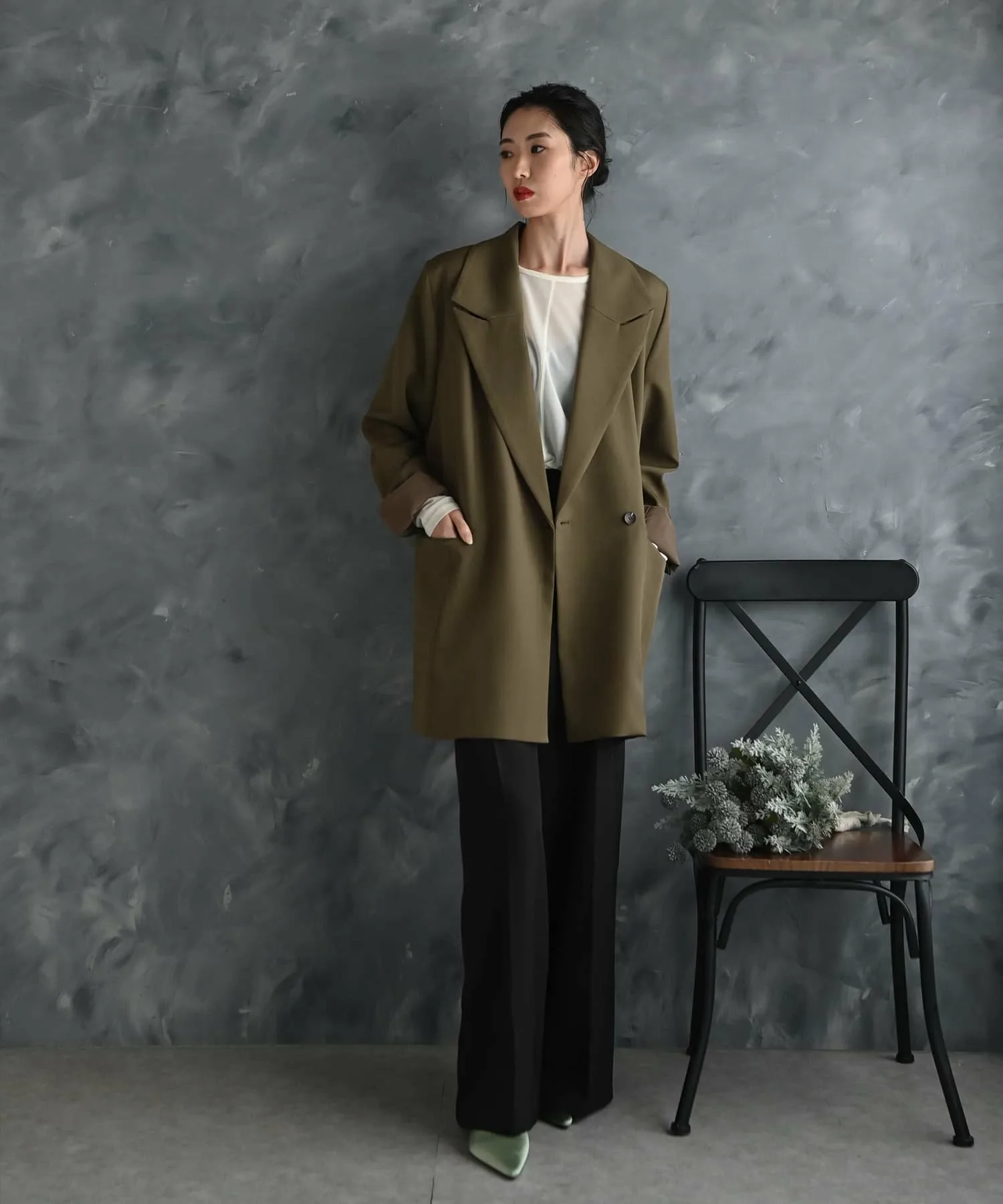 Пиджак приталенного кроя со свободным силуэтом, просторный по всей длине, включая плечи, рукава и ширину.