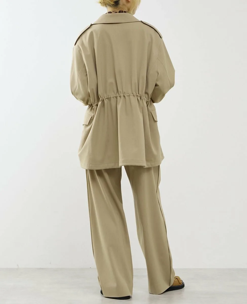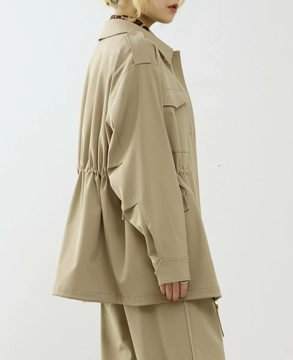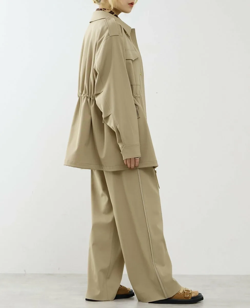 Силуэт можно регулировать с помощью застежек на талии и подоле, что позволяет свободно менять образ.
