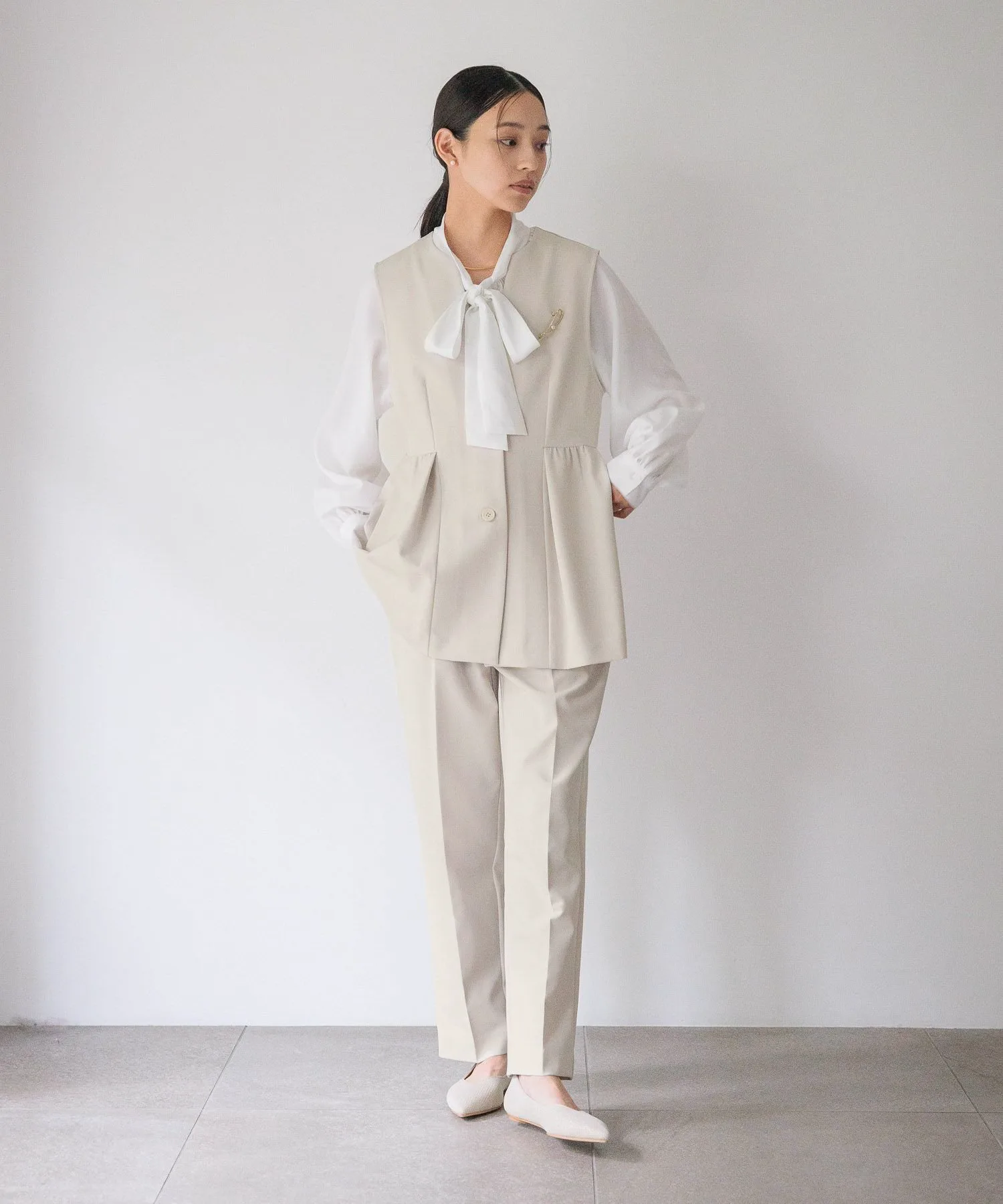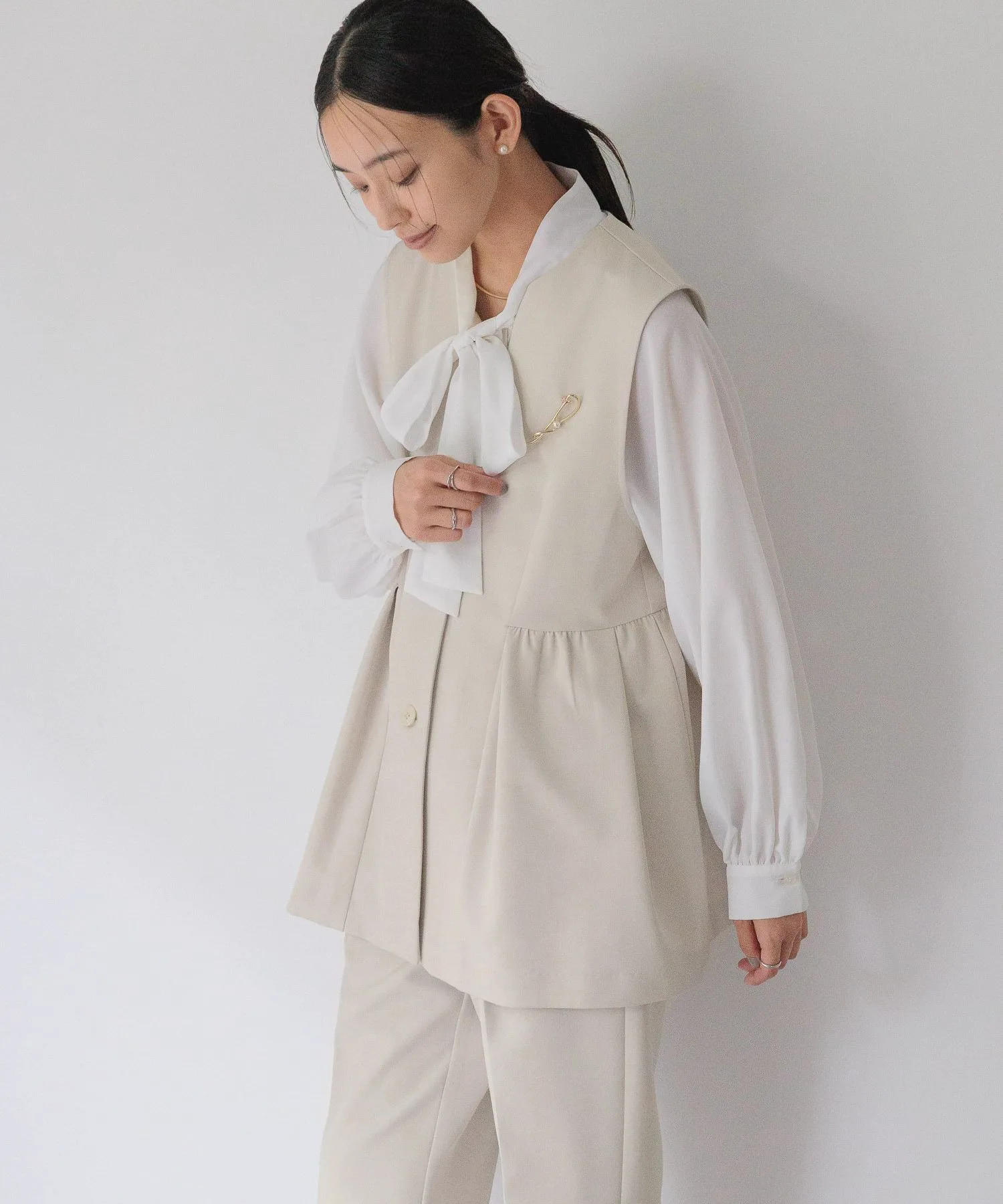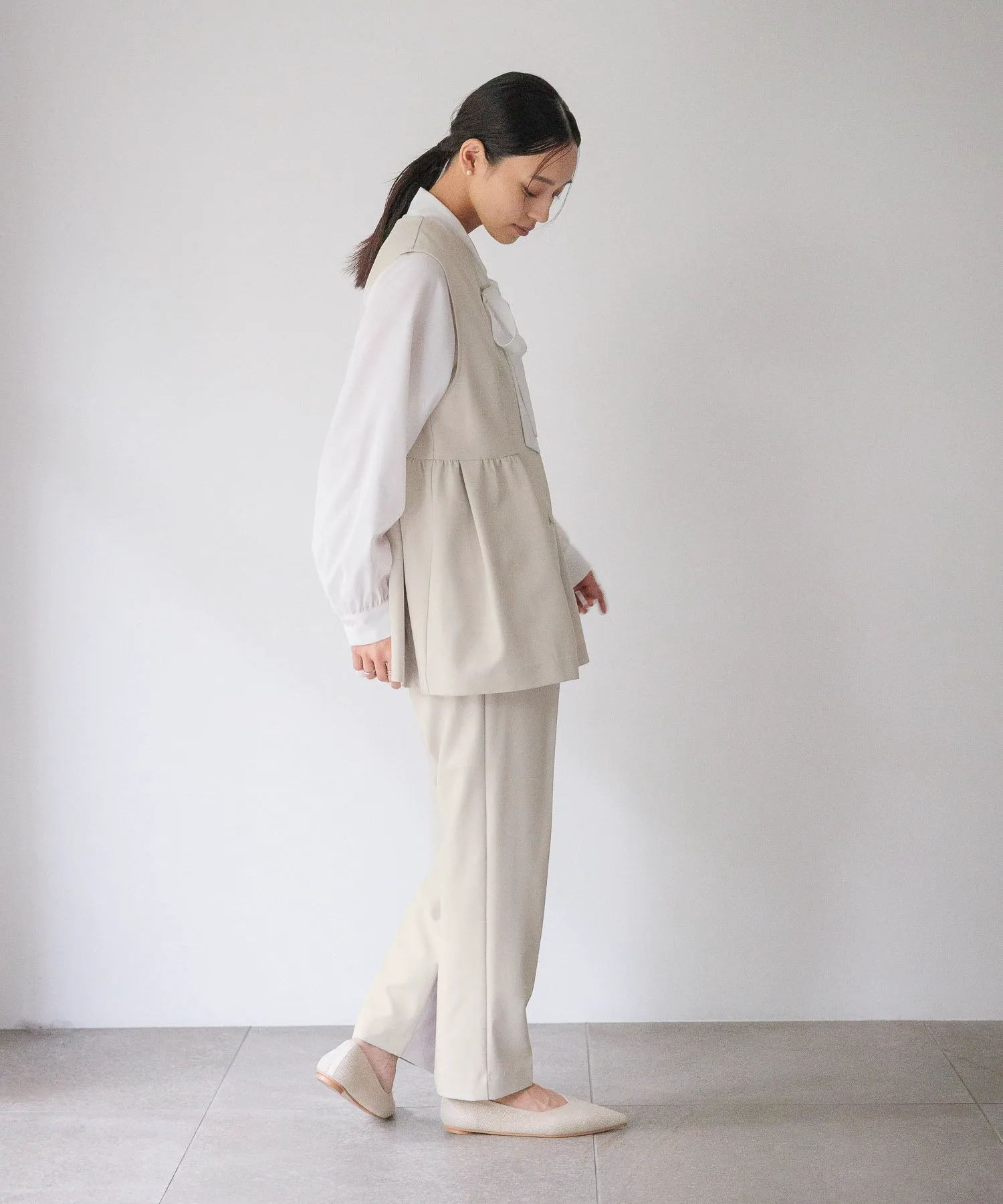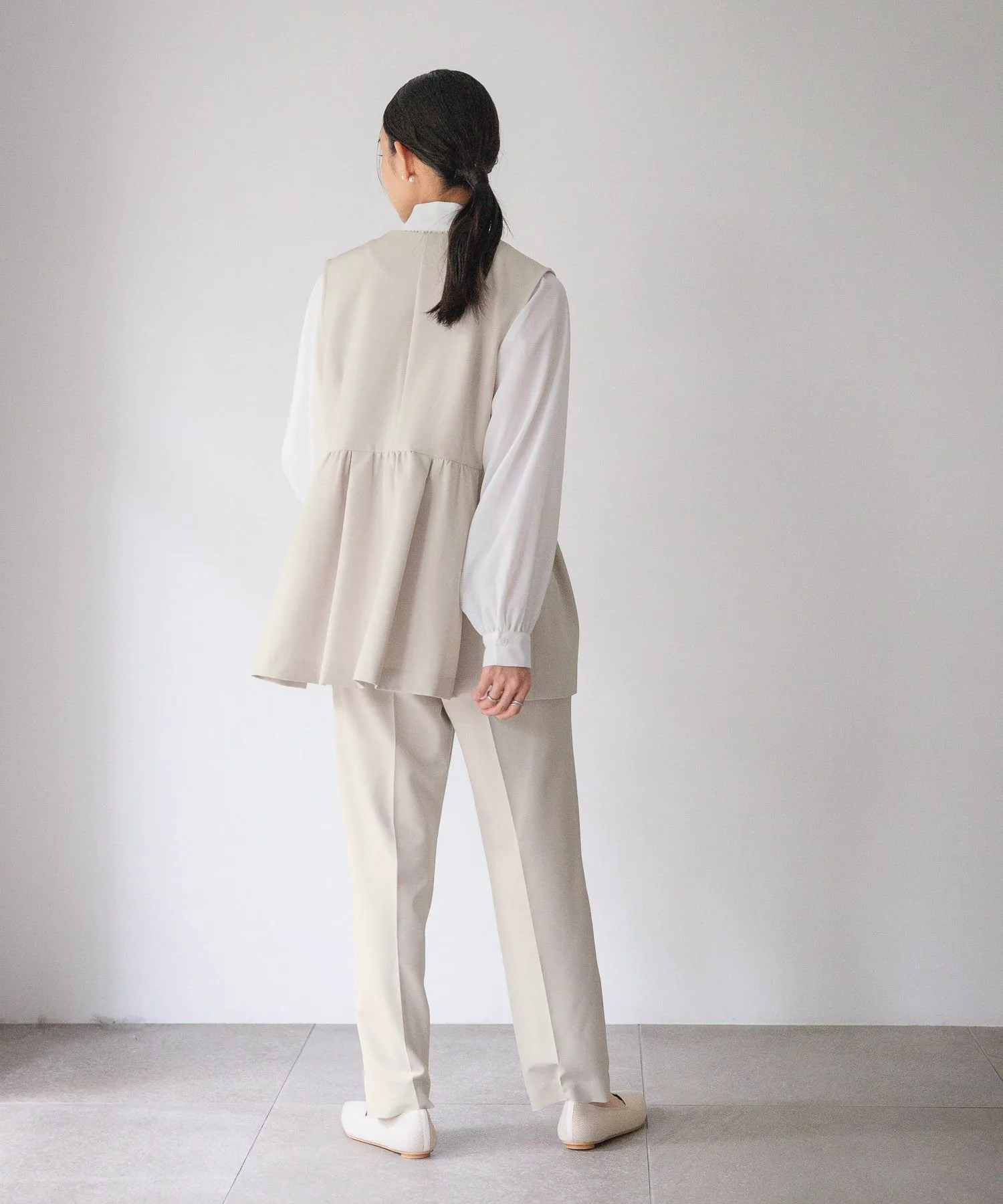 Этот жилет имеет элегантный силуэт с баской благодаря расклешенным складкам ниже талии.