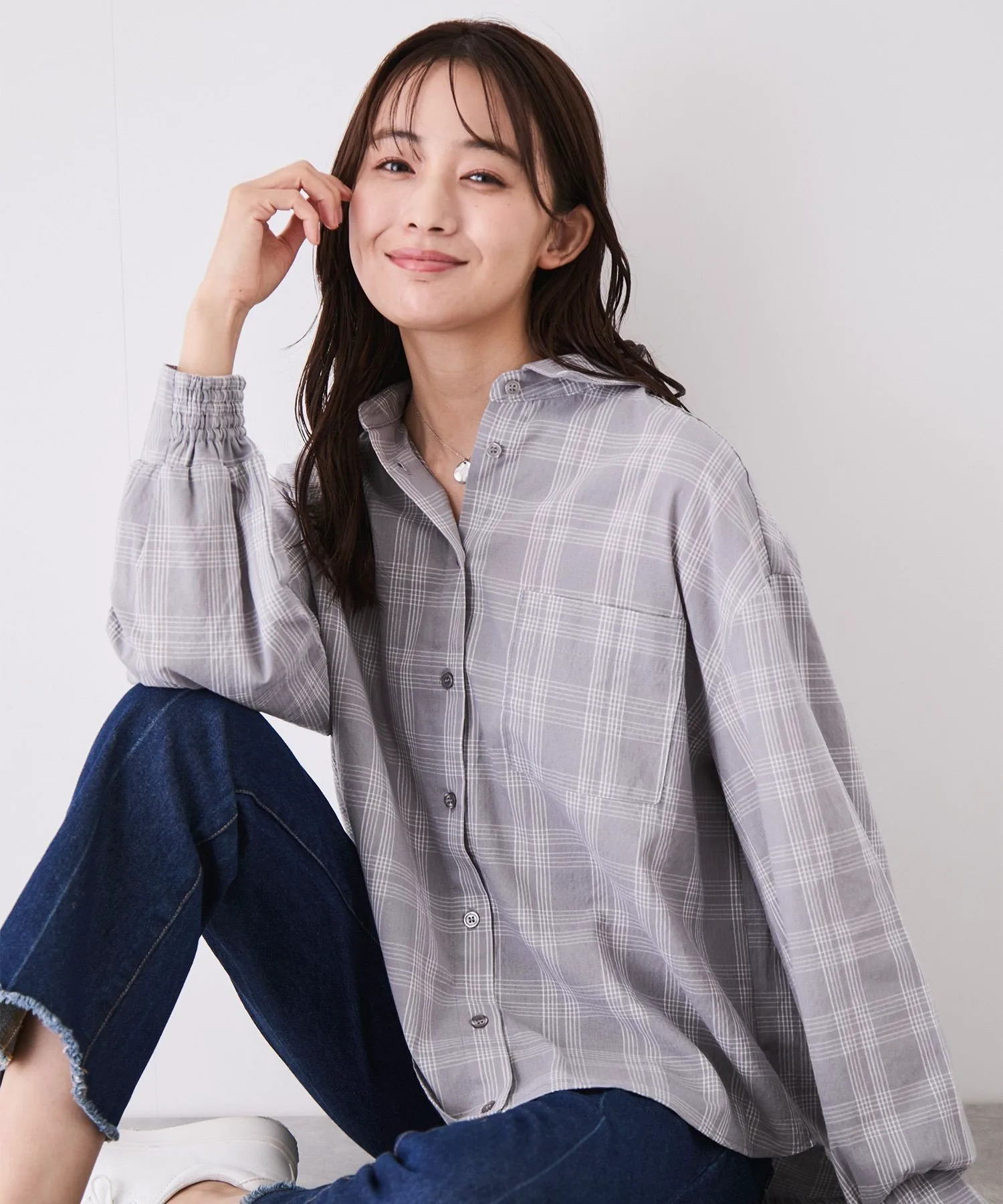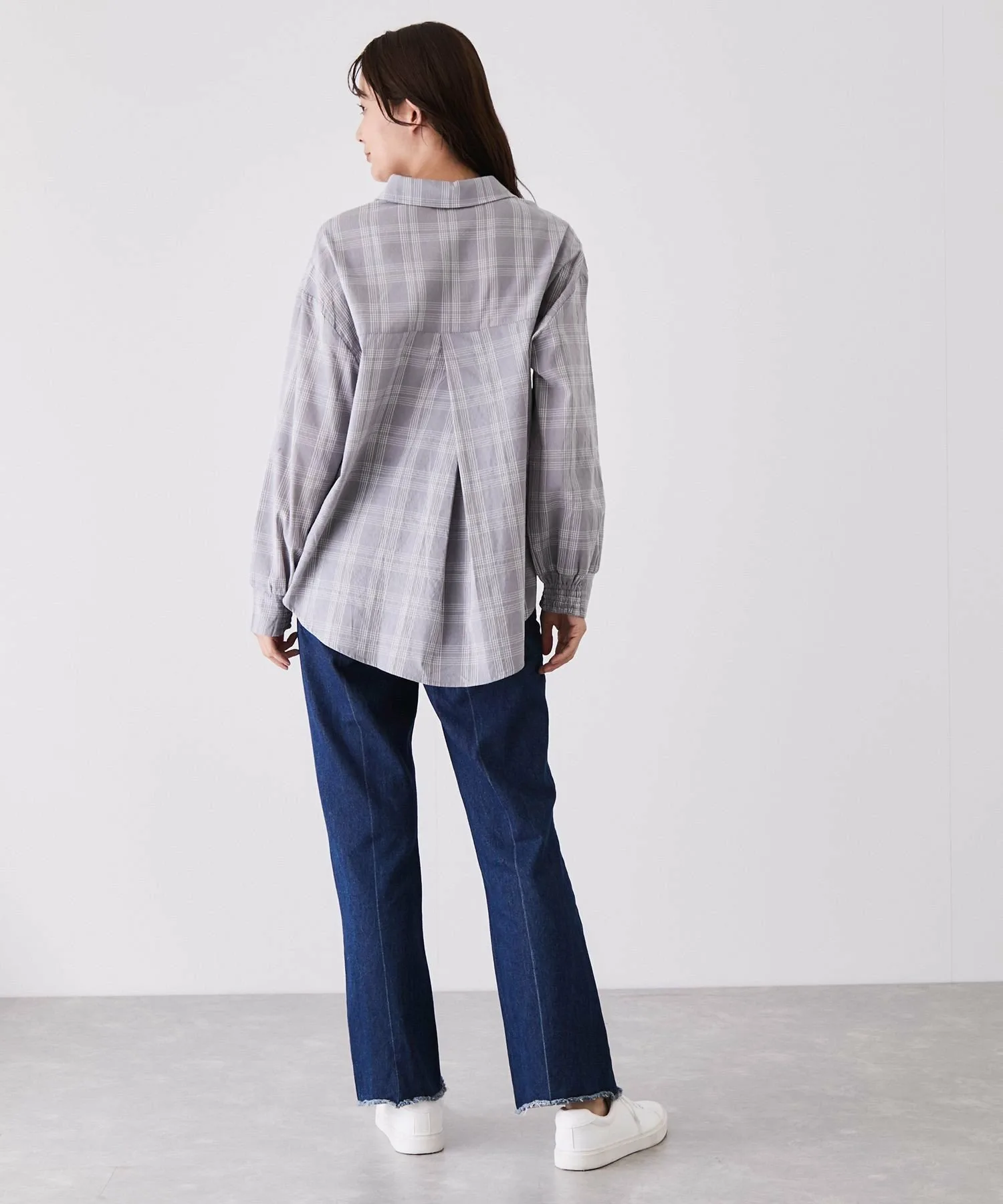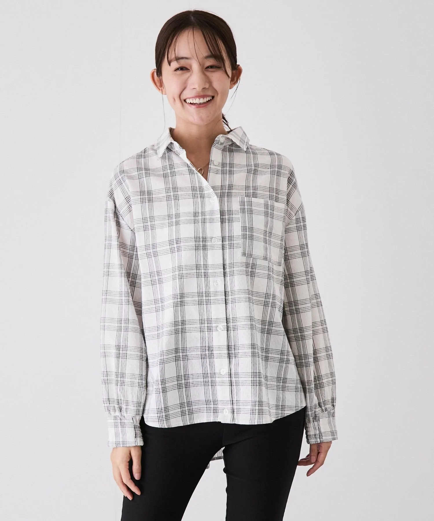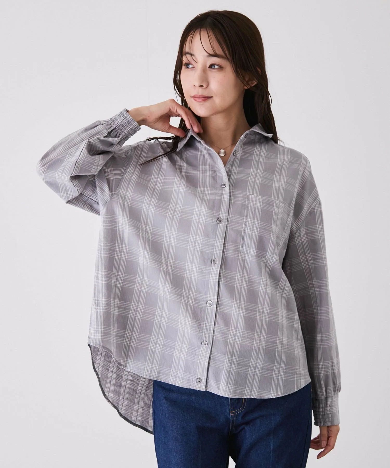 - Рубашка, сочетающая в себе повседневный клетчатый узор с женственными деталями, такими как двусторонний дизайн и присборенные манжеты.