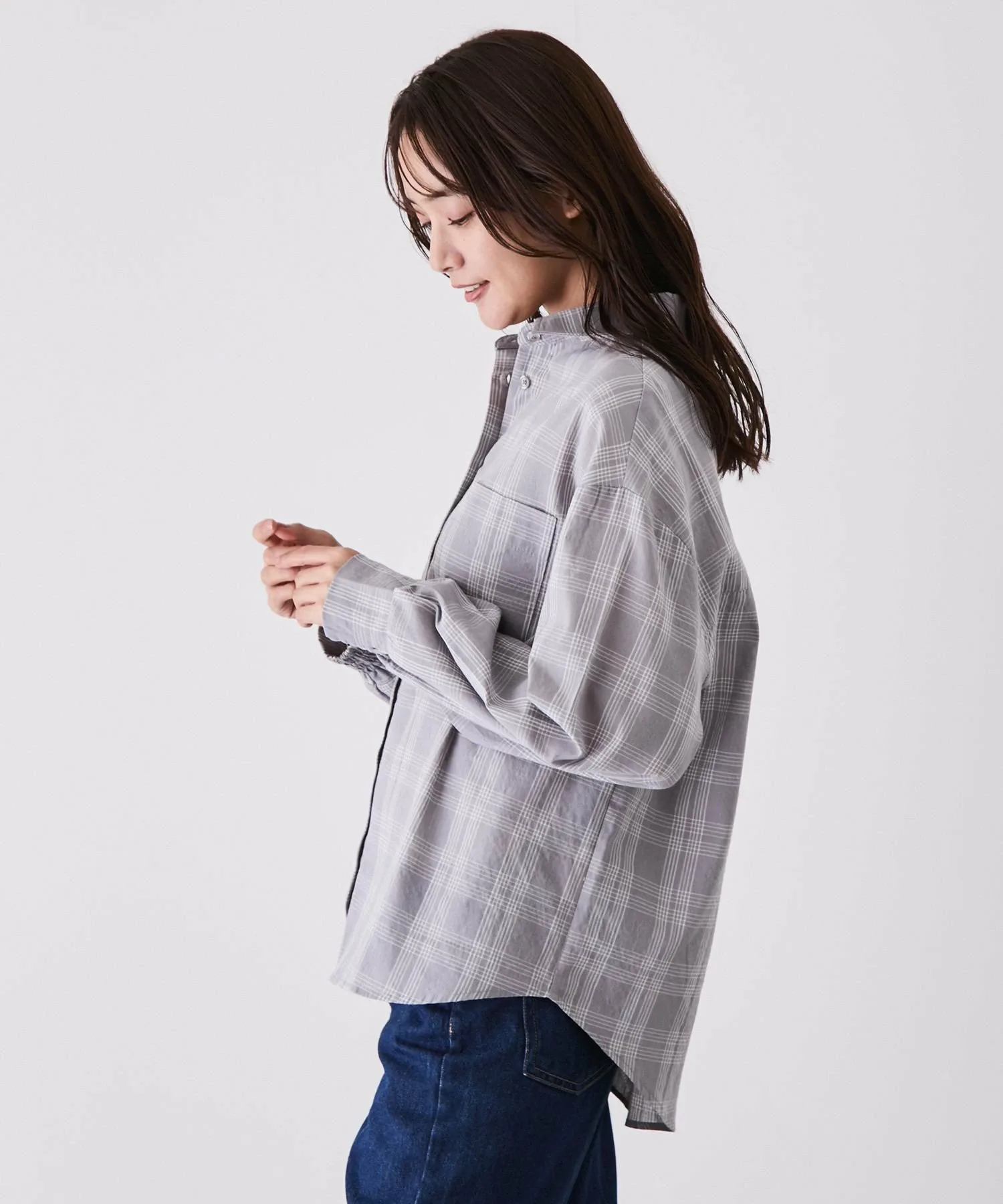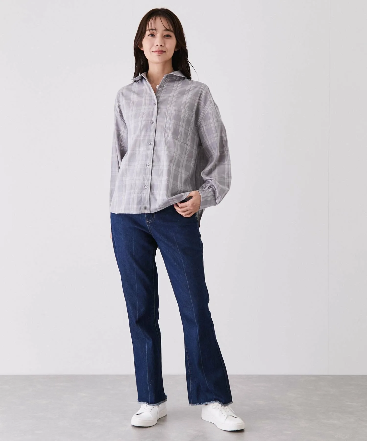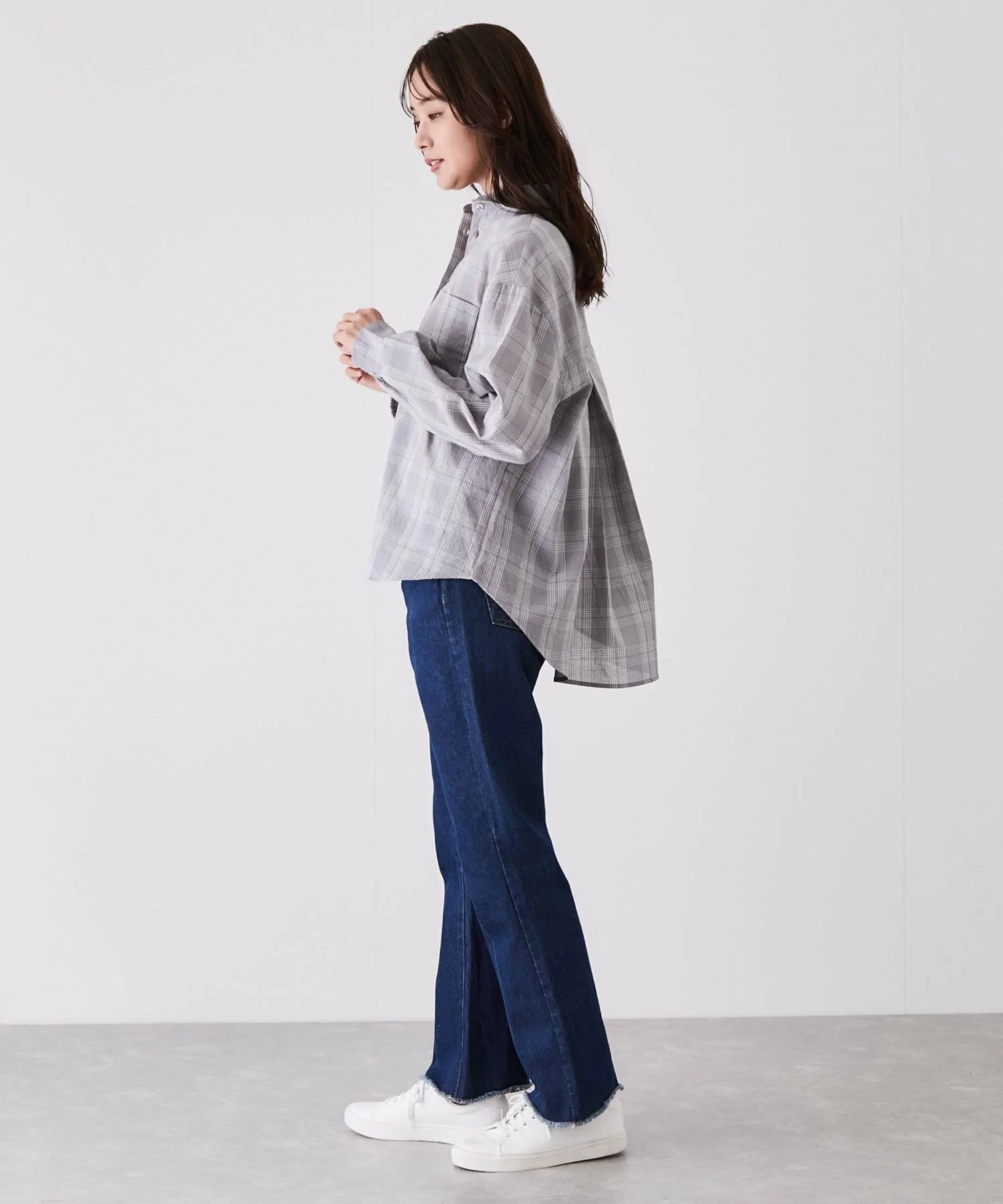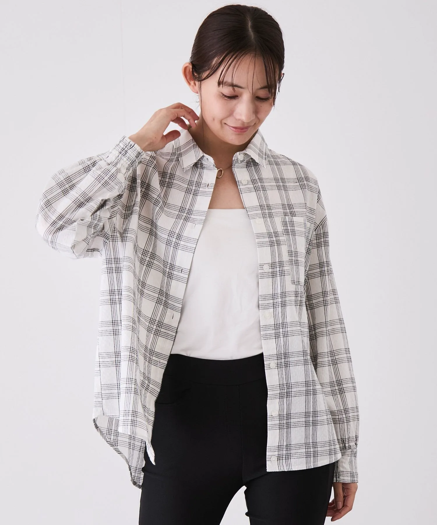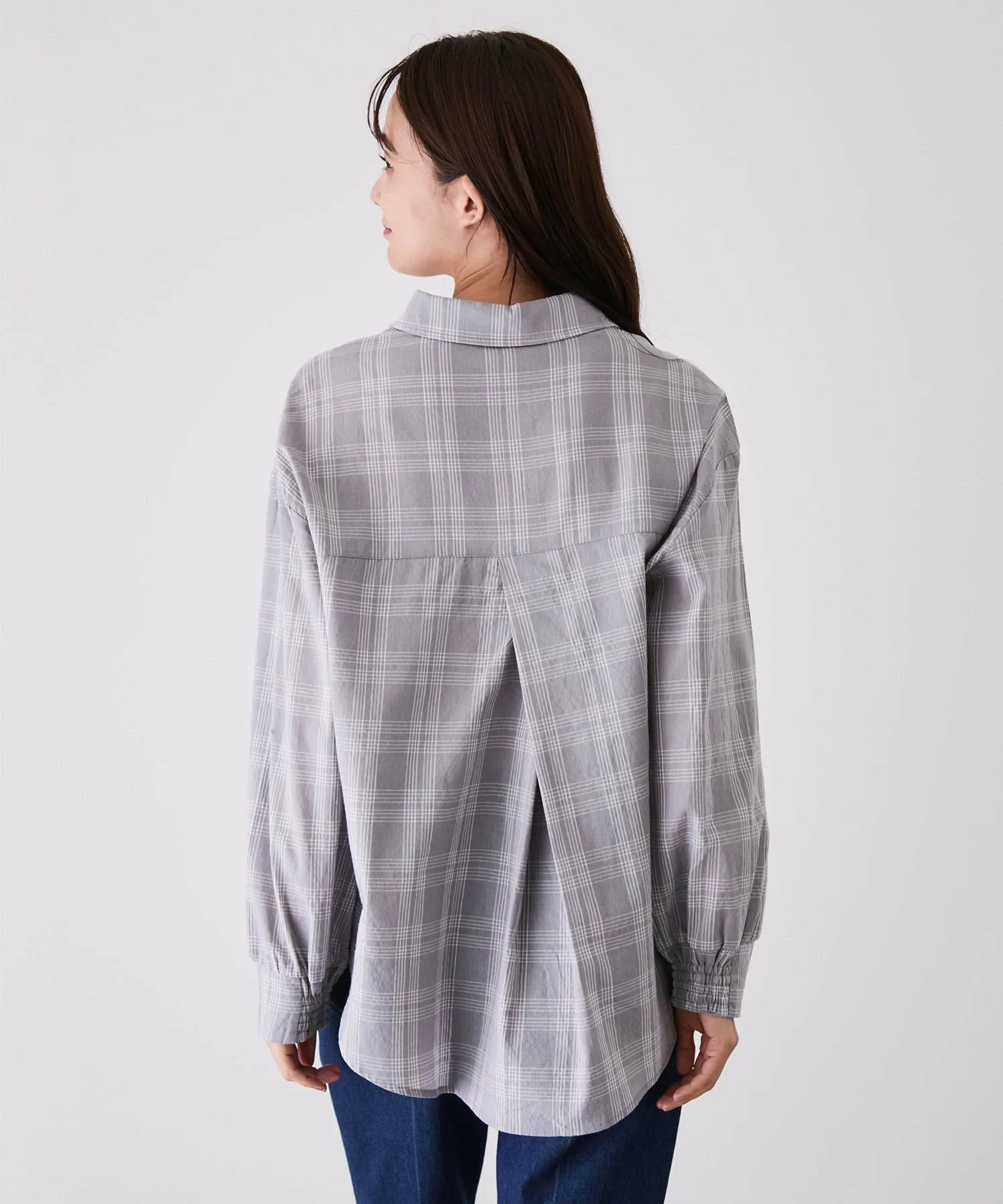 - Рубашка, сочетающая в себе повседневный клетчатый узор с женственными деталями, такими как двусторонний дизайн и присборенные манжеты.