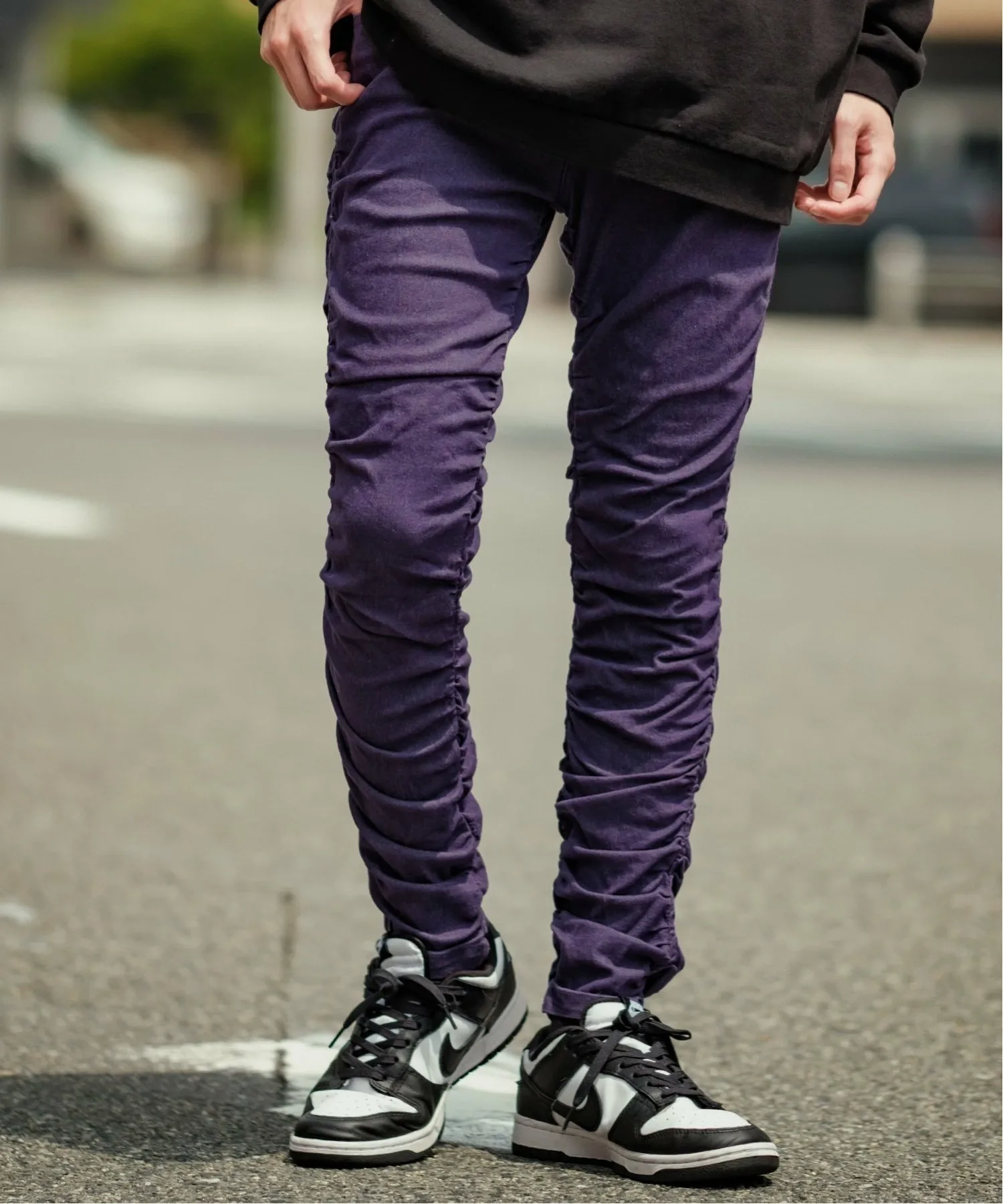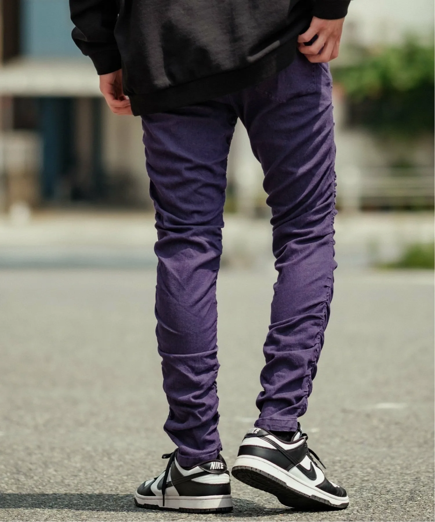 Узкий силуэт и объемные, мятые боковые сборки делают эти цветные джинсы особенно привлекательными.