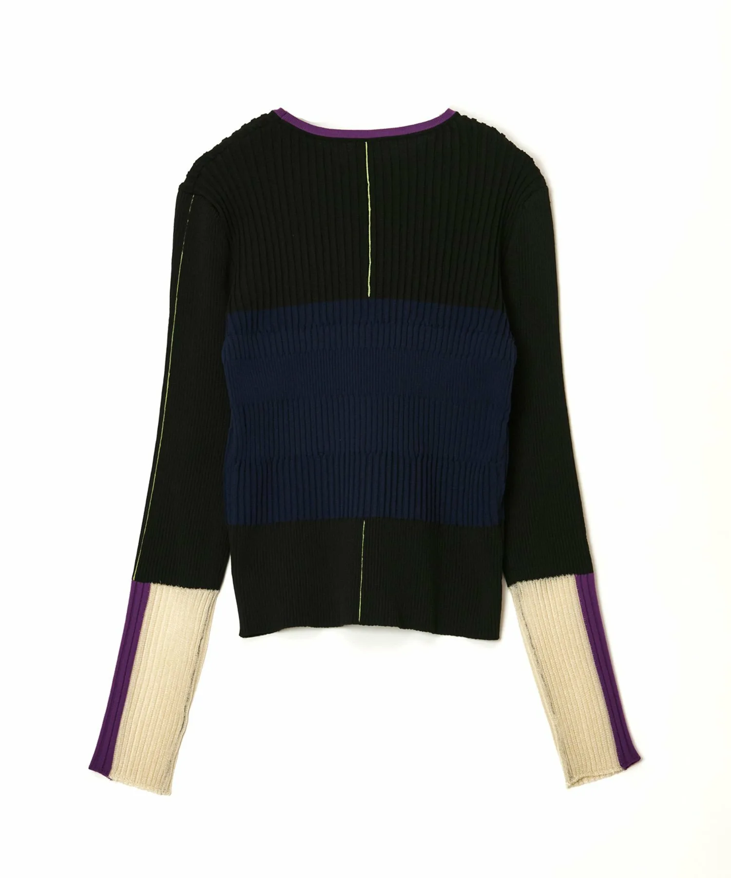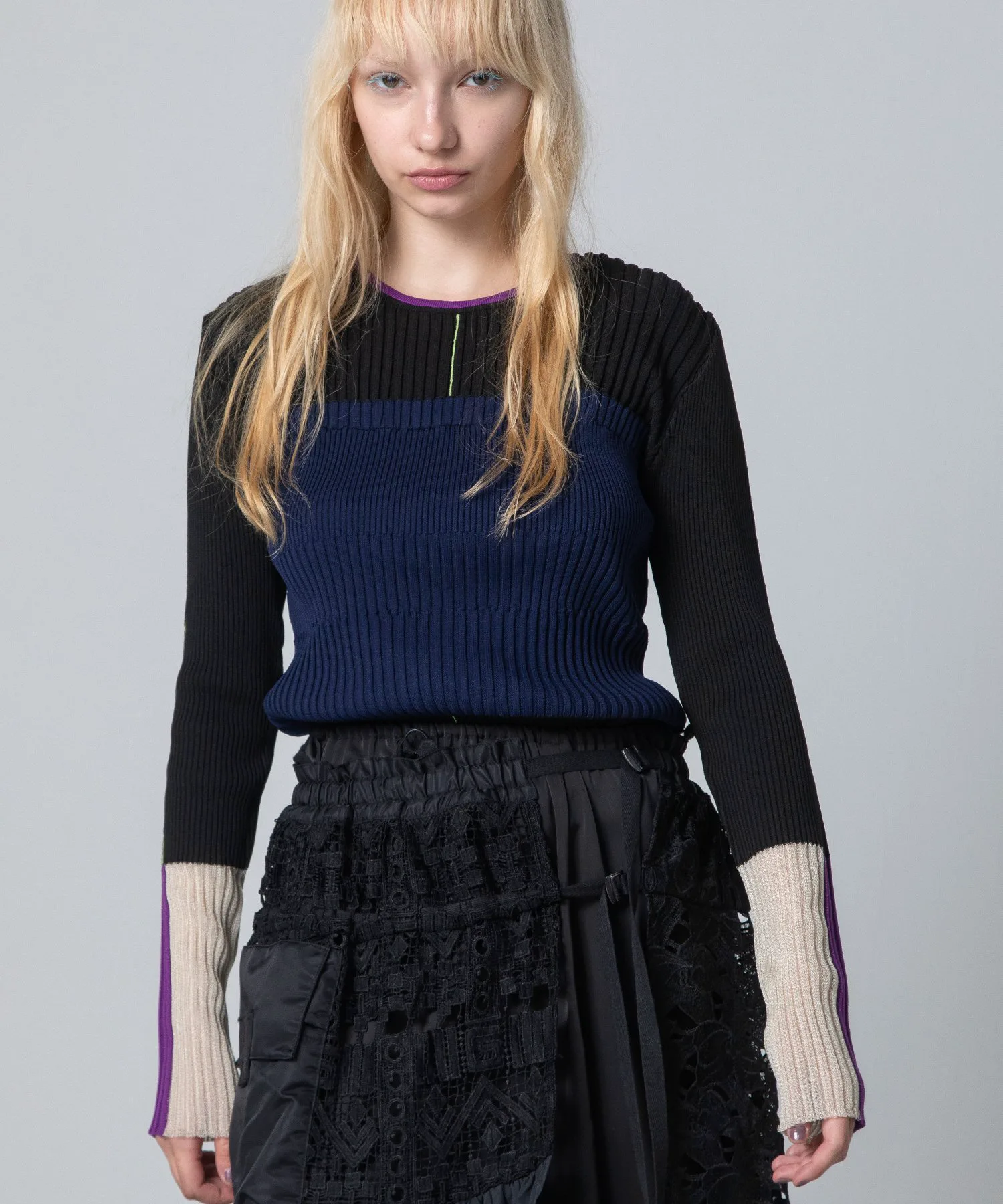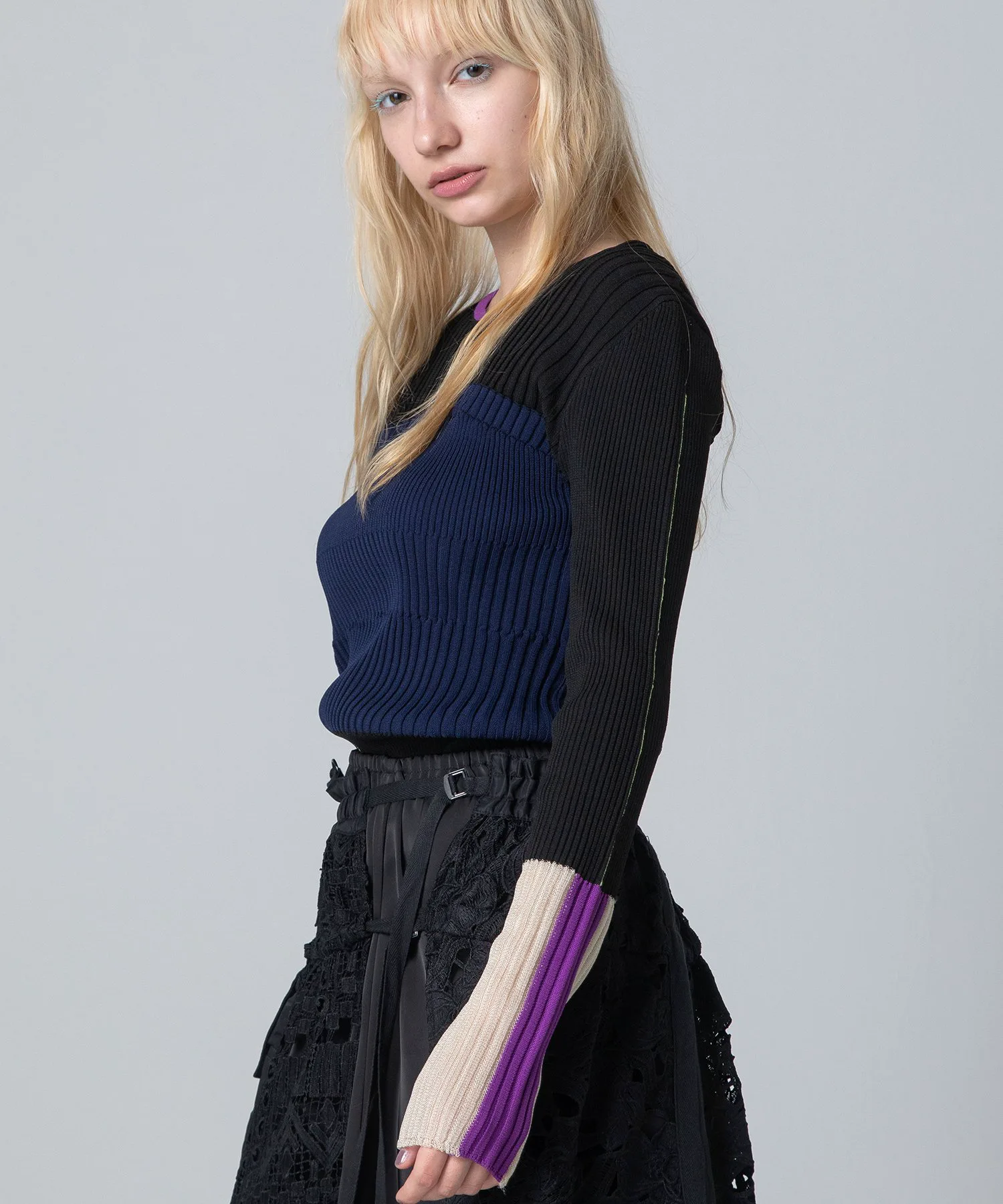 имеет спортивный вид. Манжеты выполнены из прозрачной пряжи для создания эффекта полупрозрачности, а вырез горловины выполнен в цветовом блоке. Тонкая линия в тон добавлена по центру передней и задней части для акцента.