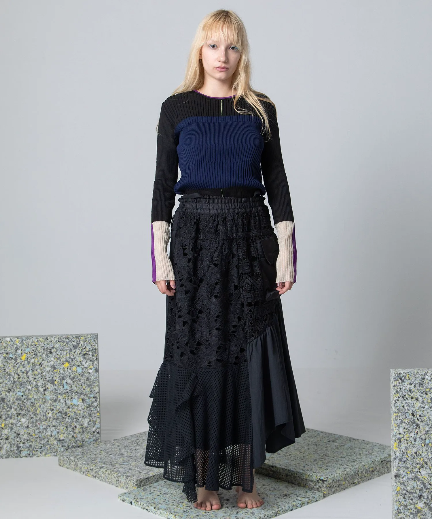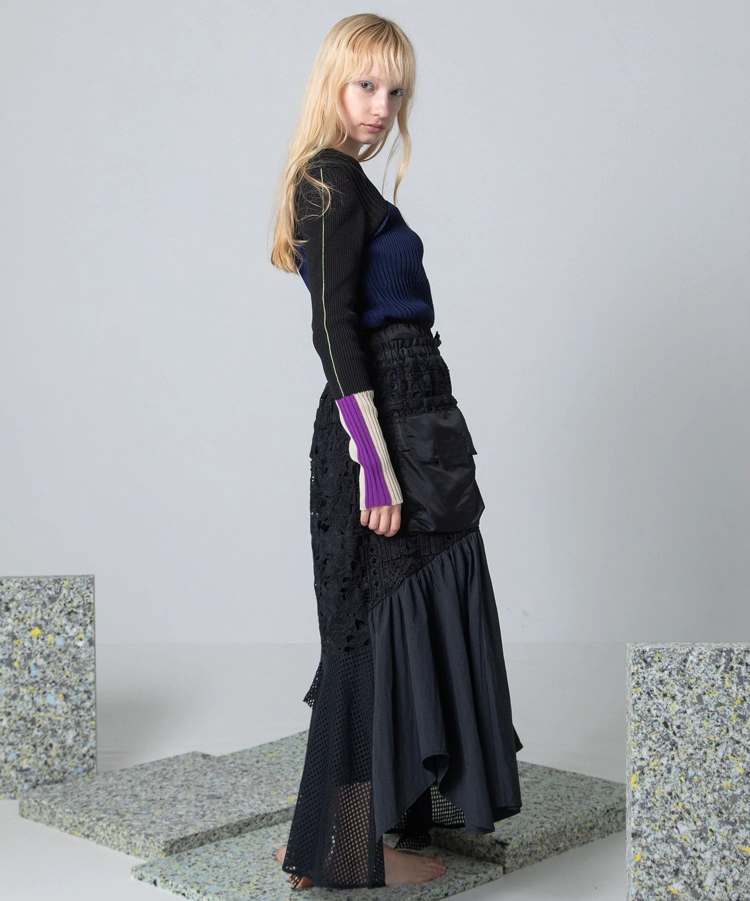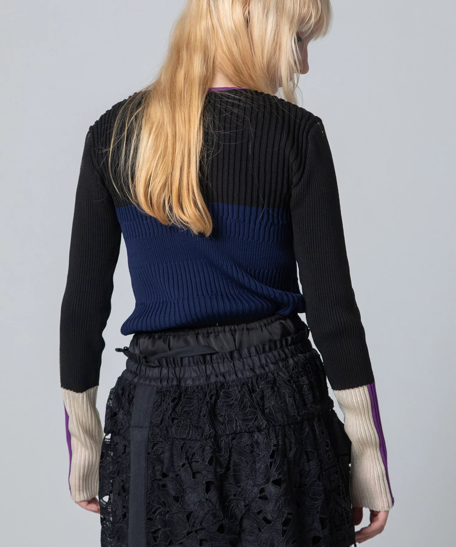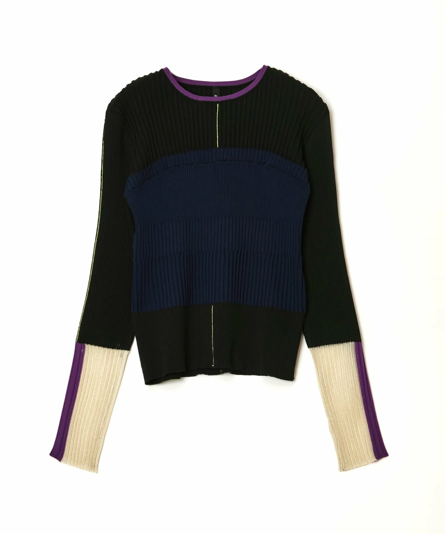 имеет спортивный вид. Манжеты выполнены из прозрачной пряжи для создания эффекта полупрозрачности, а вырез горловины выполнен в цветовом блоке. Тонкая линия в тон добавлена по центру передней и задней части для акцента.