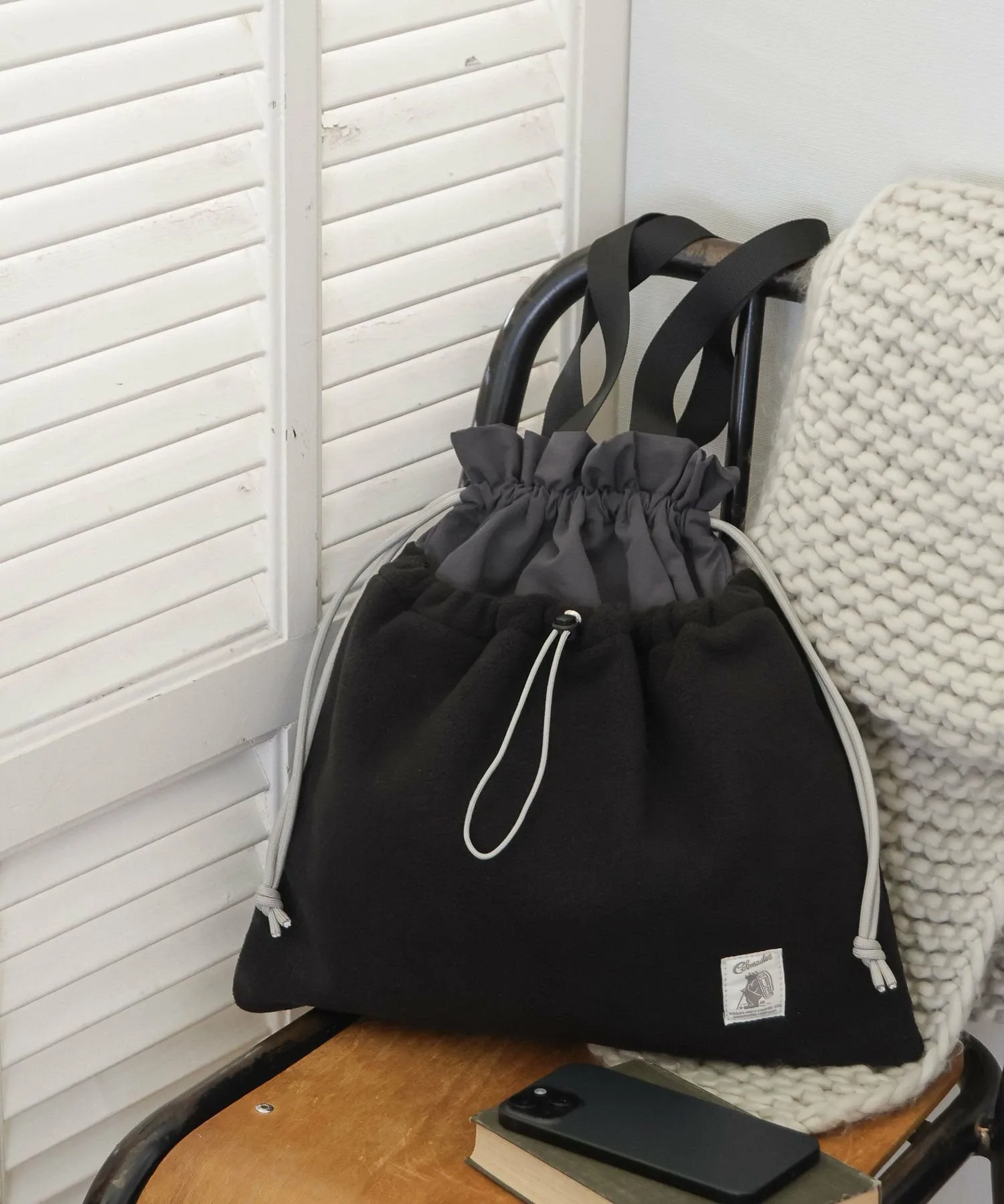 Цветовая сумка-тоут на завязках, изготовленная из комбинации флиса и нейлона.