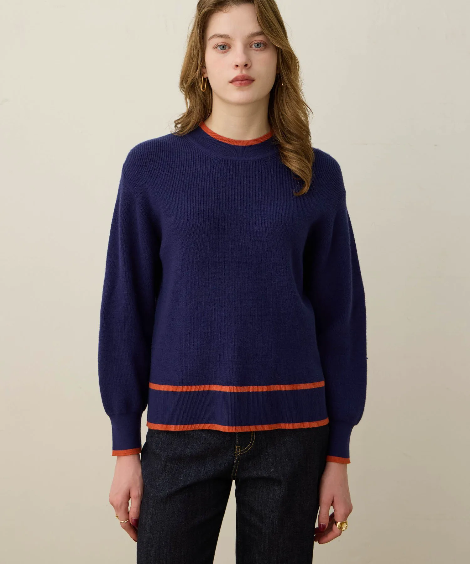 Двухцветный вязаный пуловер с цветными акцентами на воротнике, рукавах и подоле.