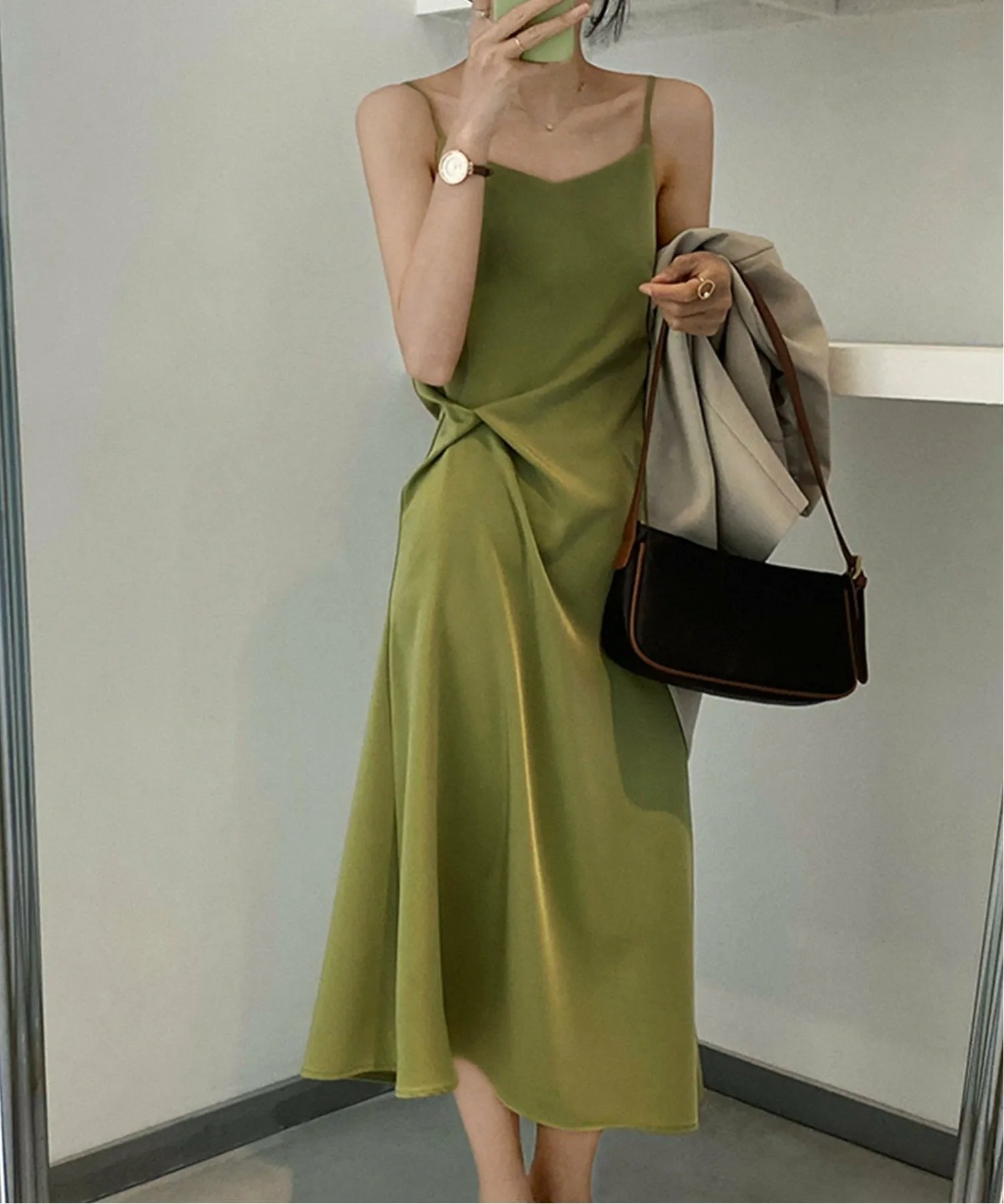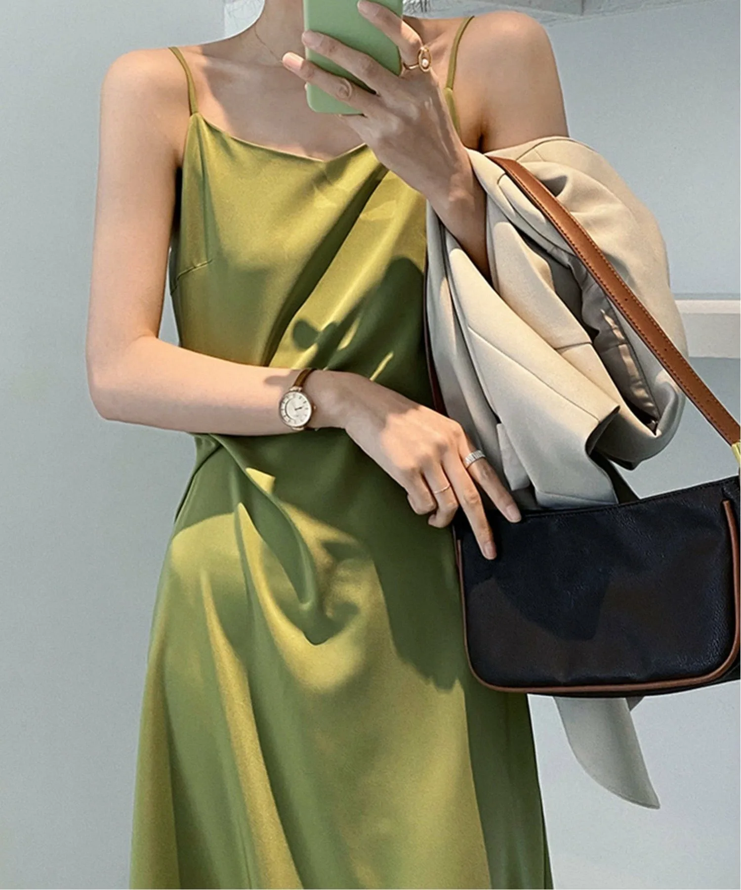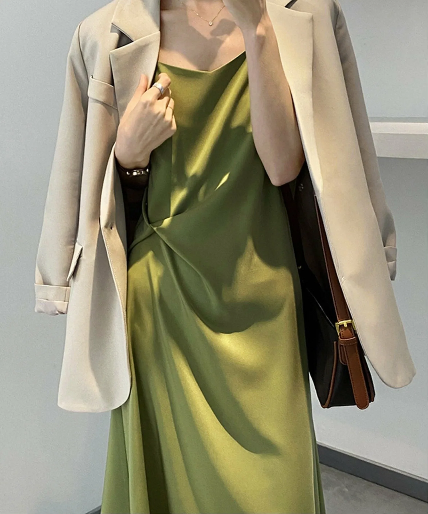 Блеск атласной ткани и нежный топ создают сексуальное платье телесного цвета.