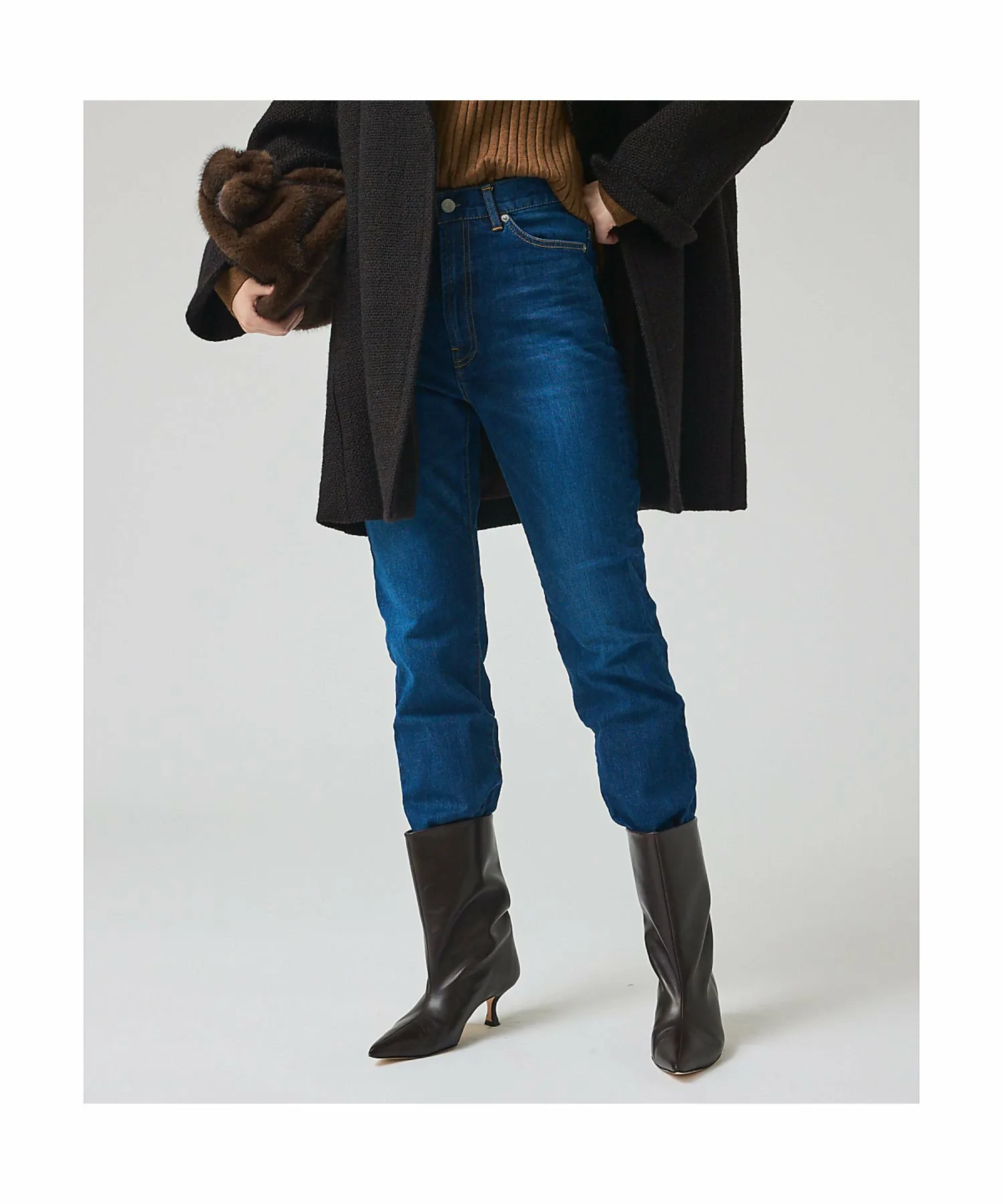 Модель цвета индиго: рост 170 см, обхват груди 77 см, талия 58 см, обхват талии 85 см, размер 38.