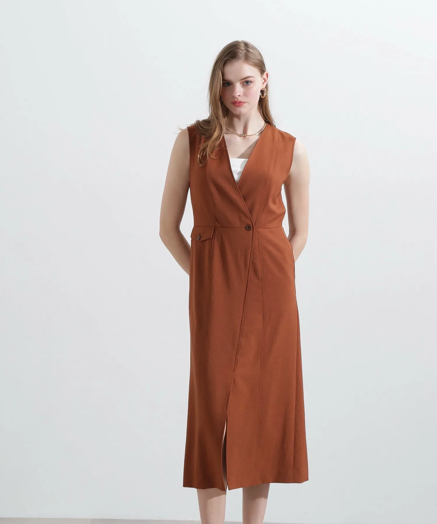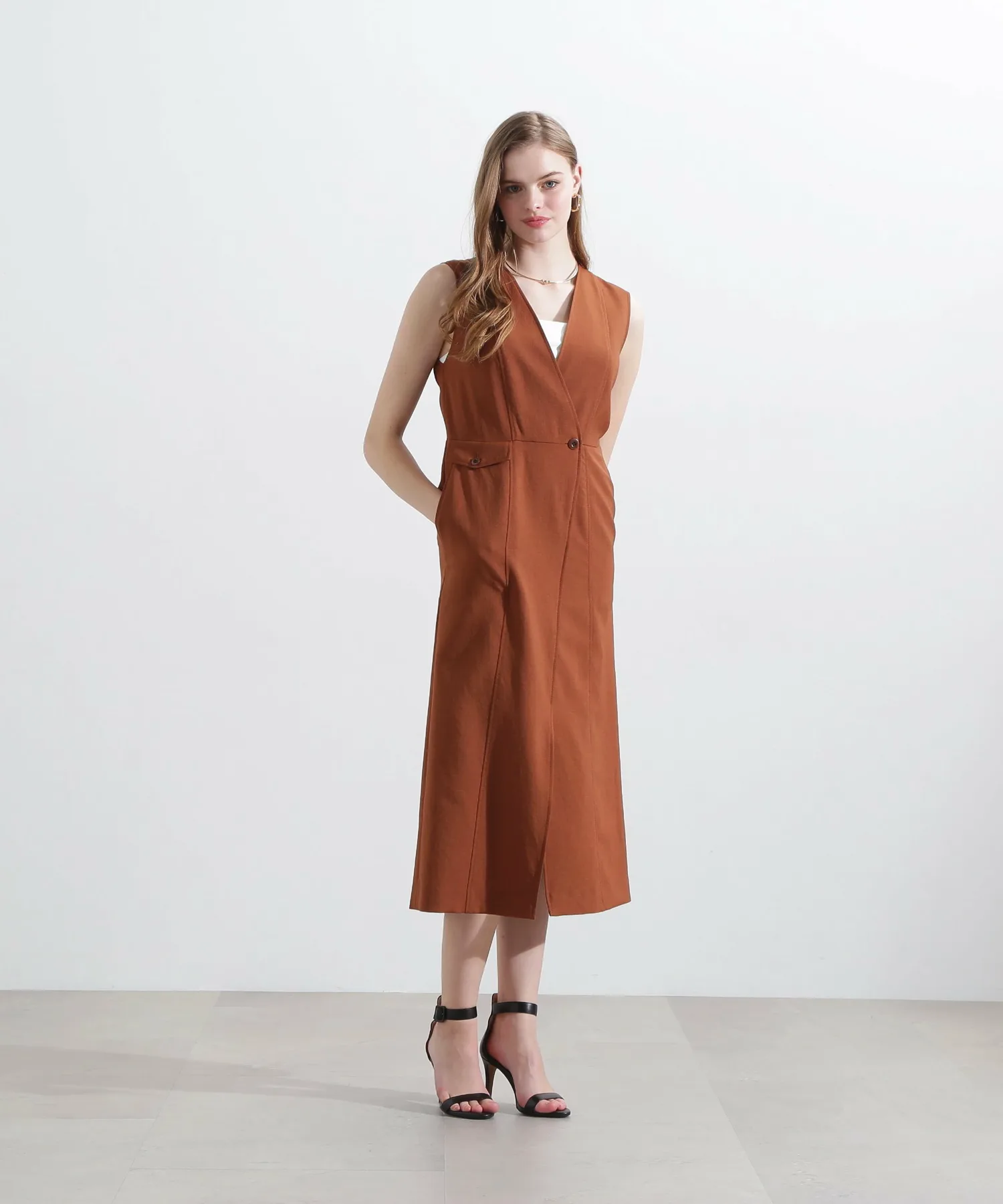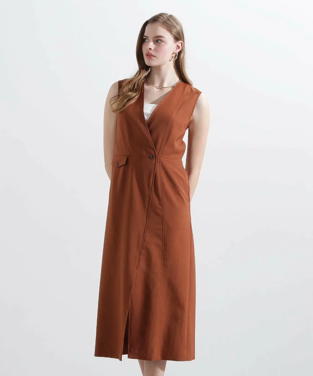 Эта юбка-сарафан с запахом имеет глубокий V-образный вырез для создания четкого силуэта, а пояс подчеркивает фигуру. Слегка расклешенный силуэт выделяет фигуру, а накладные карманы добавляют изюминку. Она проста, но изысканна. Сочетайте ее с открытым верхом для лаконичного образа или с футболкой или прозрачной блузкой для утонченного повседневного образа.
