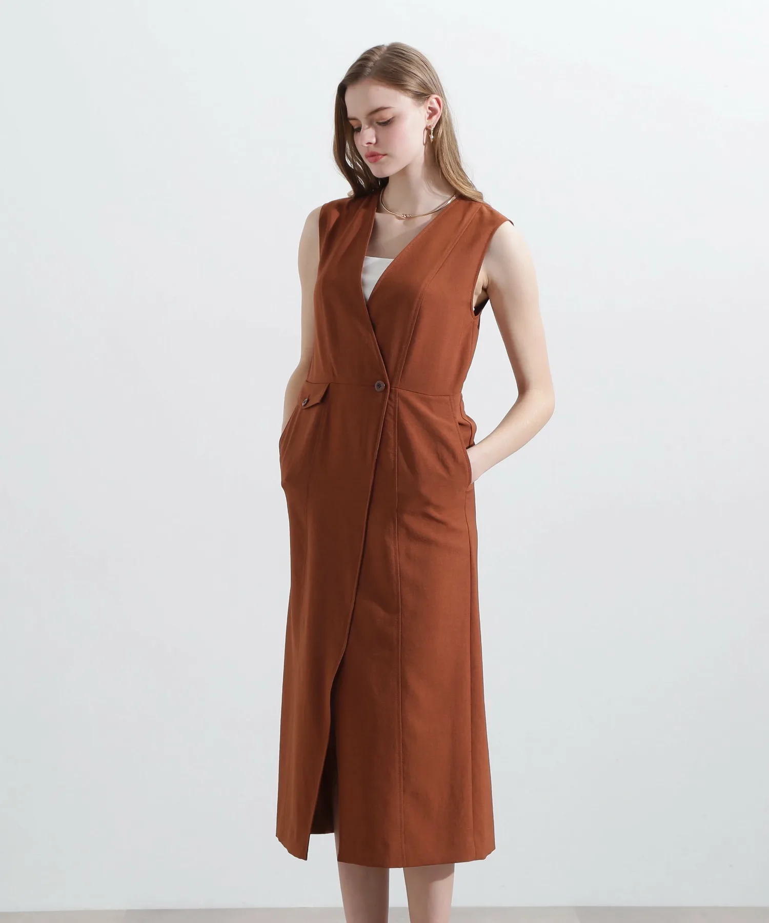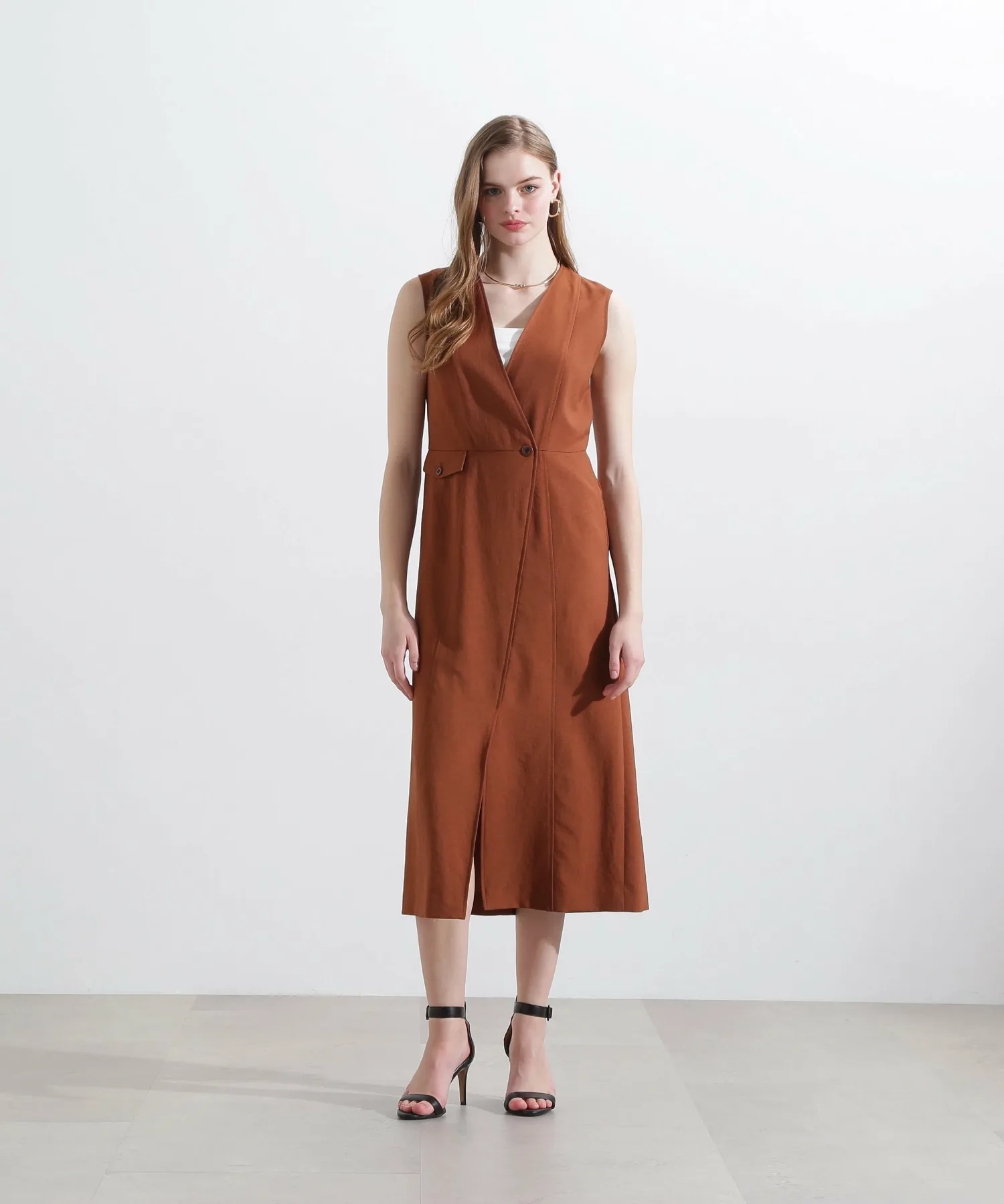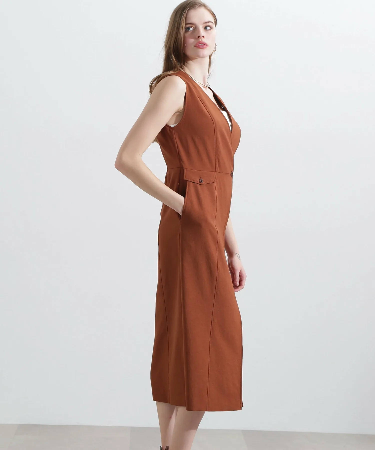 Эта юбка-сарафан с запахом имеет глубокий V-образный вырез для создания четкого силуэта, а пояс подчеркивает фигуру. Слегка расклешенный силуэт выделяет фигуру, а накладные карманы добавляют изюминку. Она проста, но изысканна. Сочетайте ее с открытым верхом для лаконичного образа или с футболкой или прозрачной блузкой для утонченного повседневного образа.
