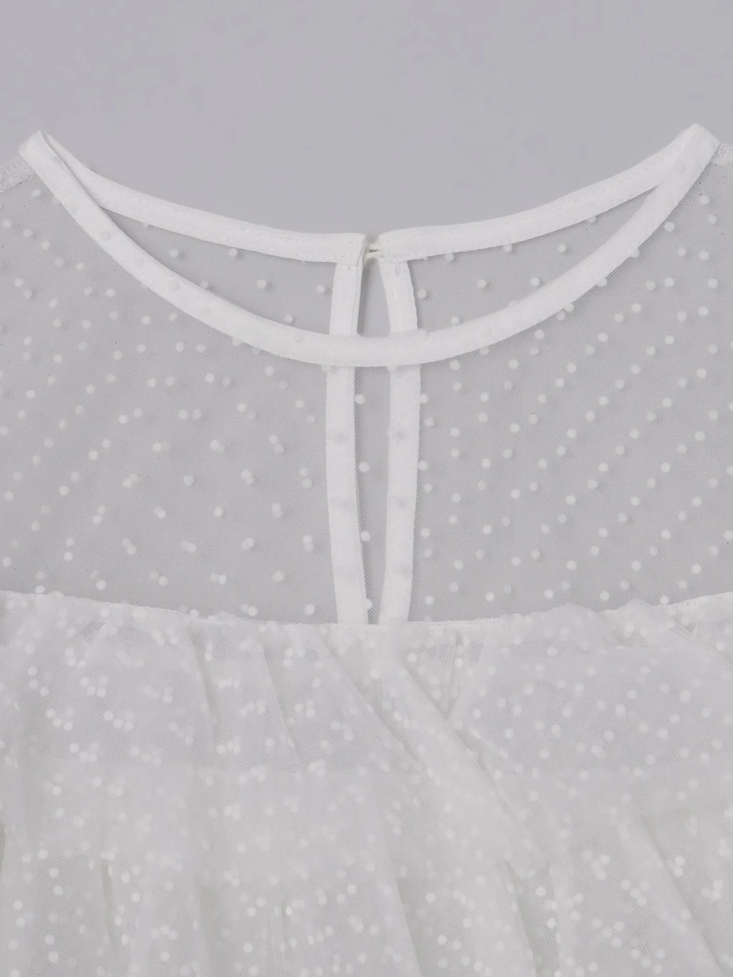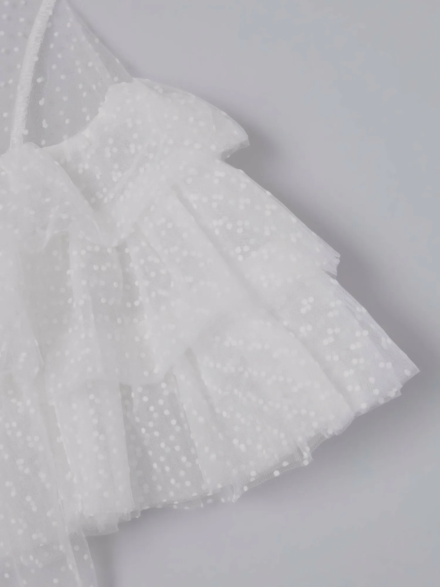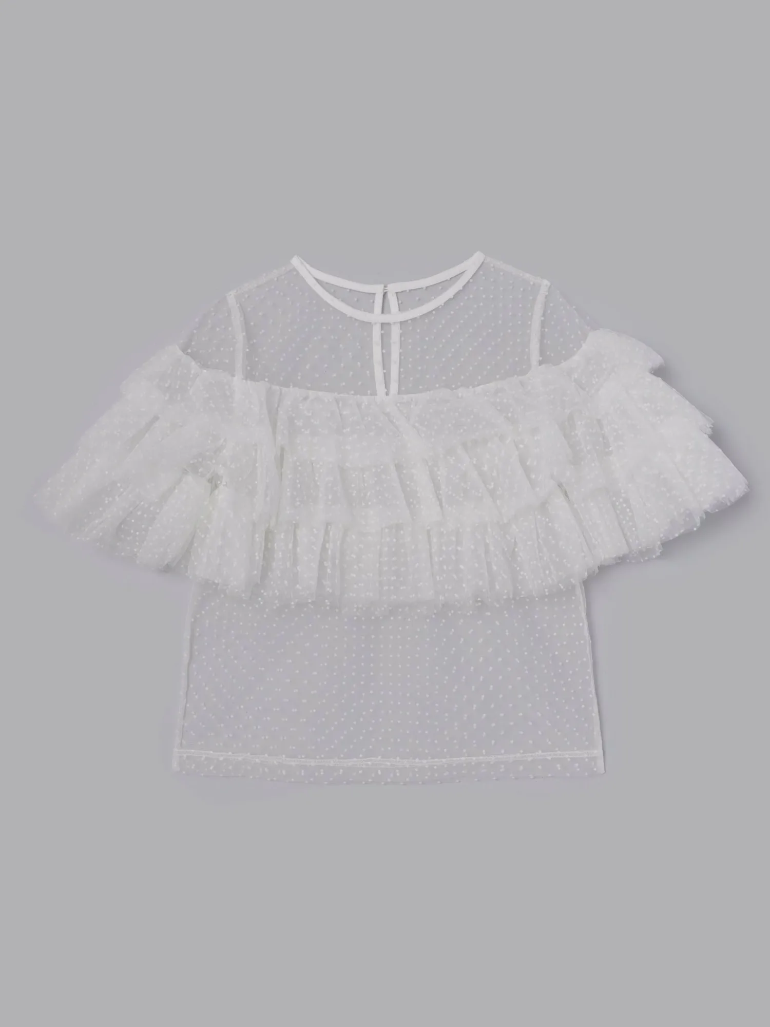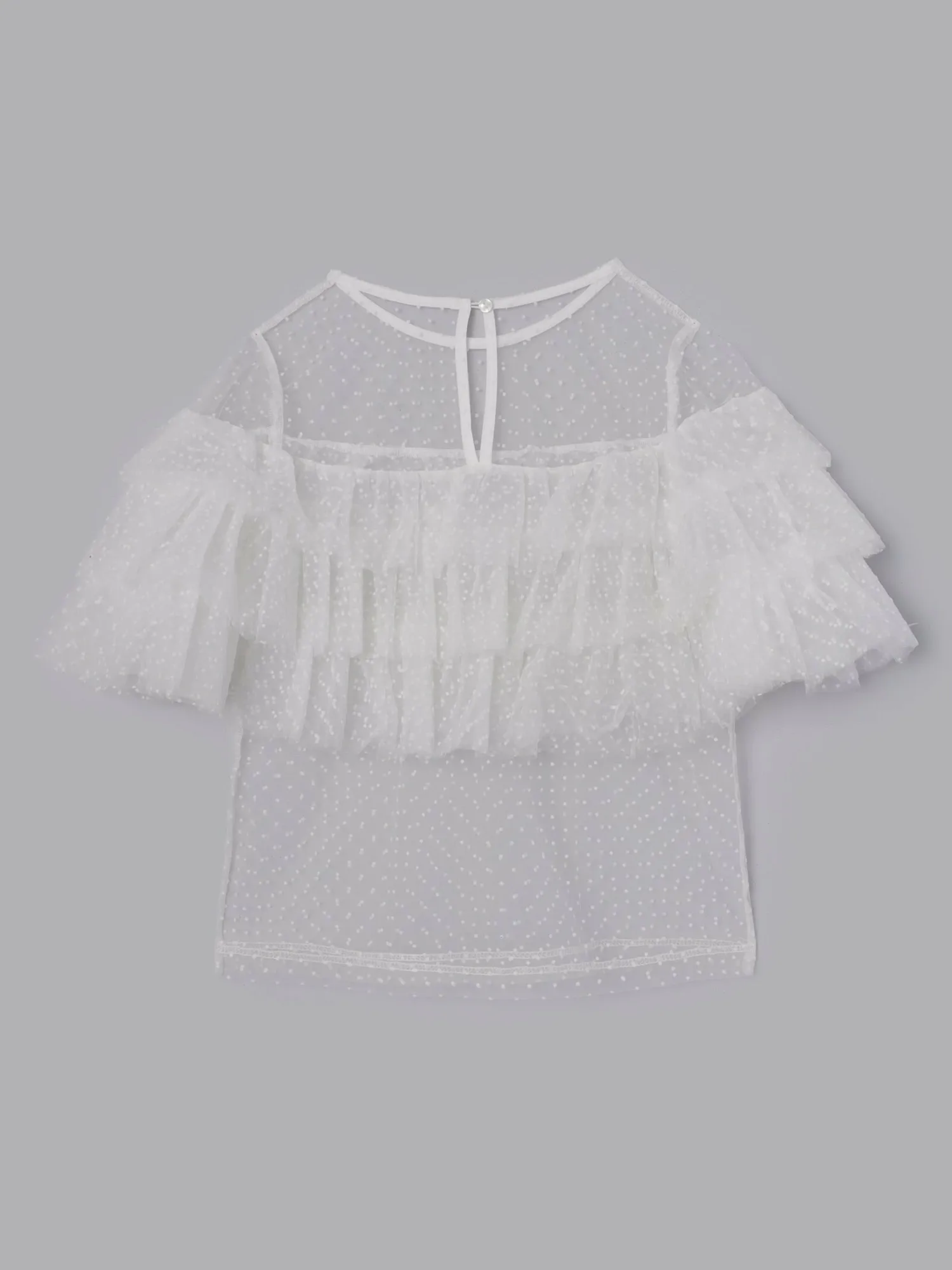 Слегка прозрачный, привлекательный дизайн, дополненный точечным бархатным принтом и множеством оборок.