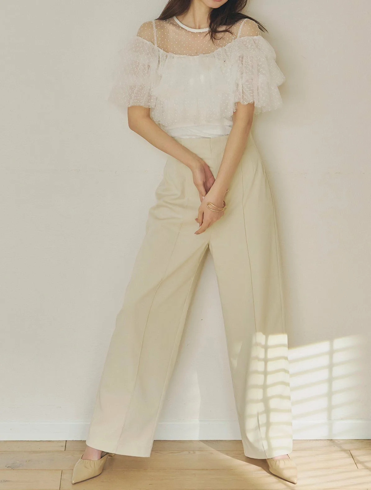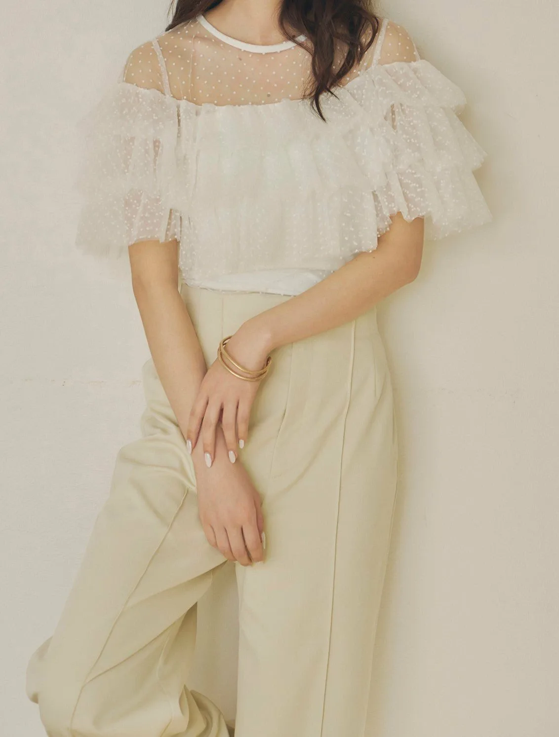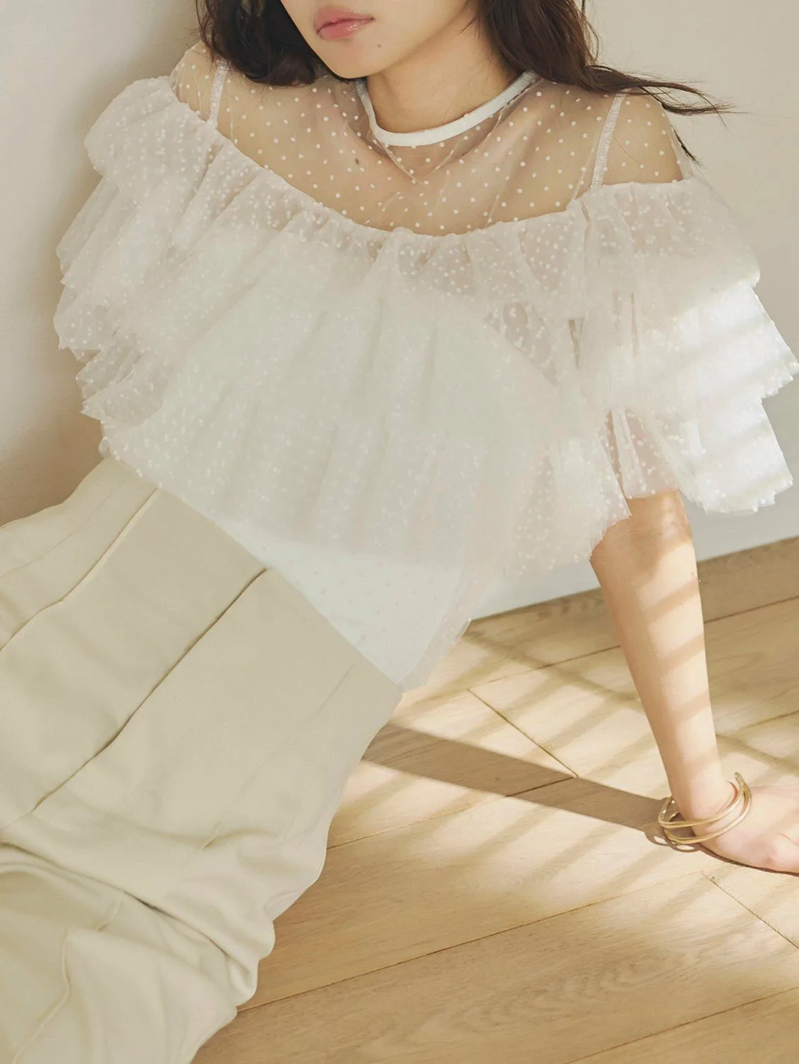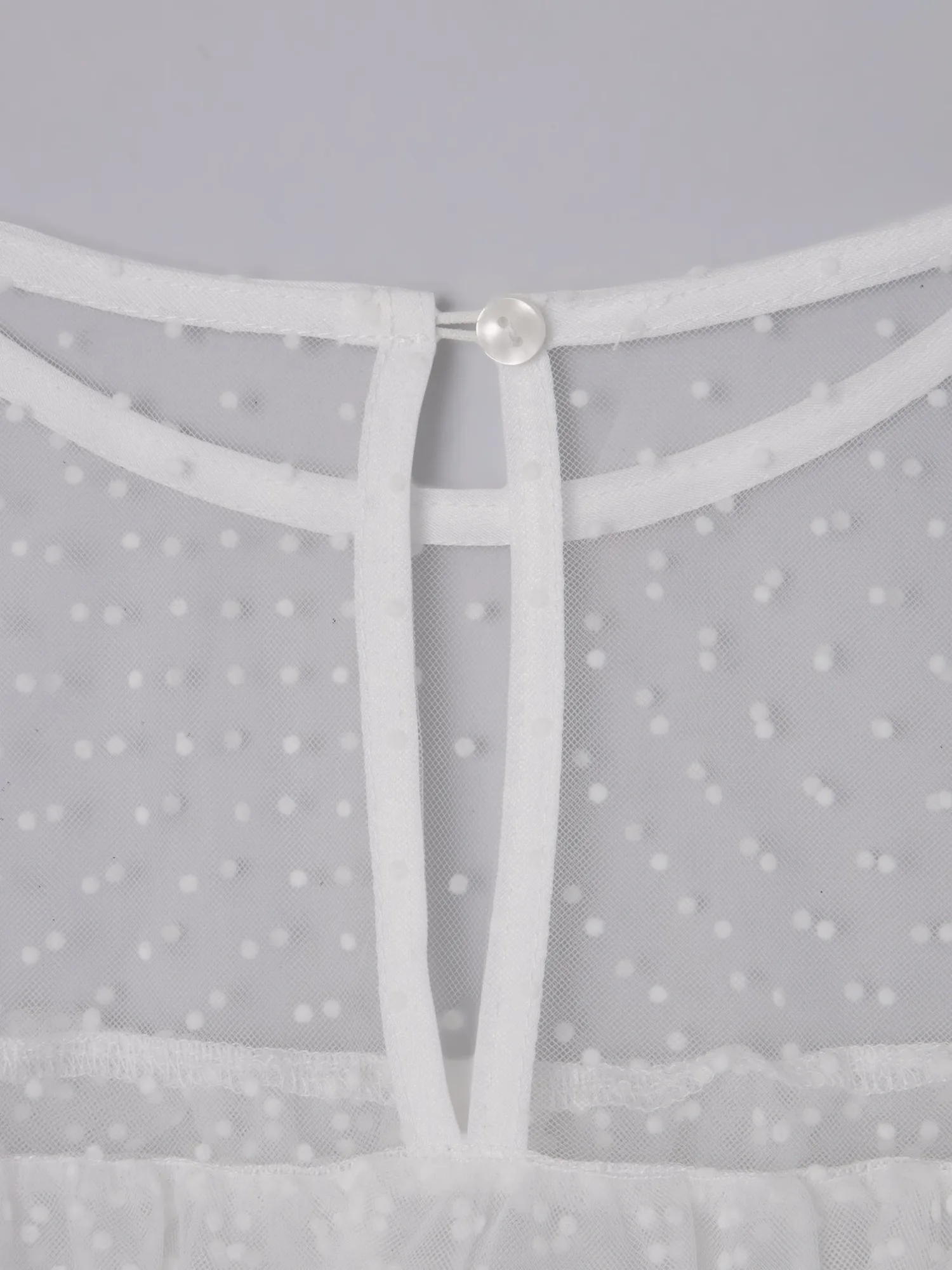 Слегка прозрачный, привлекательный дизайн, дополненный точечным бархатным принтом и множеством оборок.