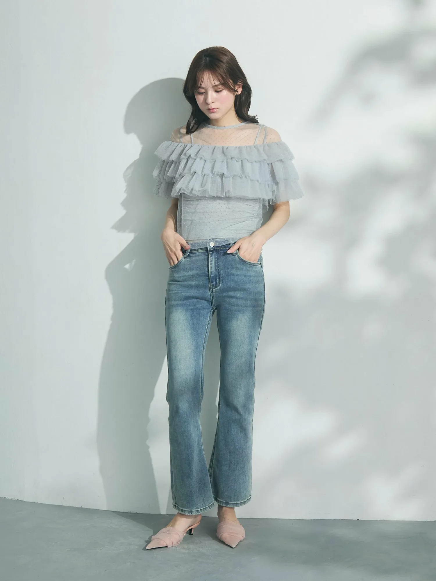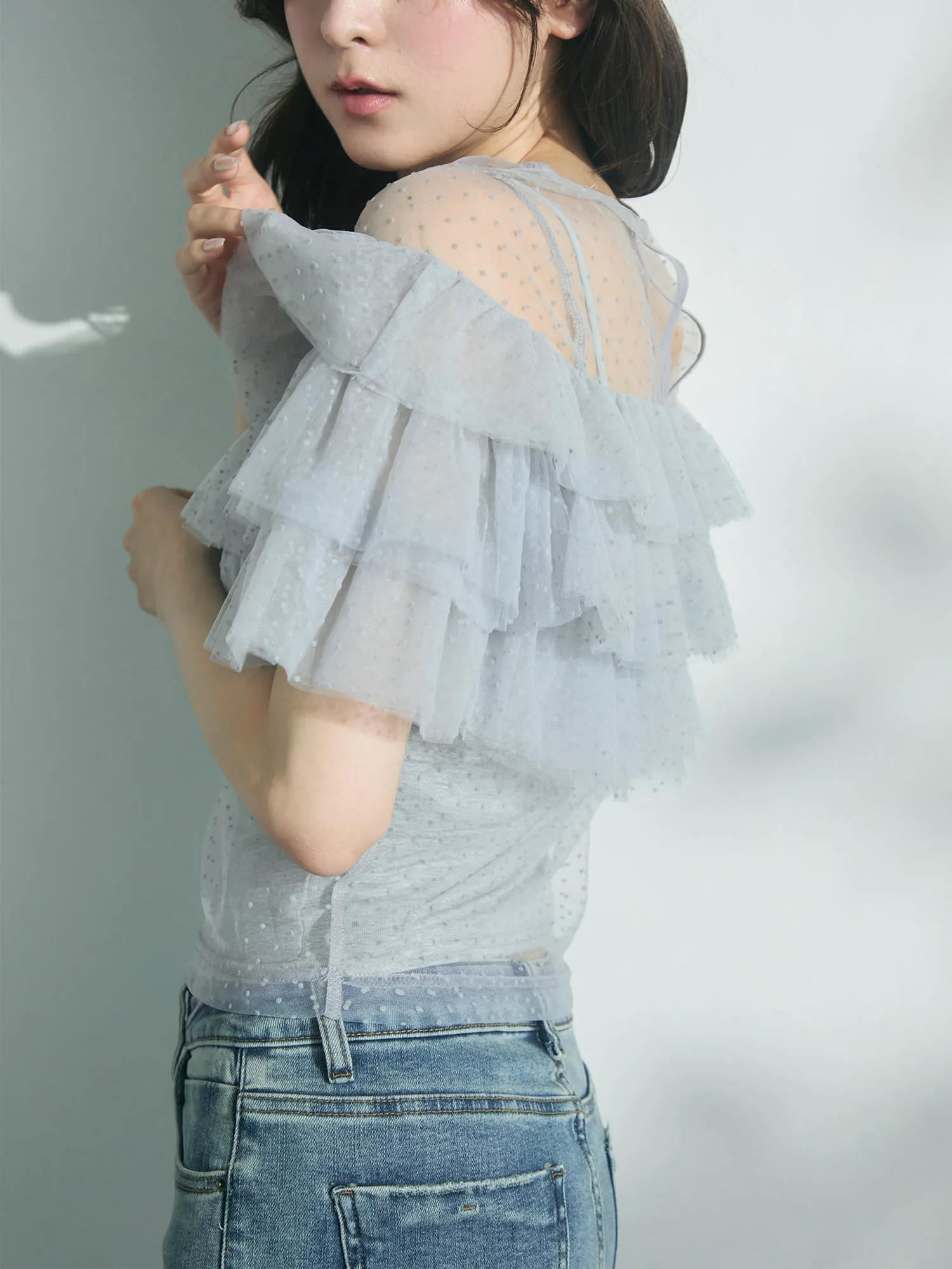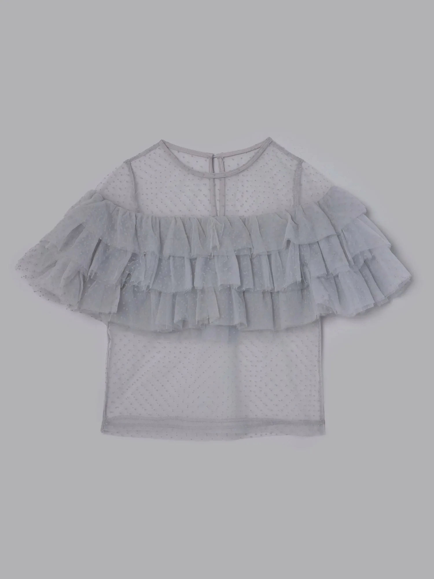 Слегка прозрачный, привлекательный дизайн, дополненный точечным бархатным принтом и множеством оборок.