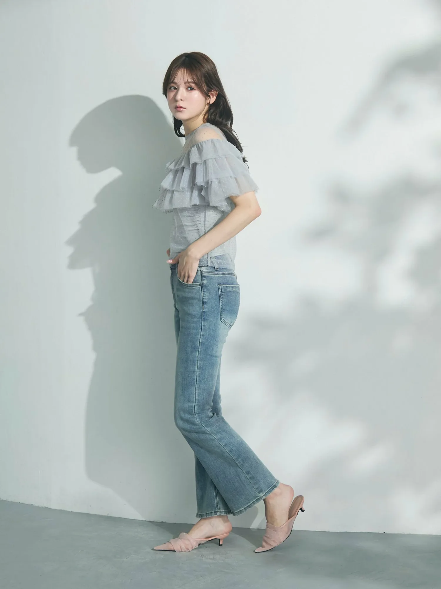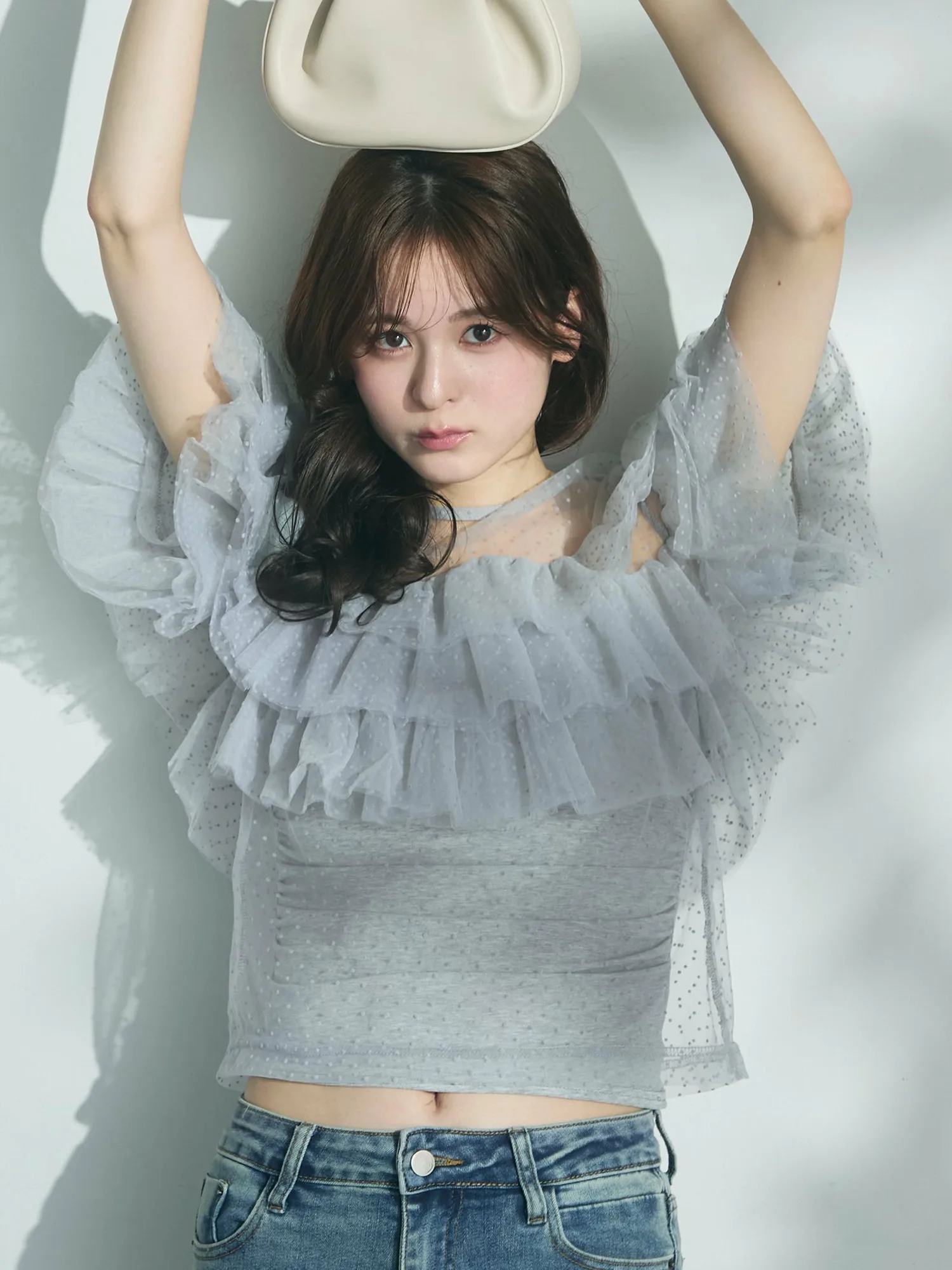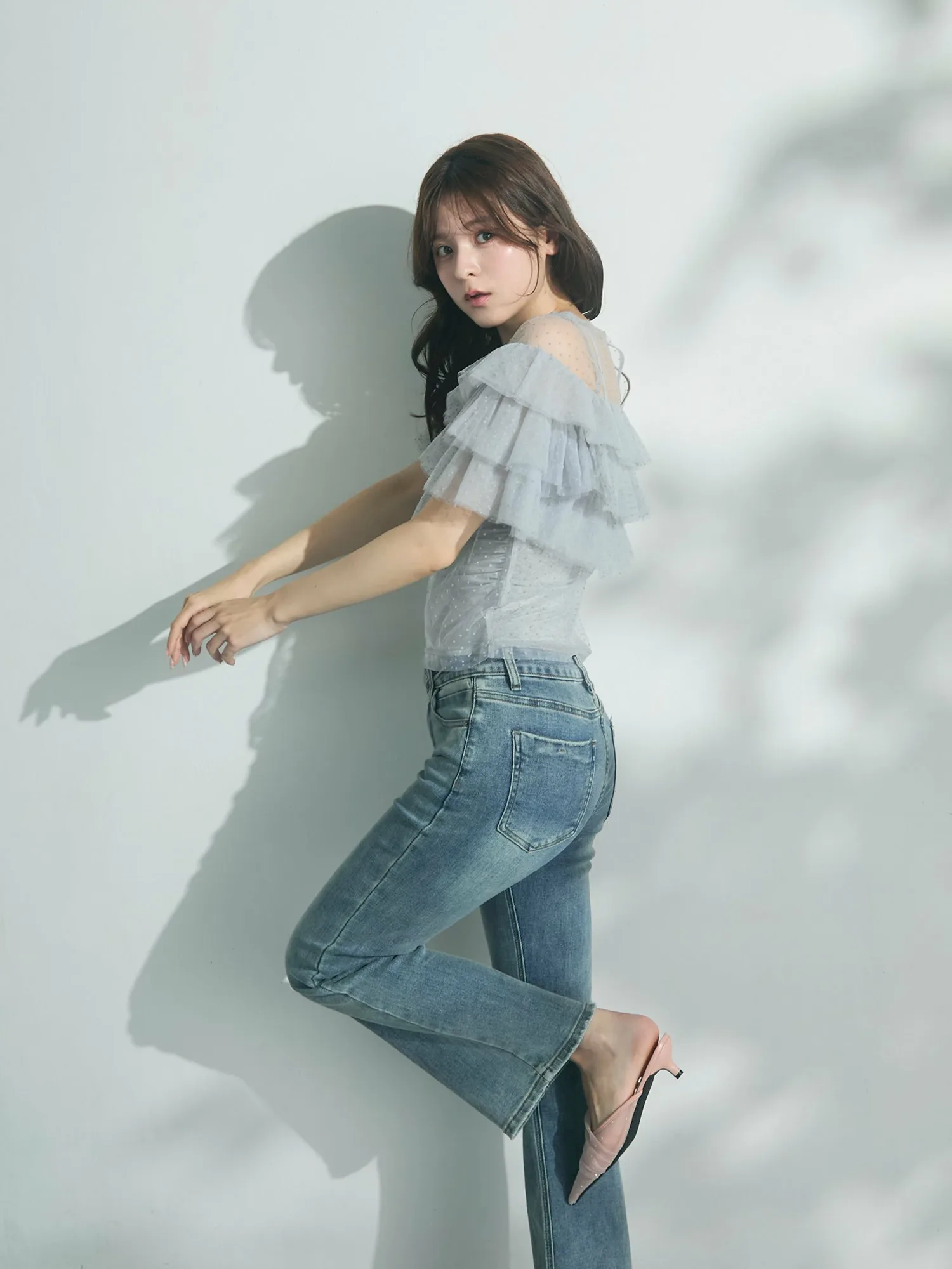 Слегка прозрачный, привлекательный дизайн, дополненный точечным бархатным принтом и множеством оборок.