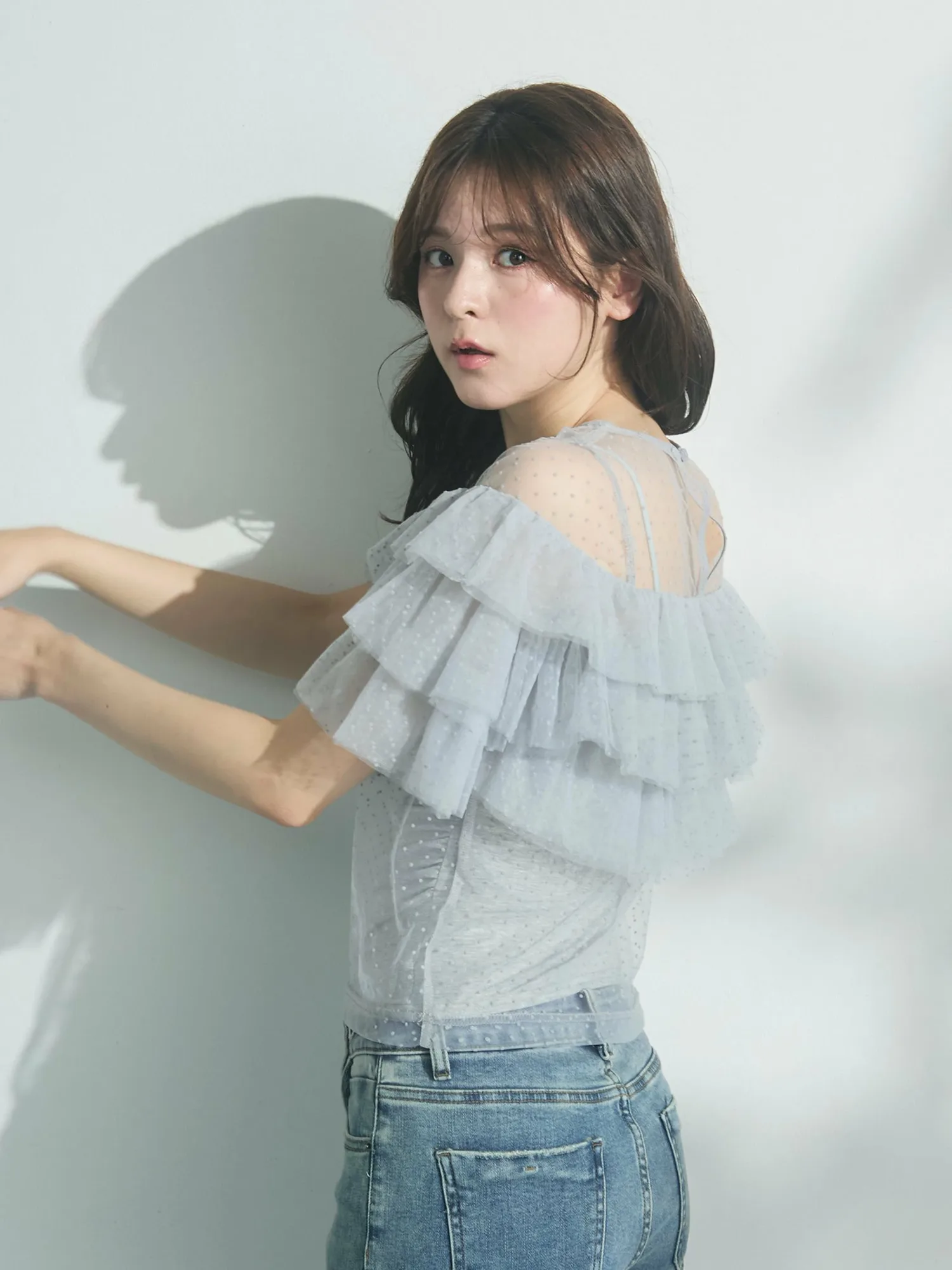 Оборки расположены в три яруса от плеч до низа, создавая мягкий, объемный силуэт.