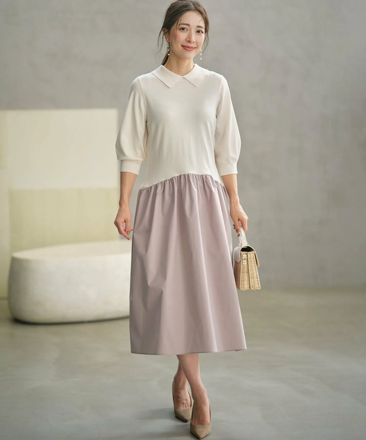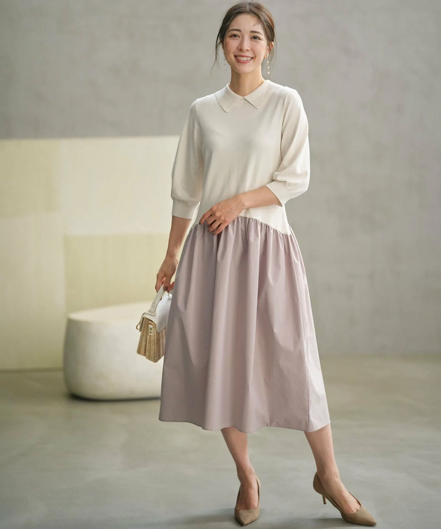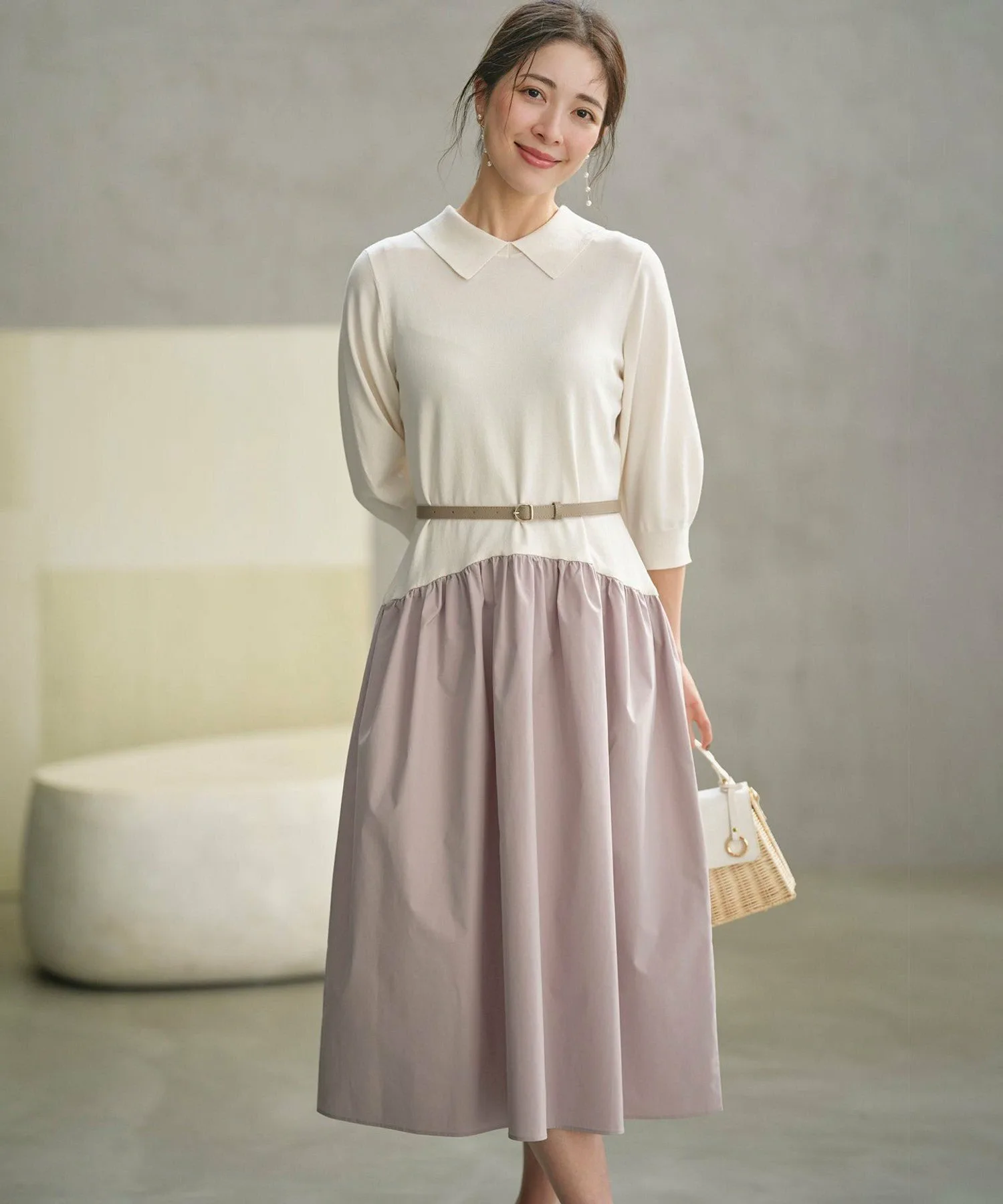 Это платье сочетает в себе вязаный верх с очаровательным воротником и юбку из другого материала, подчеркивая ваш стиль простым движением. Верхняя часть платья облегает фигуру, не обнажая изгибы. Жемчужные пуговицы на спине добавляют акцент, а прилагаемый пояс создает стильный образ с талией. Вырез, призванный подчеркнуть вашу стройную талию, не создавая эффекта «растянутости», также рекомендуется для более повседневного образа с низкой посадкой без пояса. Это платье можно стилизовать по-разному в зависимости от аксессуаров, которые вы с ним сочетаете.