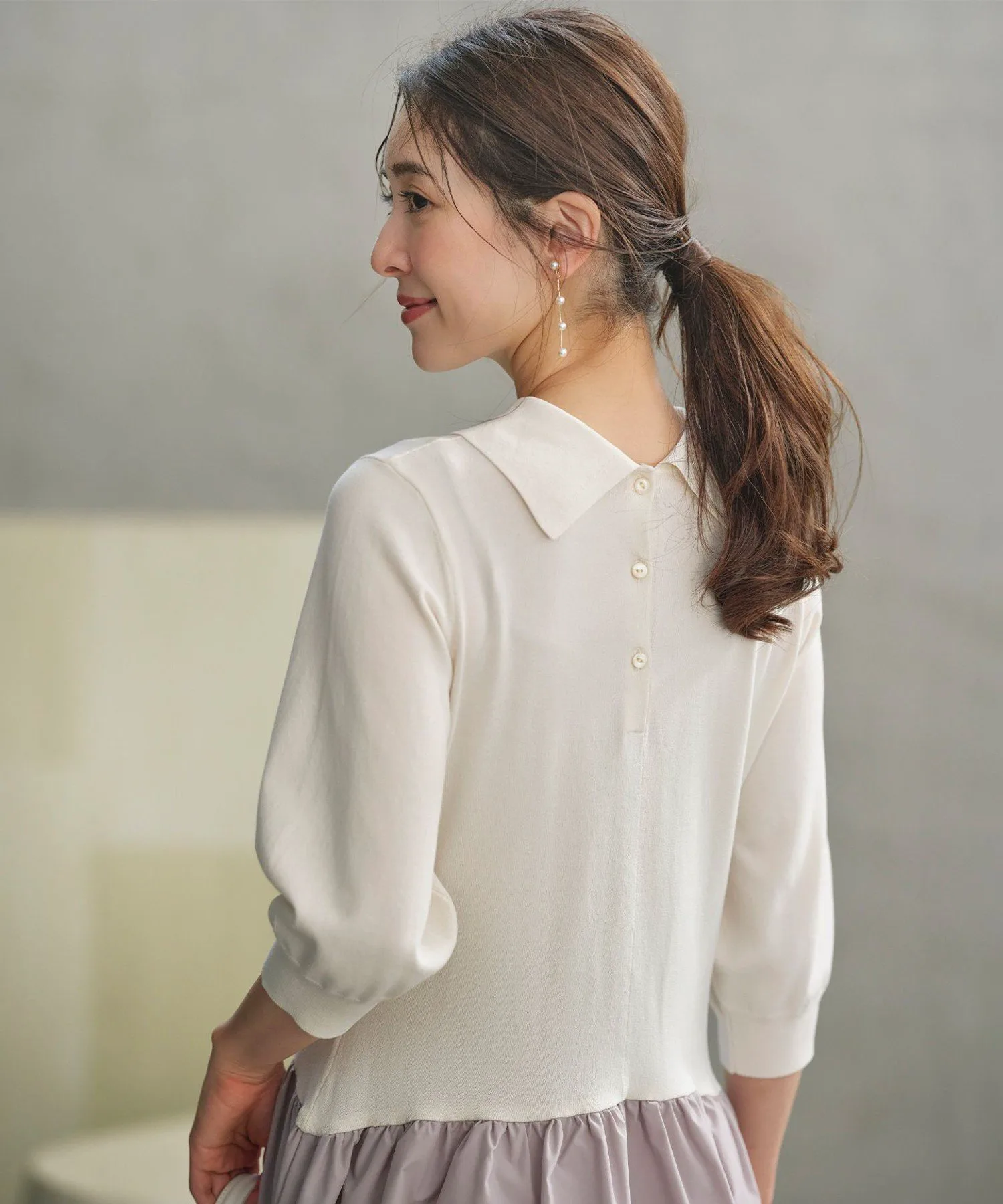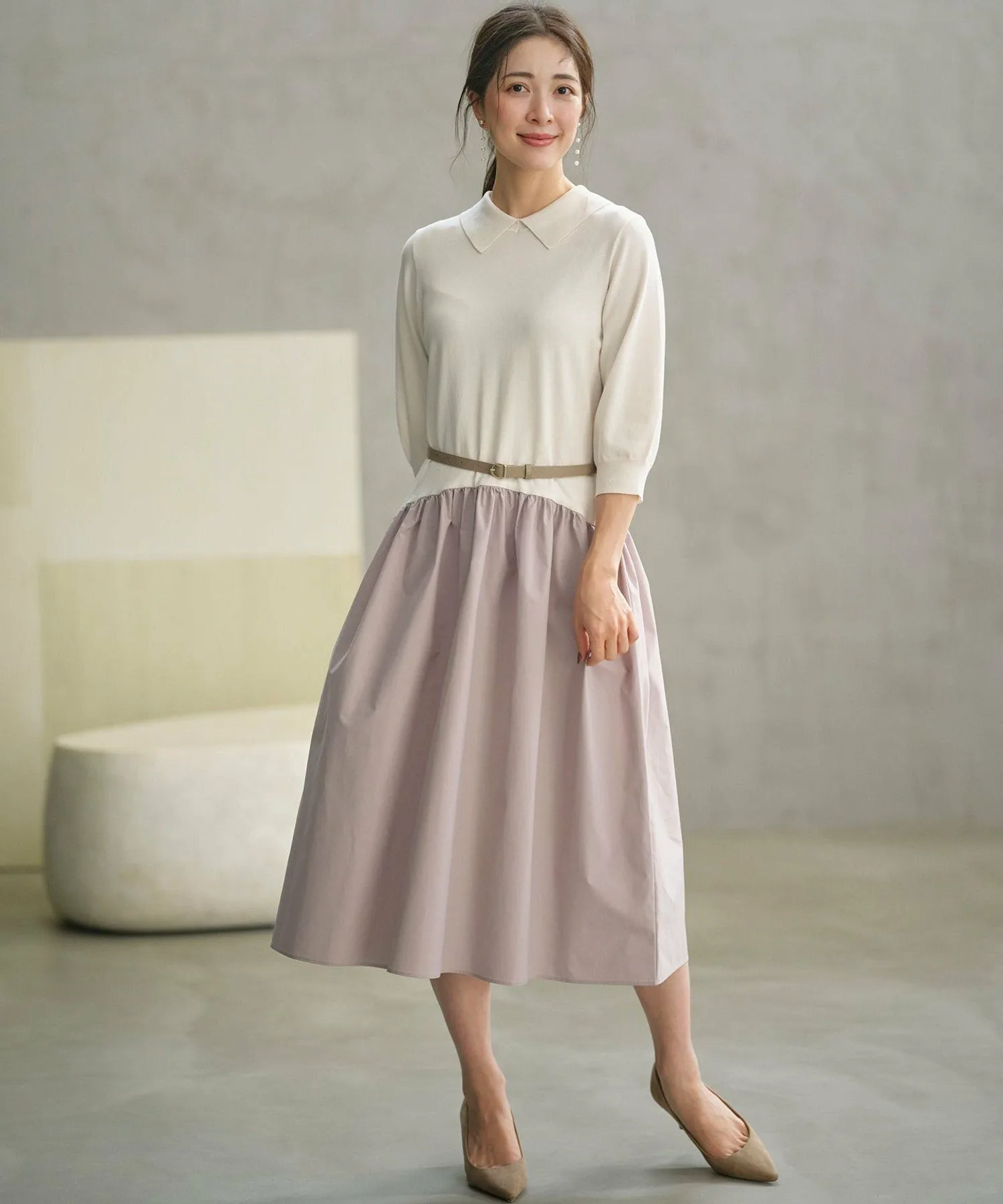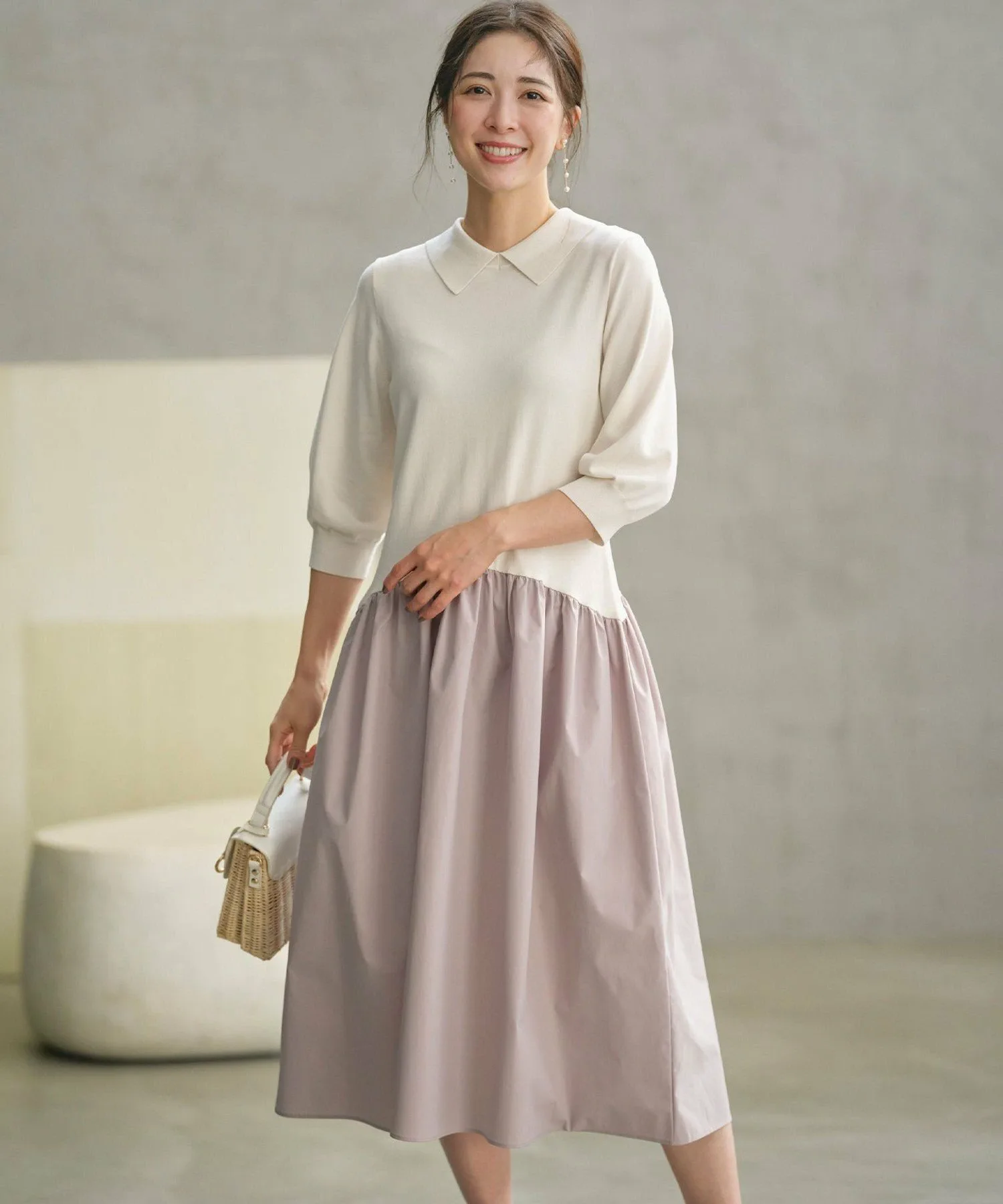Это платье сочетает в себе вязаный верх с очаровательным воротником и юбку из другого материала, подчеркивая ваш стиль простым движением. Верхняя часть платья облегает фигуру, не обнажая изгибы. Жемчужные пуговицы на спине добавляют акцент, а прилагаемый пояс создает стильный образ с талией. Вырез, призванный подчеркнуть вашу стройную талию, не создавая эффекта «растянутости», также рекомендуется для более повседневного образа с низкой посадкой без пояса. Это платье можно стилизовать по-разному в зависимости от аксессуаров, которые вы с ним сочетаете.
