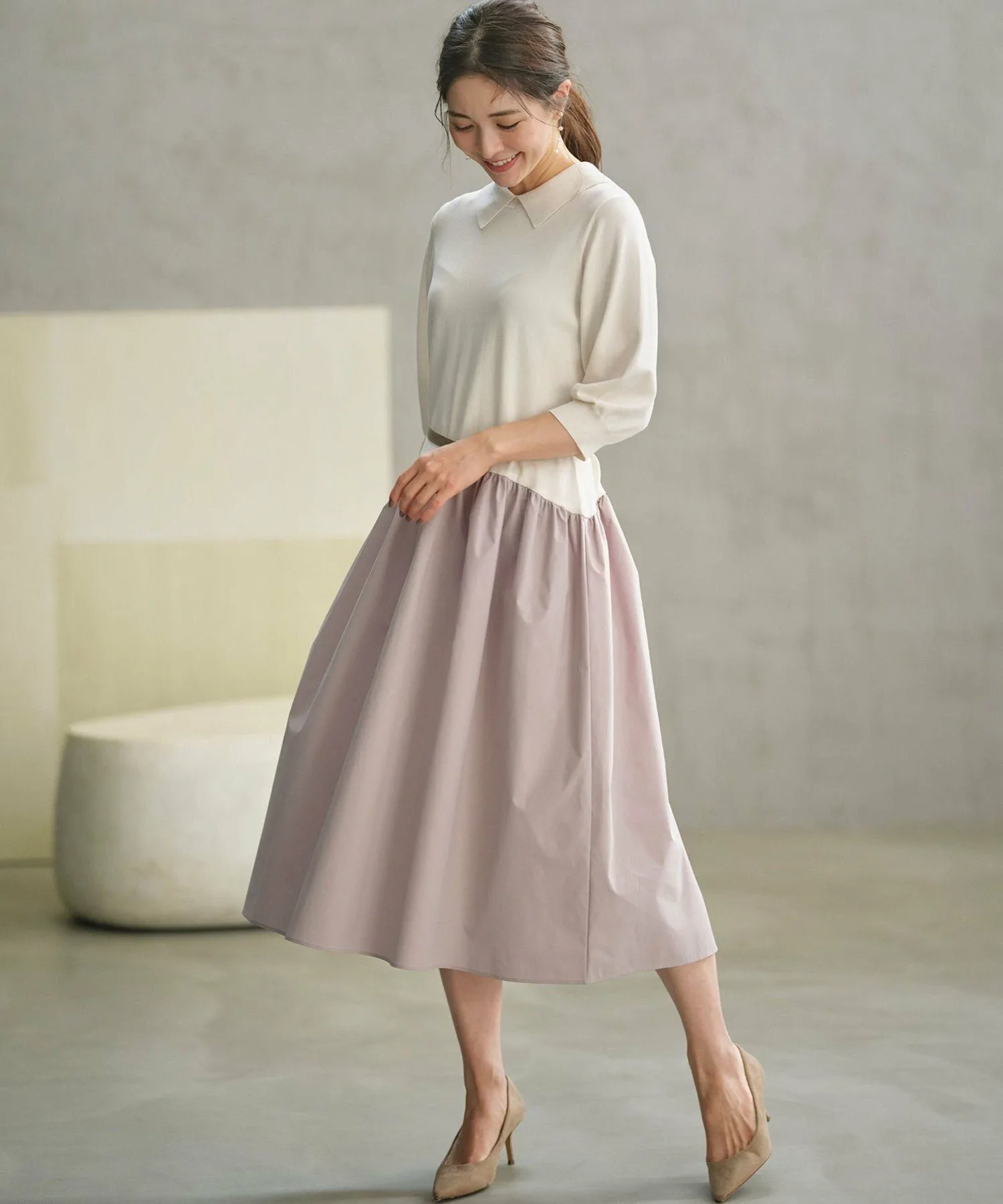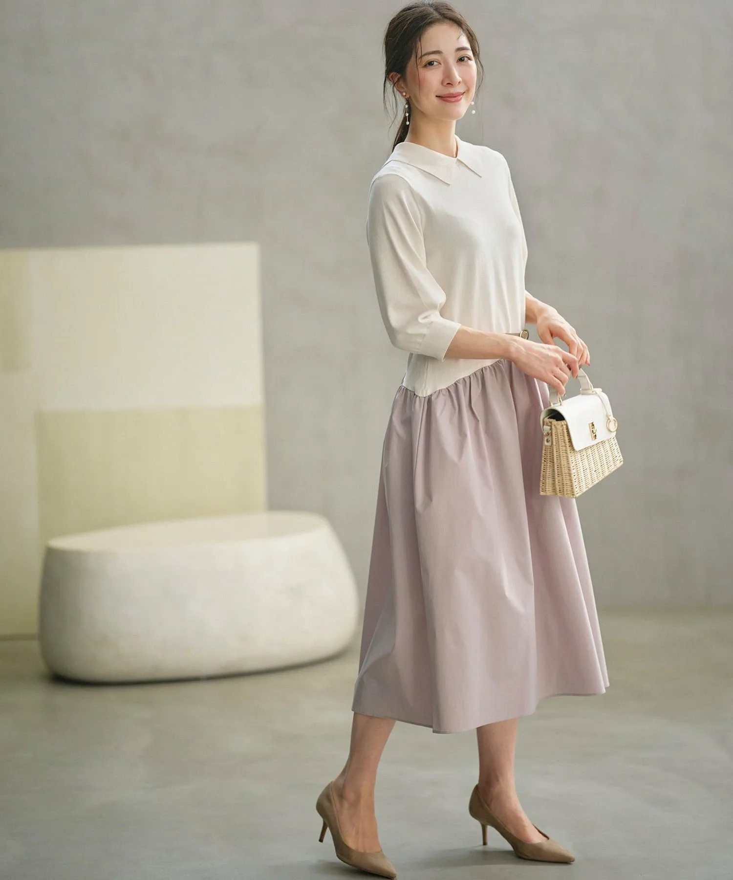 Материал<Верх>Изготовлено из тщательно отобранного высококачественного хлопка и экологически чистого переработанного полиэстера. Пряжа блестящая и гладкая на ощупь. Добавление ультратонкой эластичной пряжи создает красивый трикотаж с комфортной, упругой текстурой. Сохраняя легкость хлопка, этот материал отличается элегантным блеском, плотной поверхностью и оптимальной степенью упругости и хрусткости, что делает его универсальным материалом, подходящим для разных сезонов. <Юбка> Этот материал приятен на ощупь, обладает умеренной упругостью и эластичностью, создавая комфортный и воздушный силуэт.