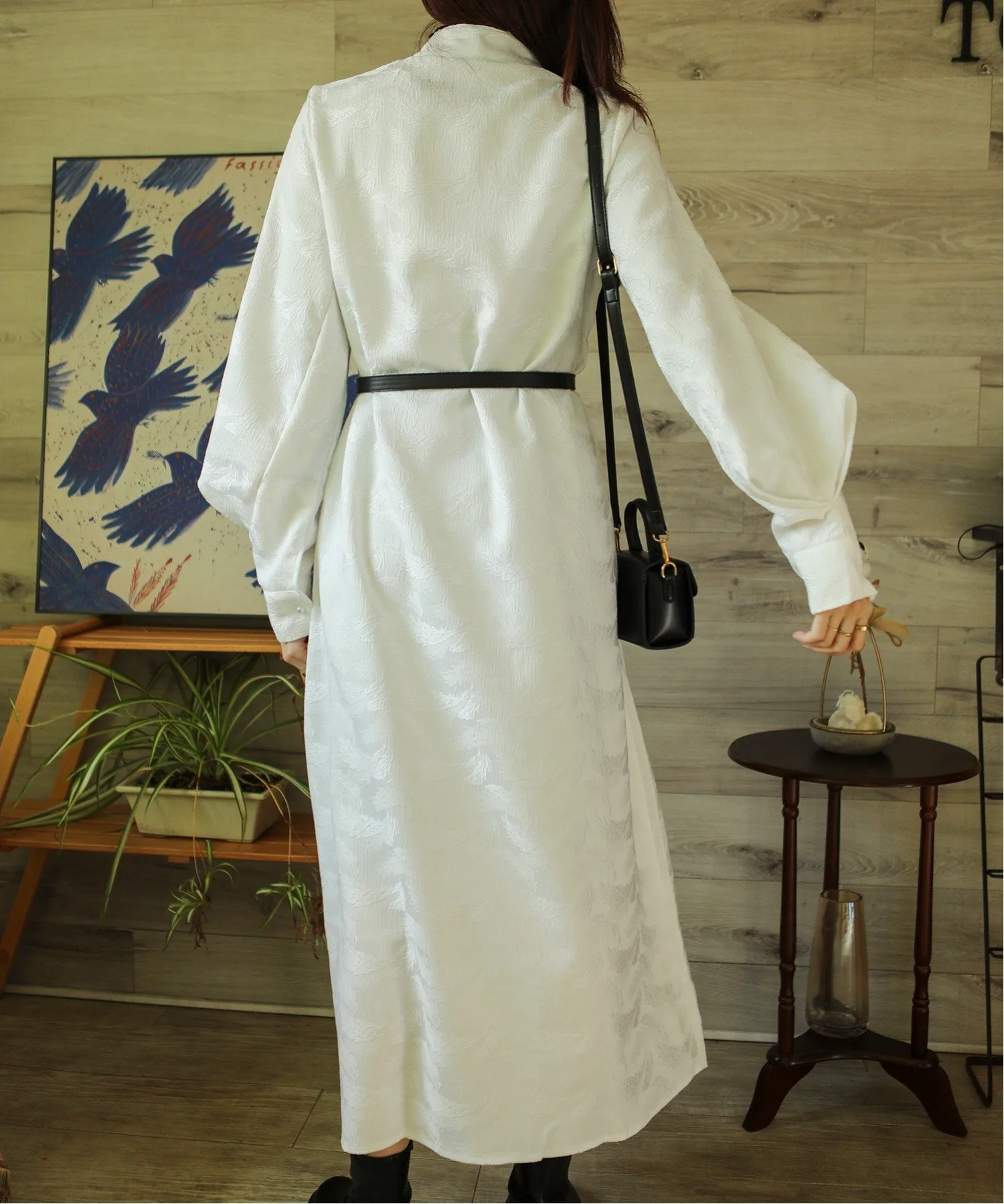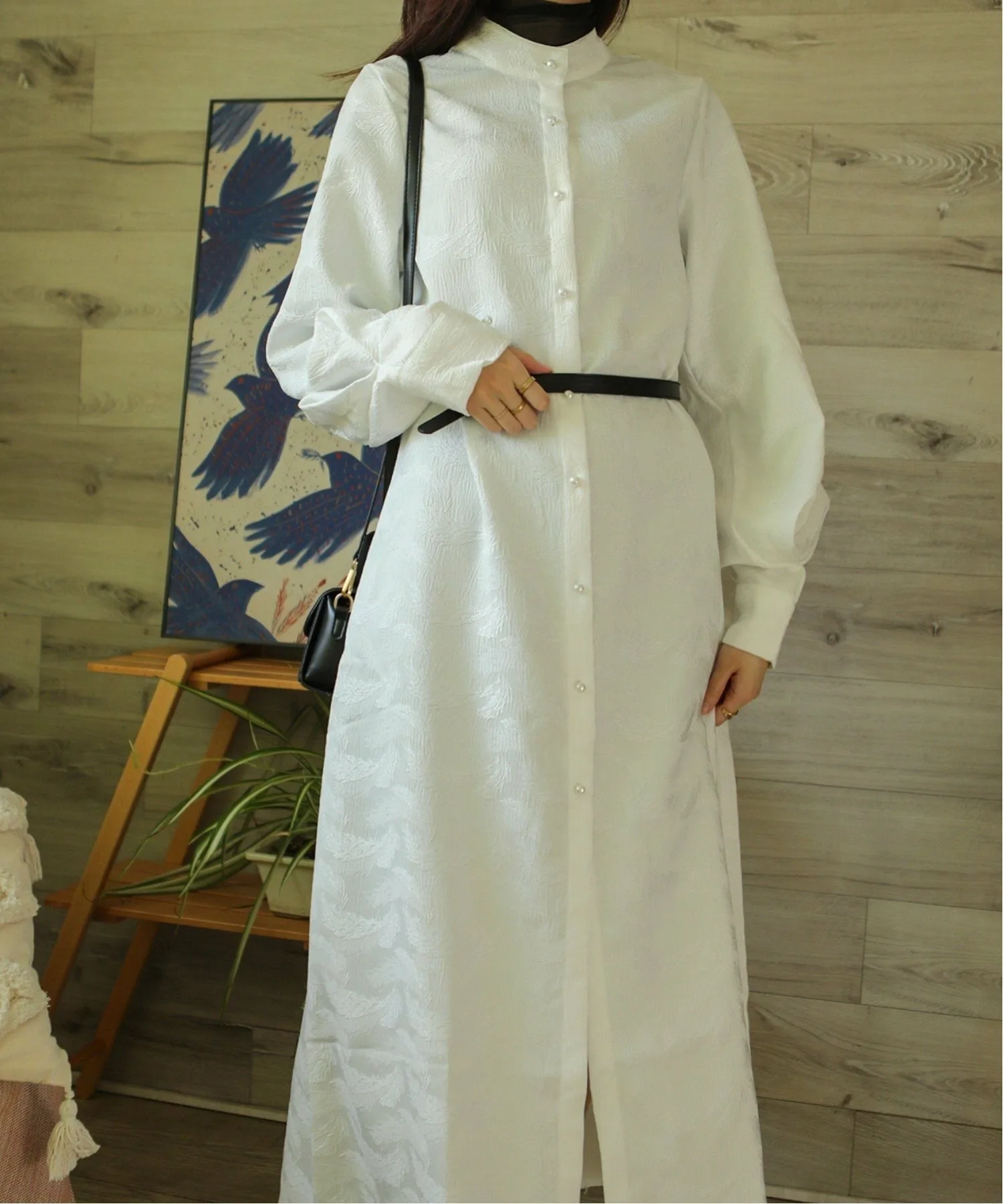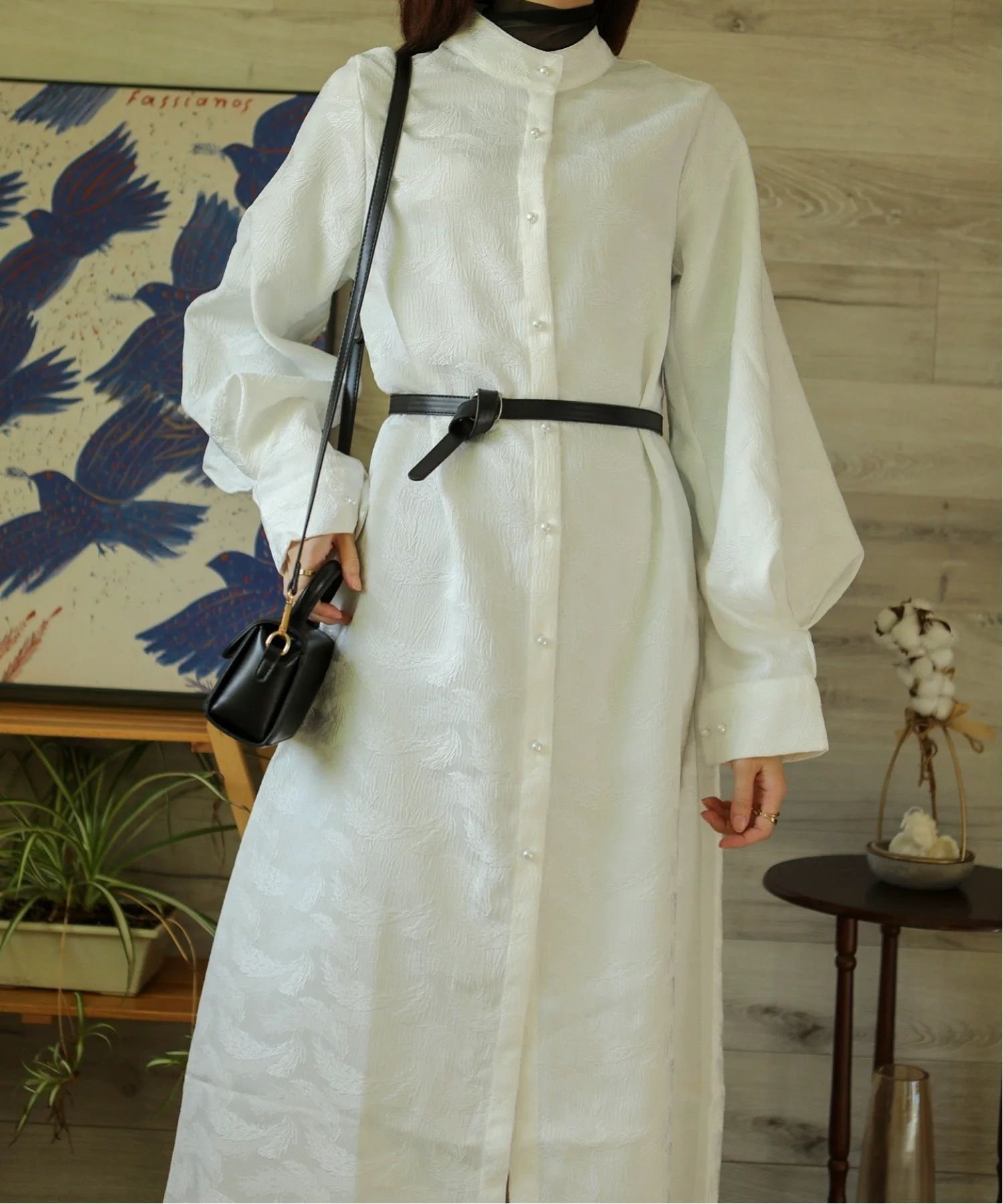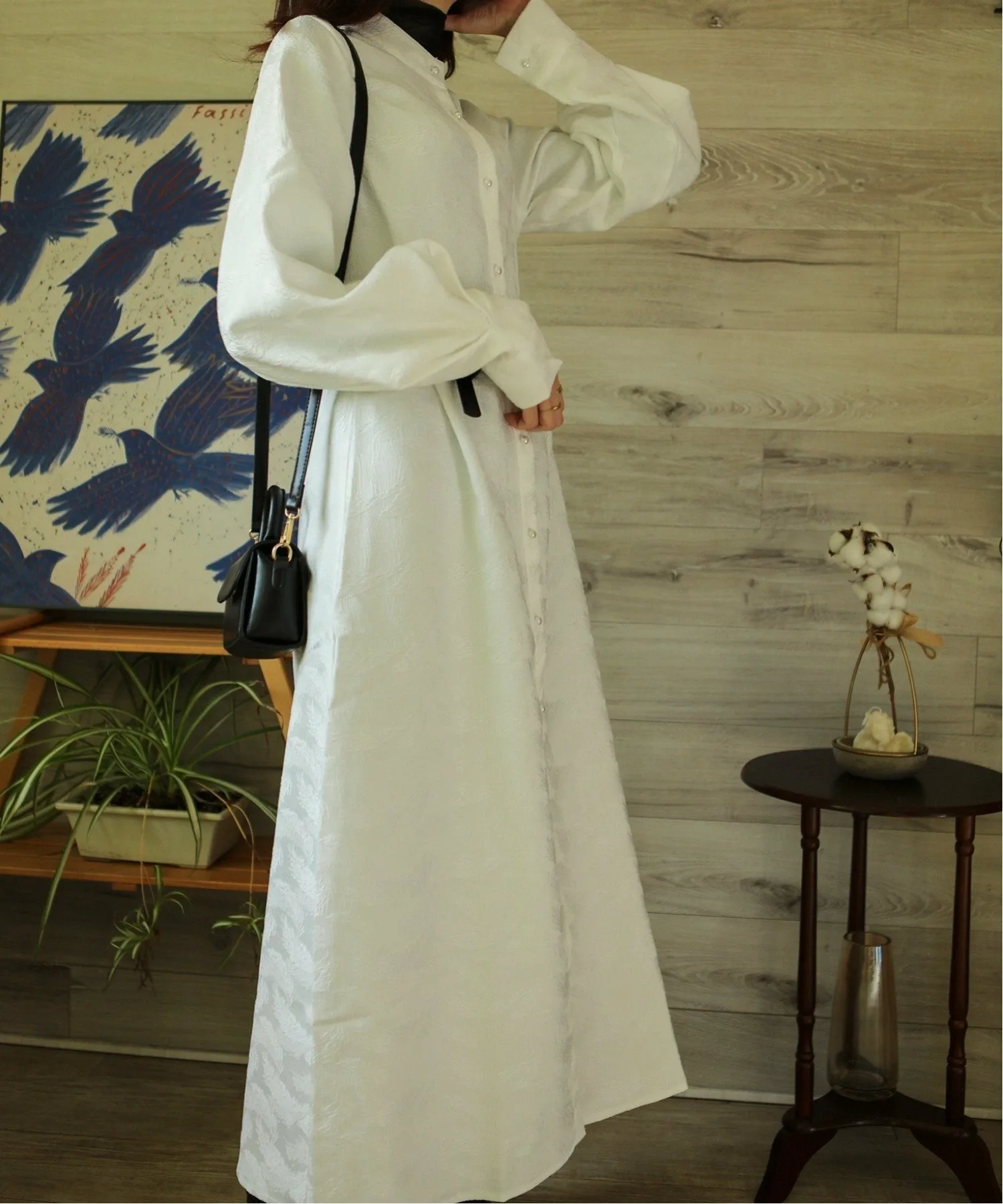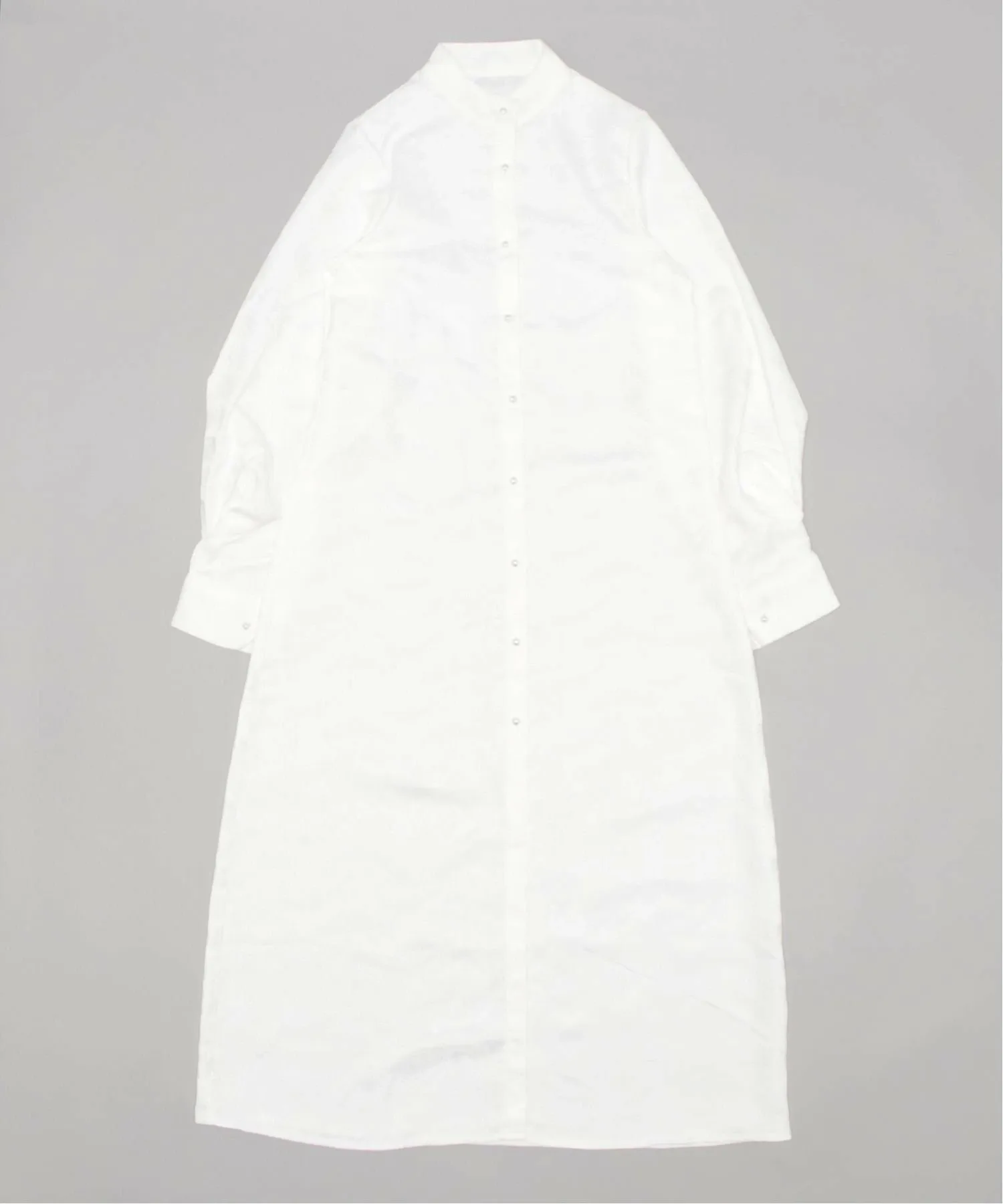 Платье-рубашка с длинными, объемными рукавами и воротником-стойкой.