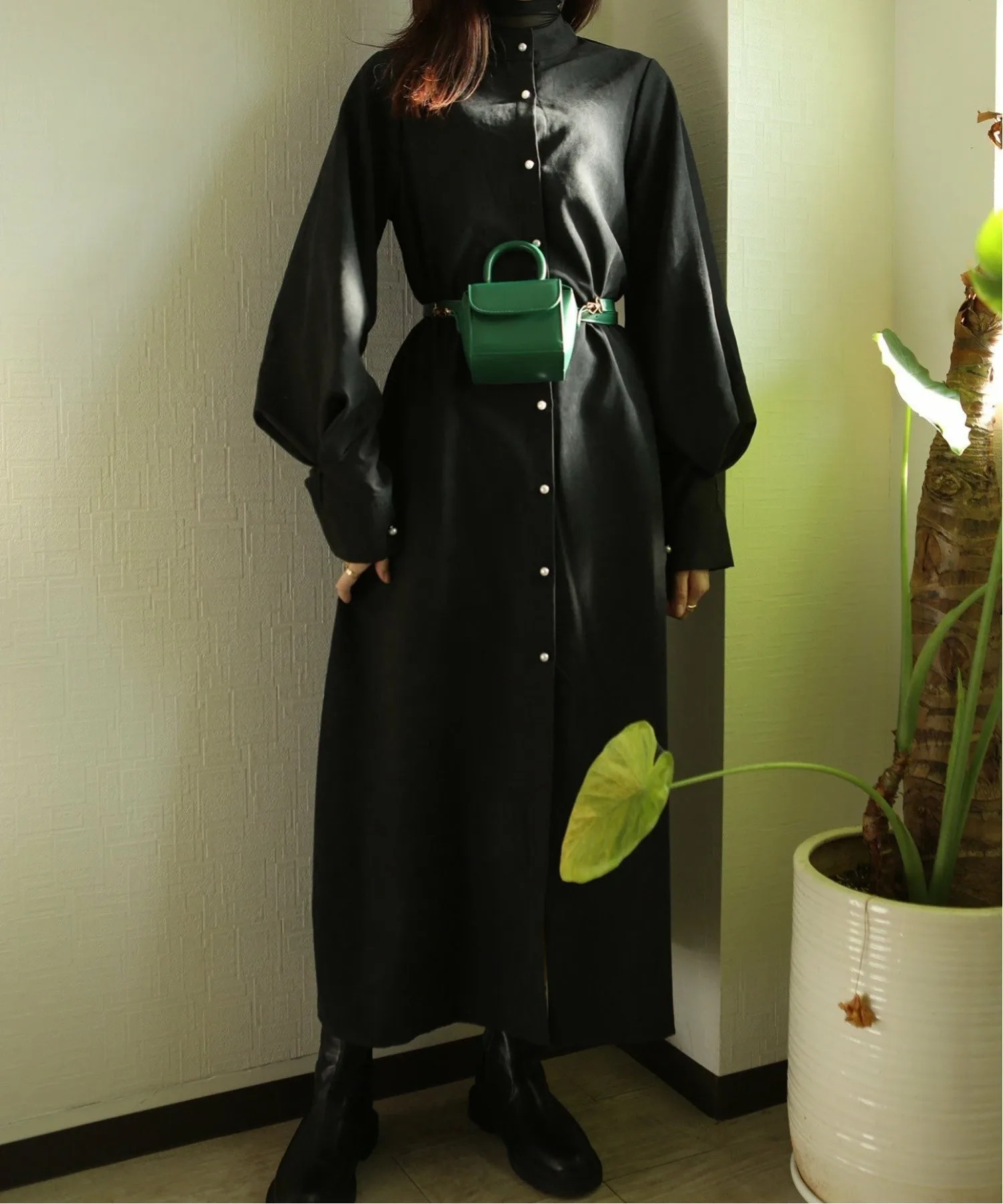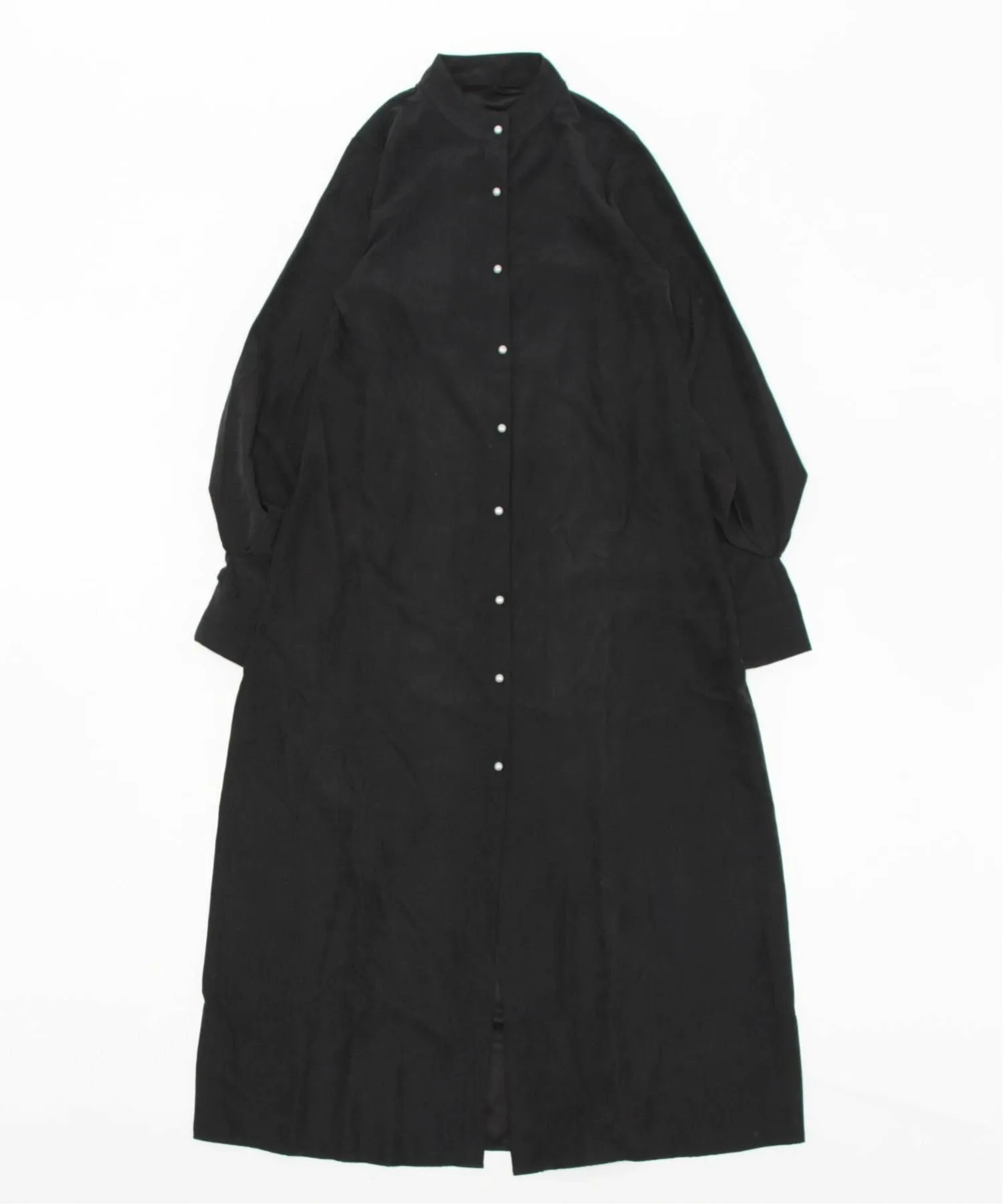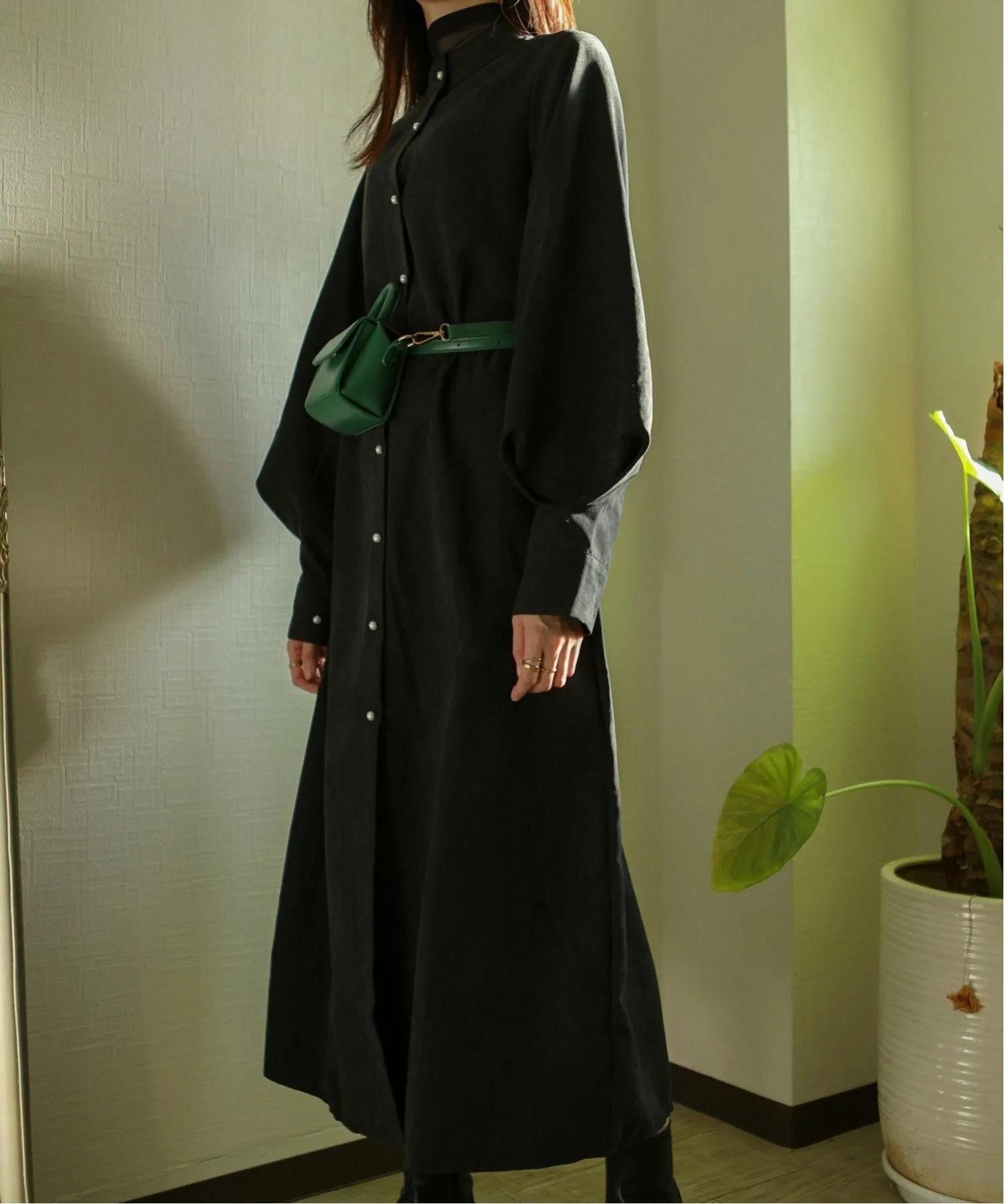 Платье-рубашка с длинными, объемными рукавами и воротником-стойкой.