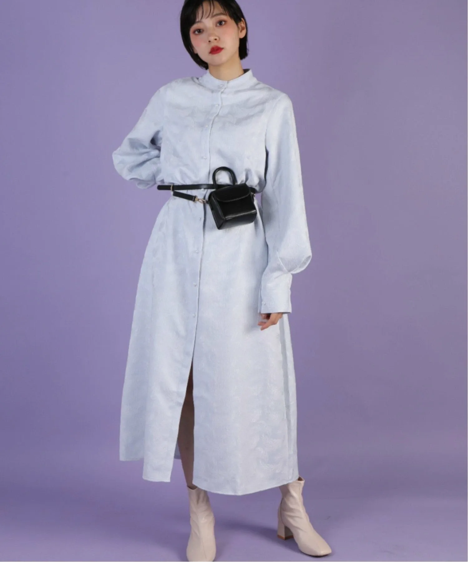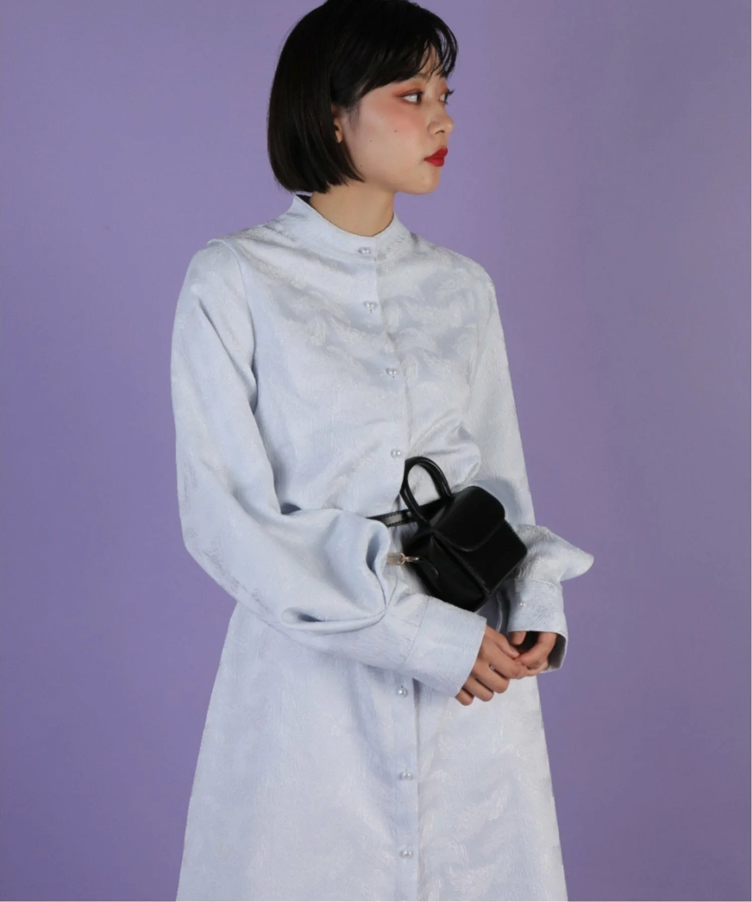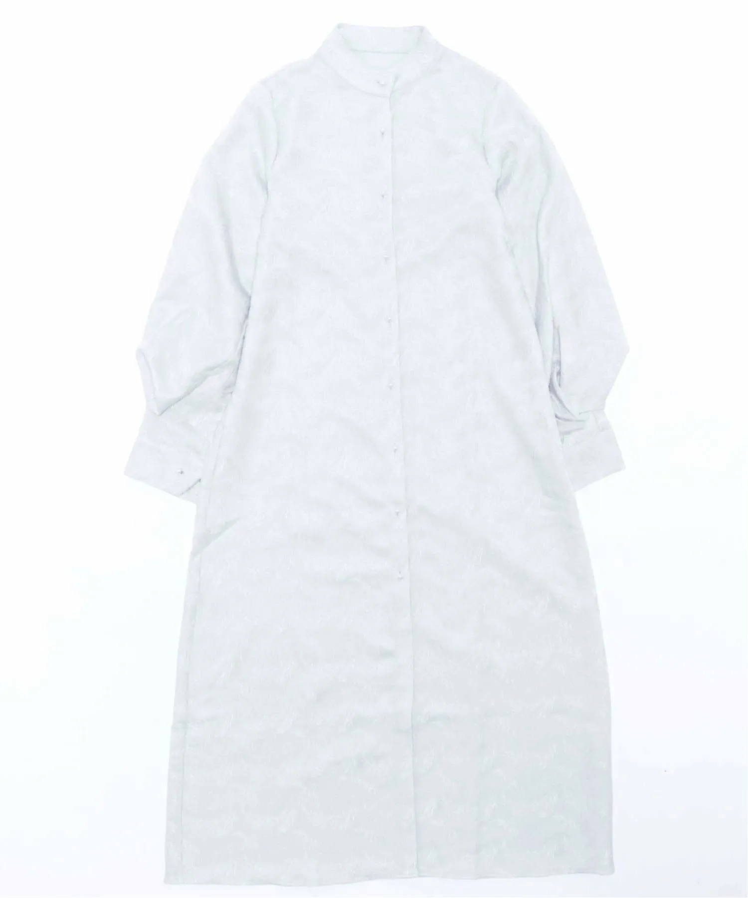 Платье-рубашка с длинными, объемными рукавами и воротником-стойкой.