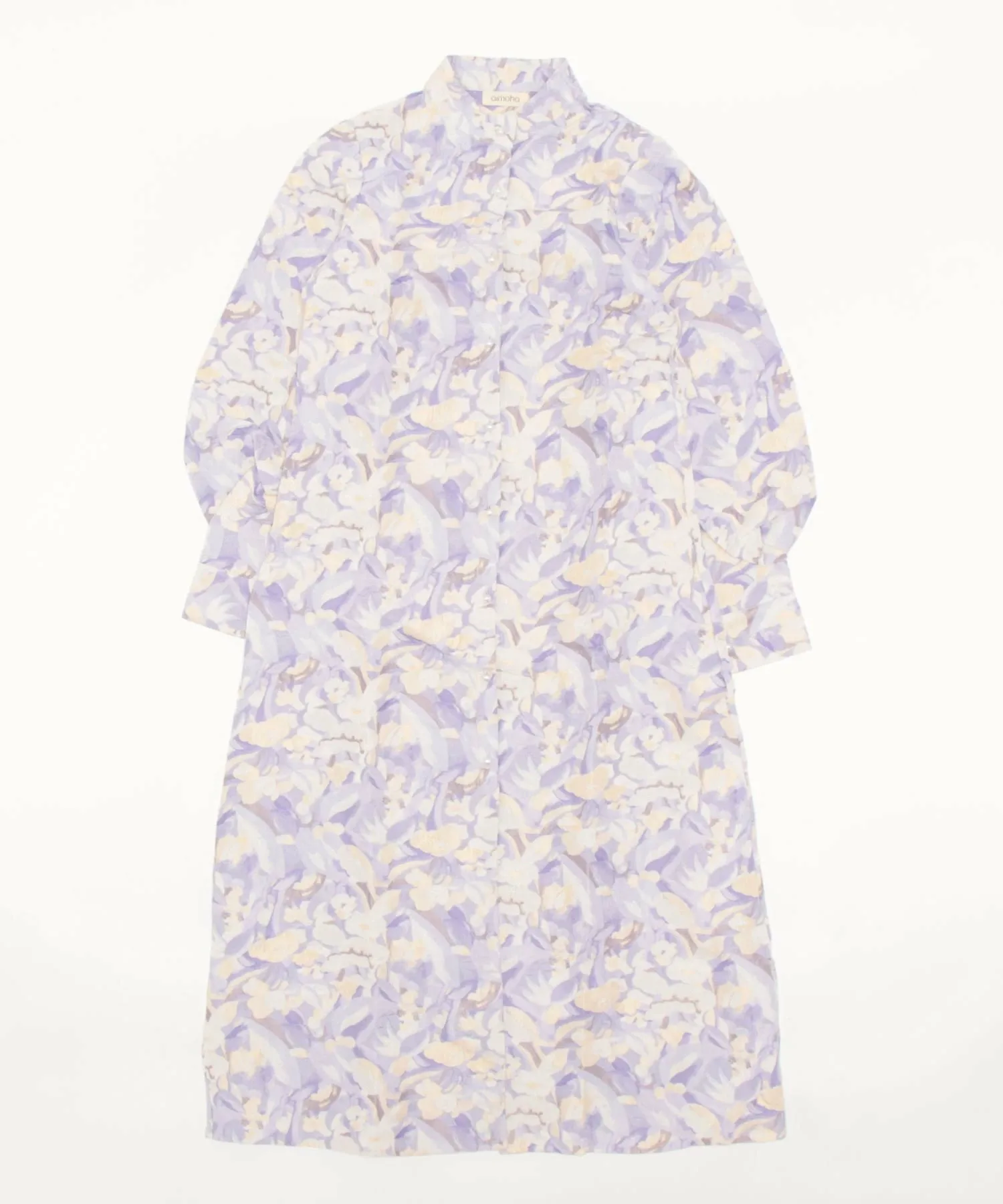 Платье-рубашка с длинными, объемными рукавами и воротником-стойкой.