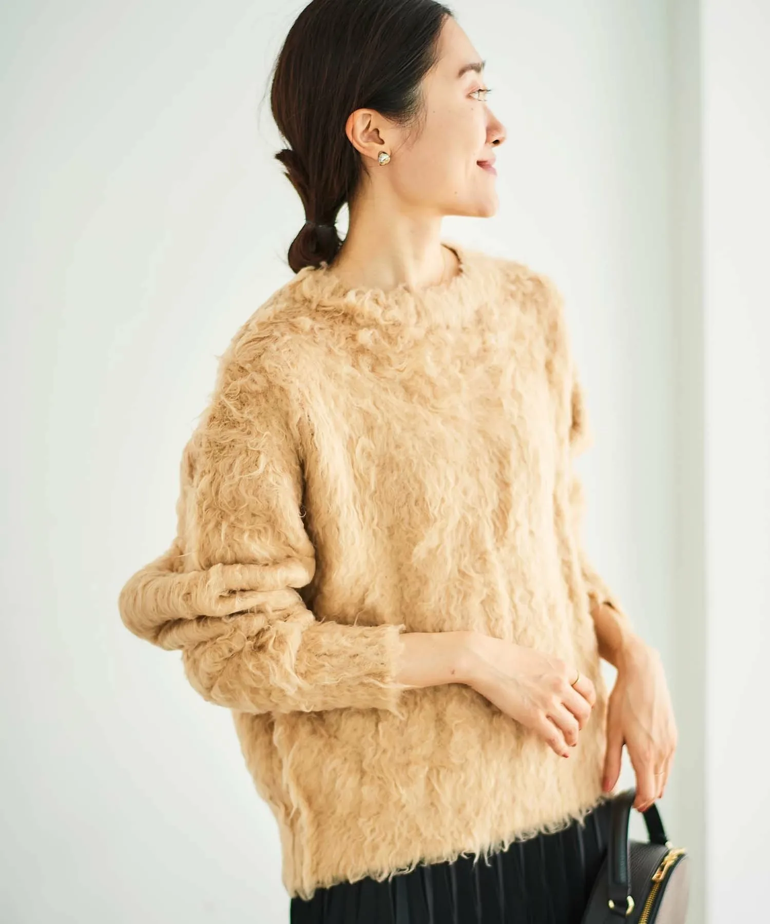 Этот пуловер из букле с его пушистой текстурой излучает сезонное настроение.