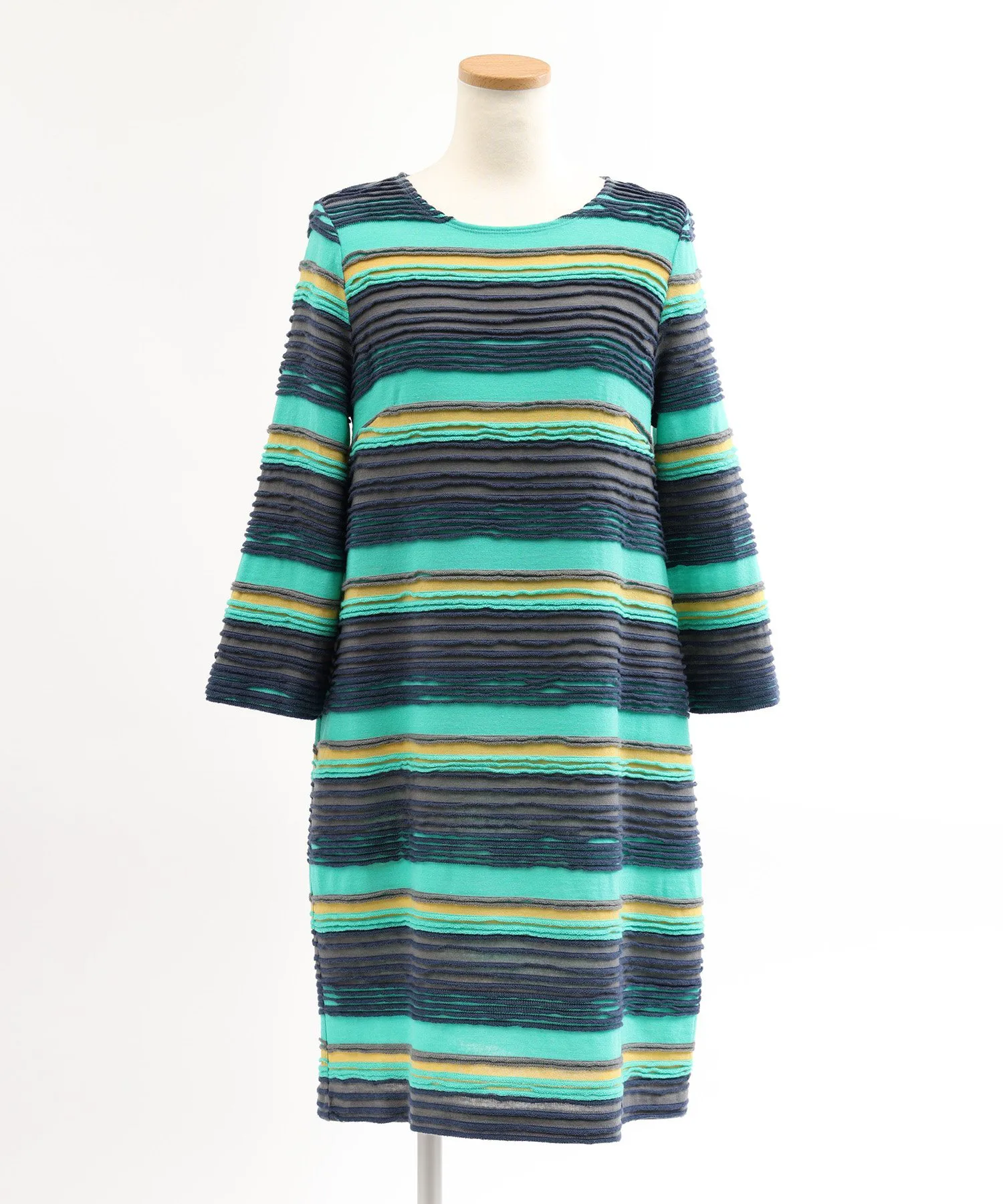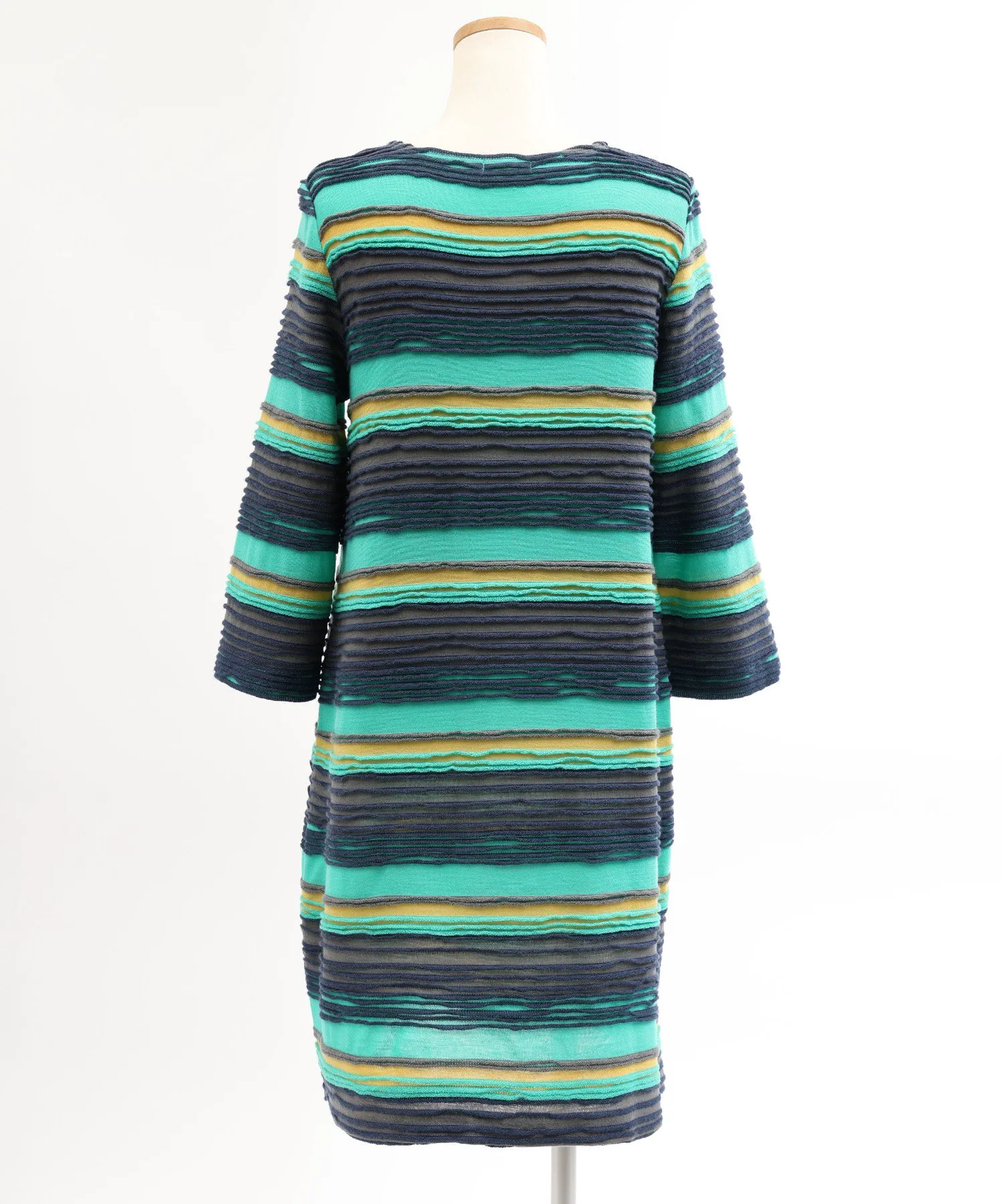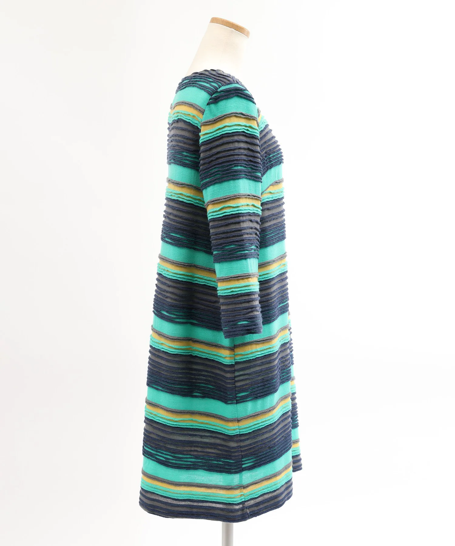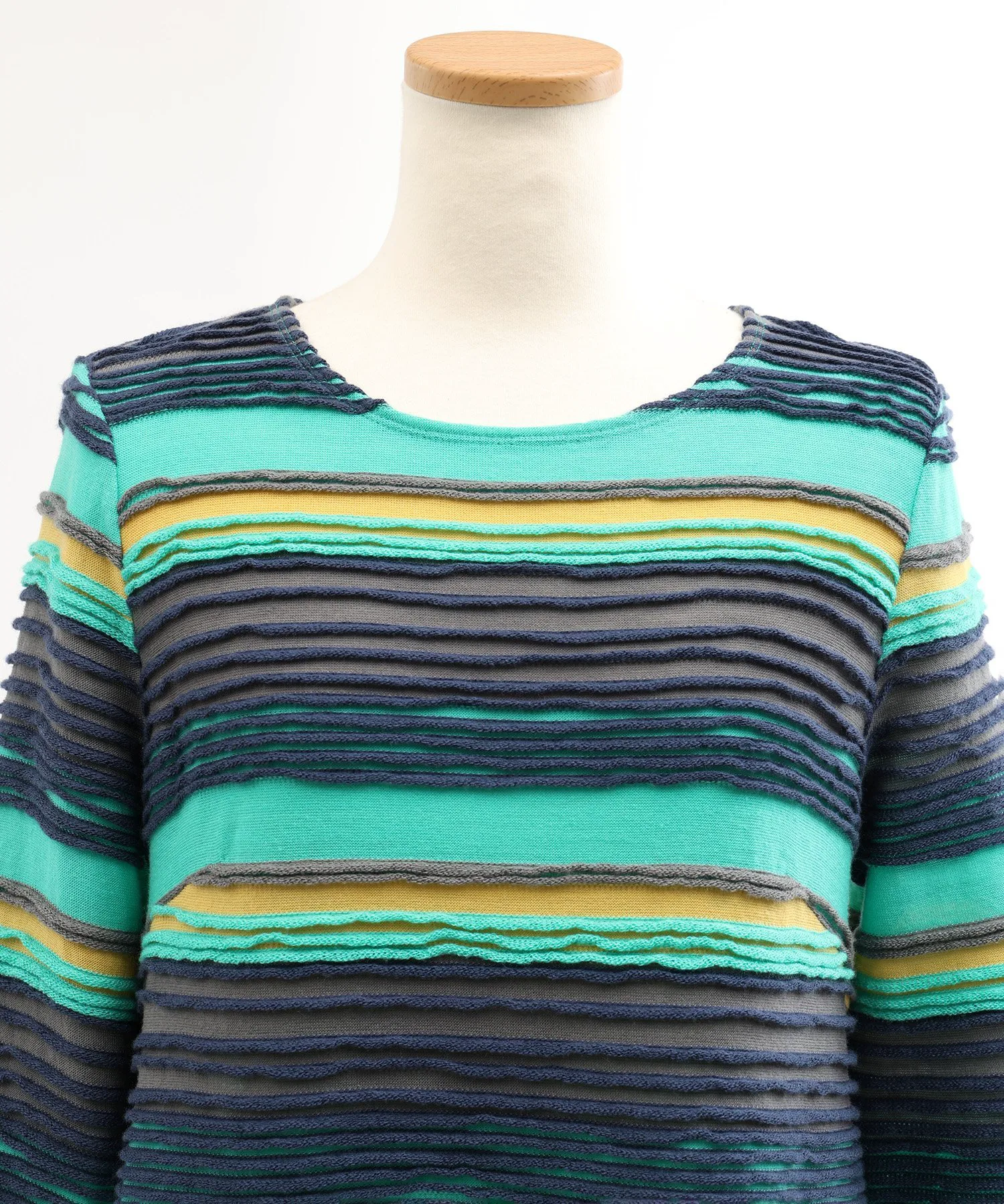 Оригинальный полосатый материал Tavassa, связанный из четырех цветов пряжи с использованием техники вязания с защипами и трикотажного вязания.