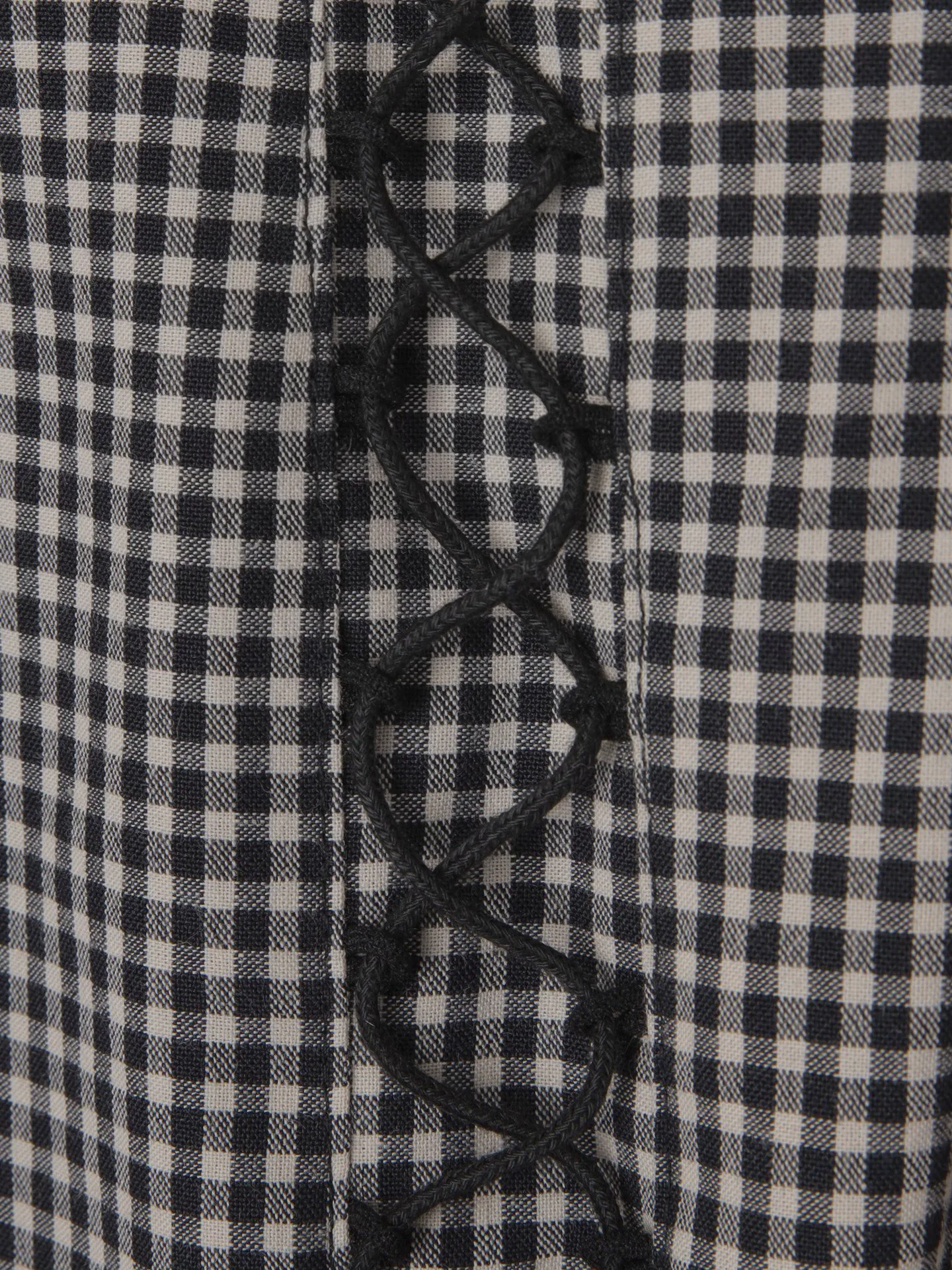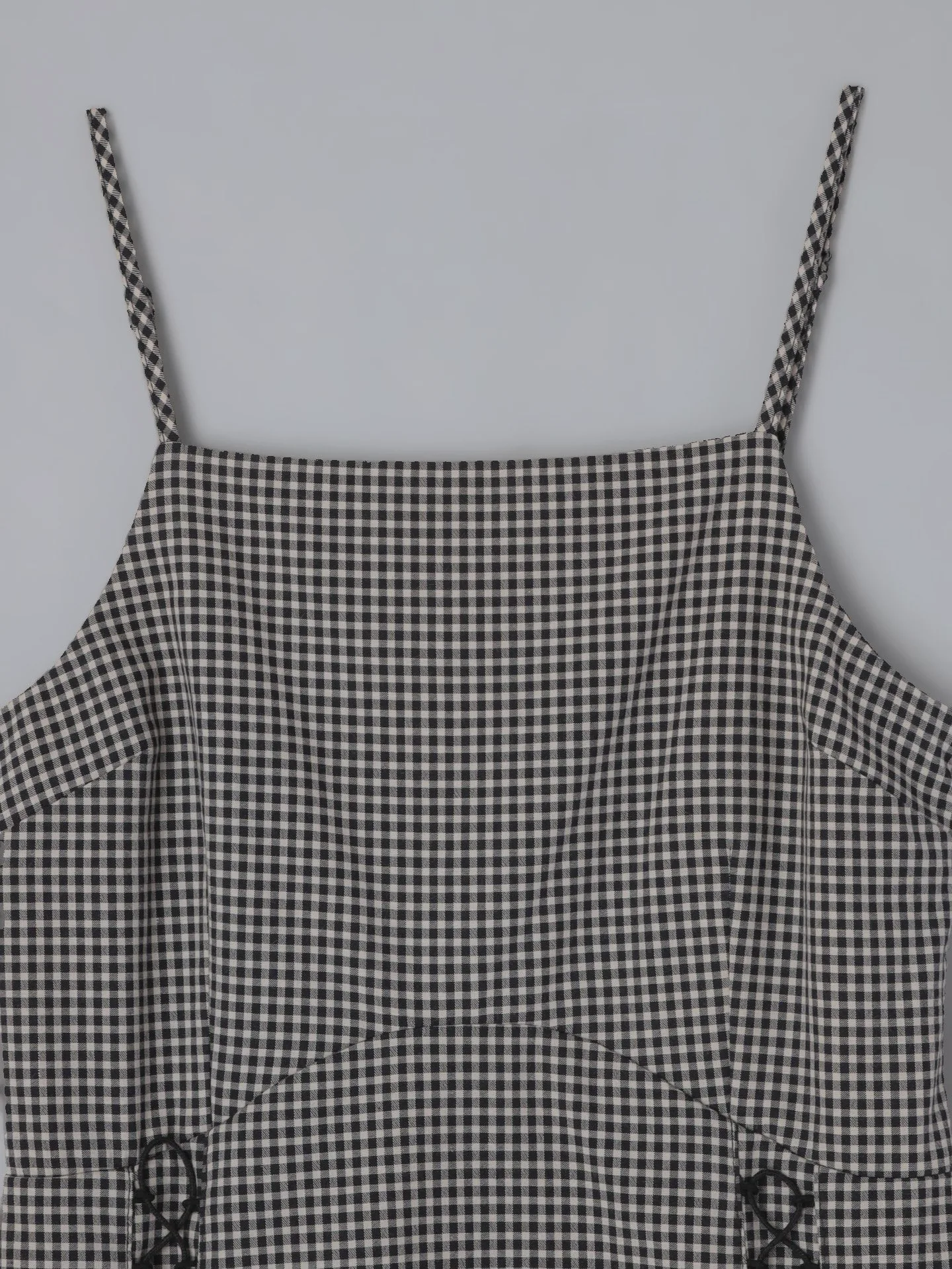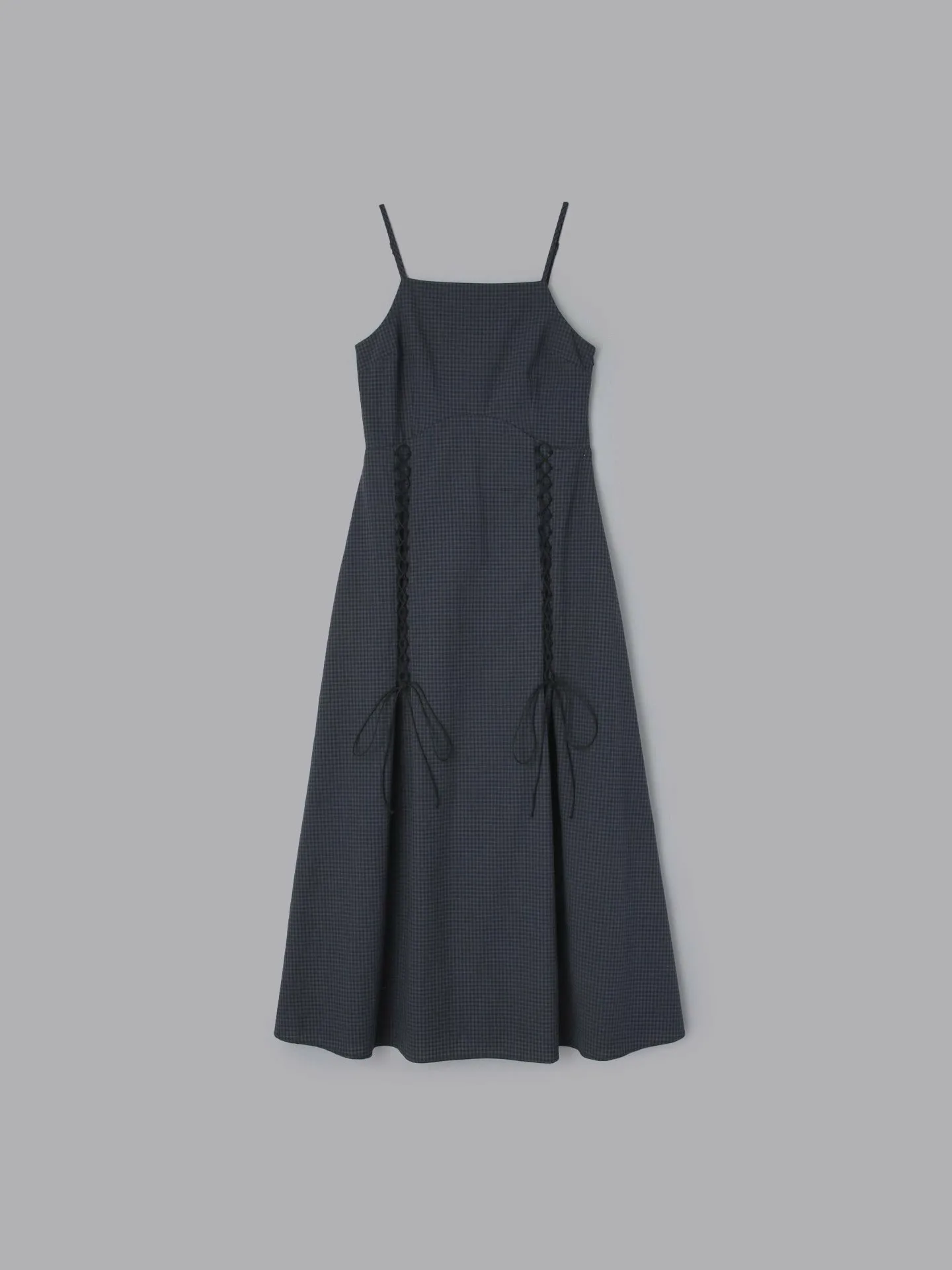 Это длинное платье-майка в клетку имеет шнуровку, которая добавляет ему очарования.