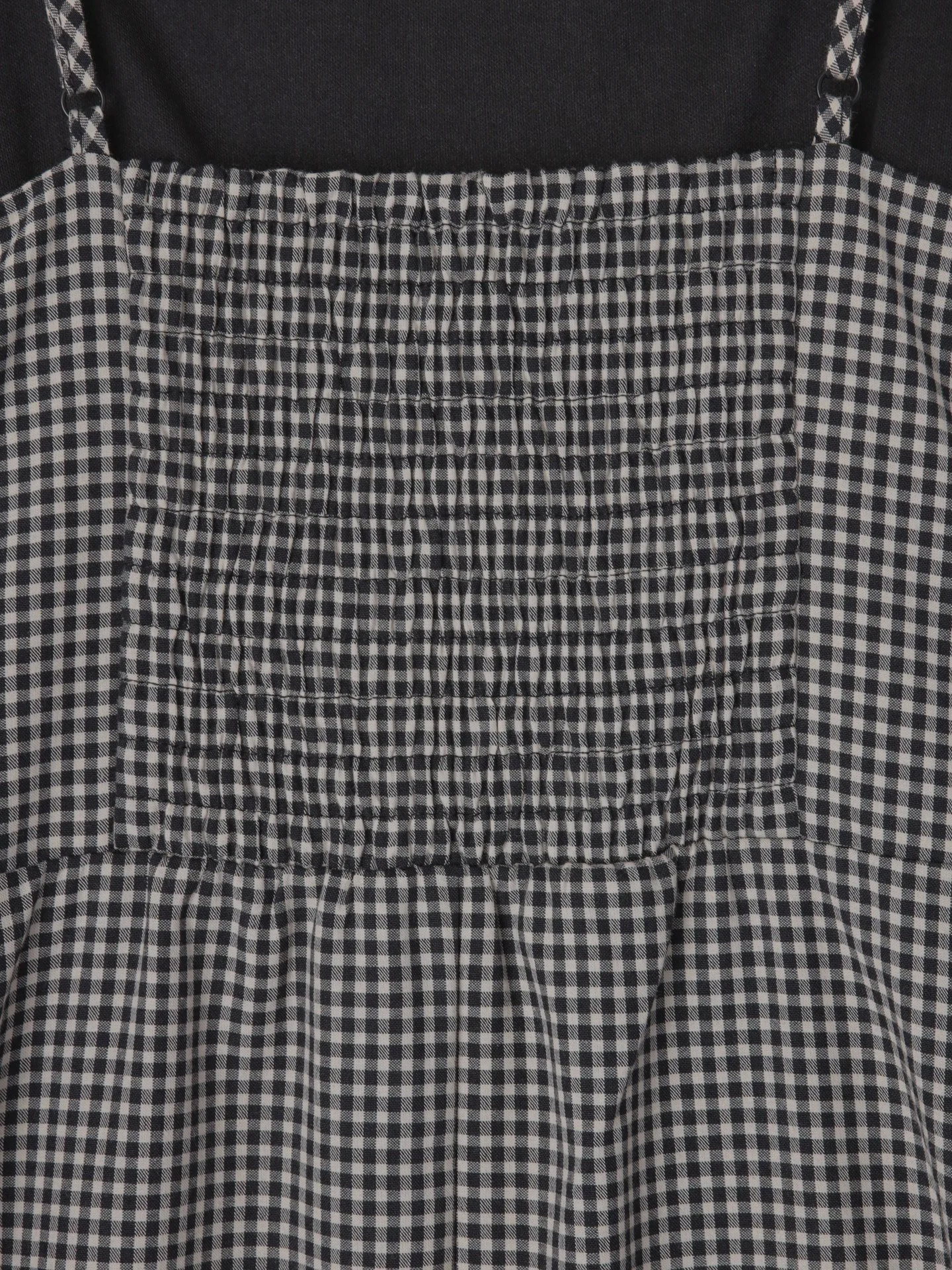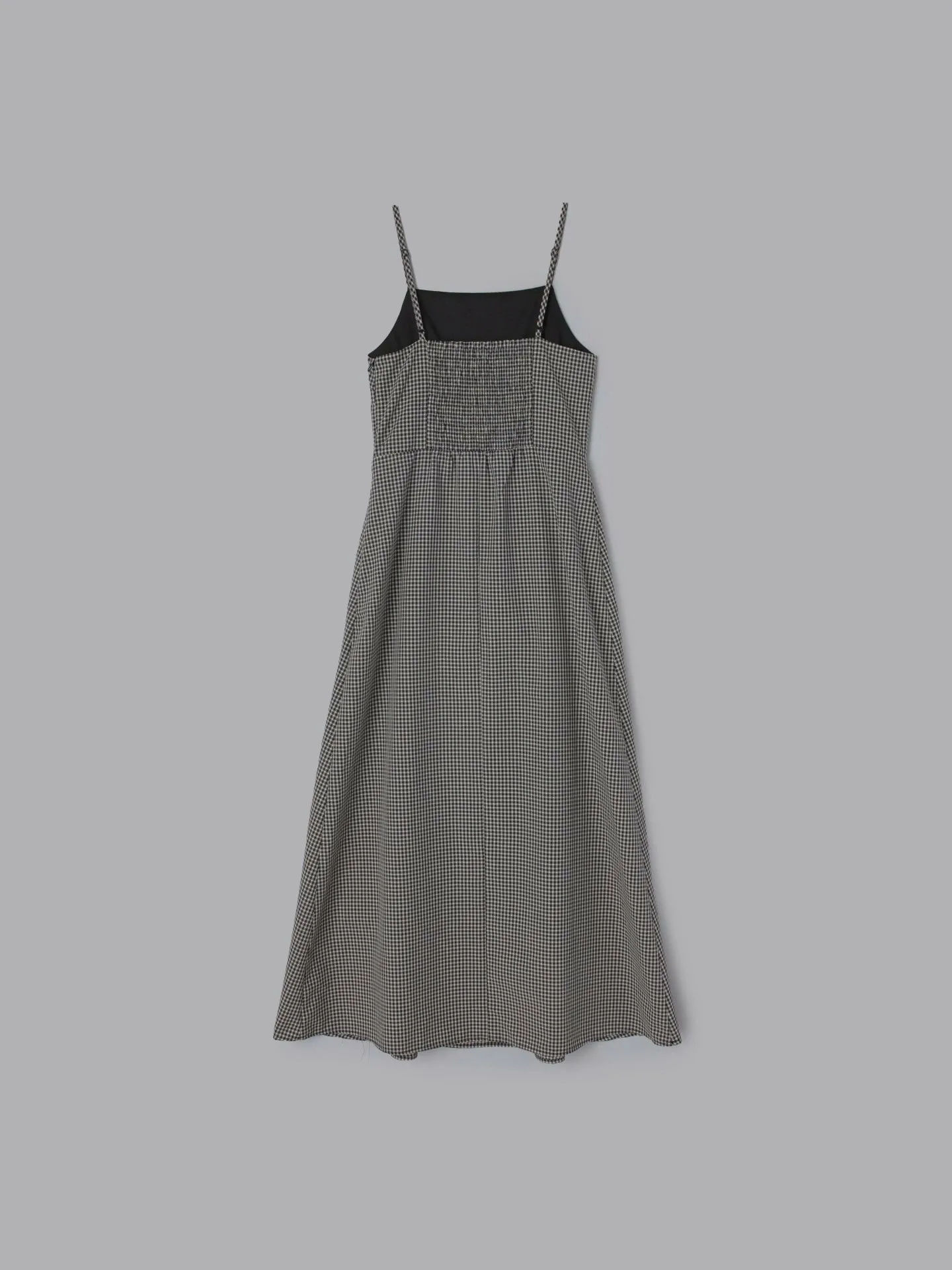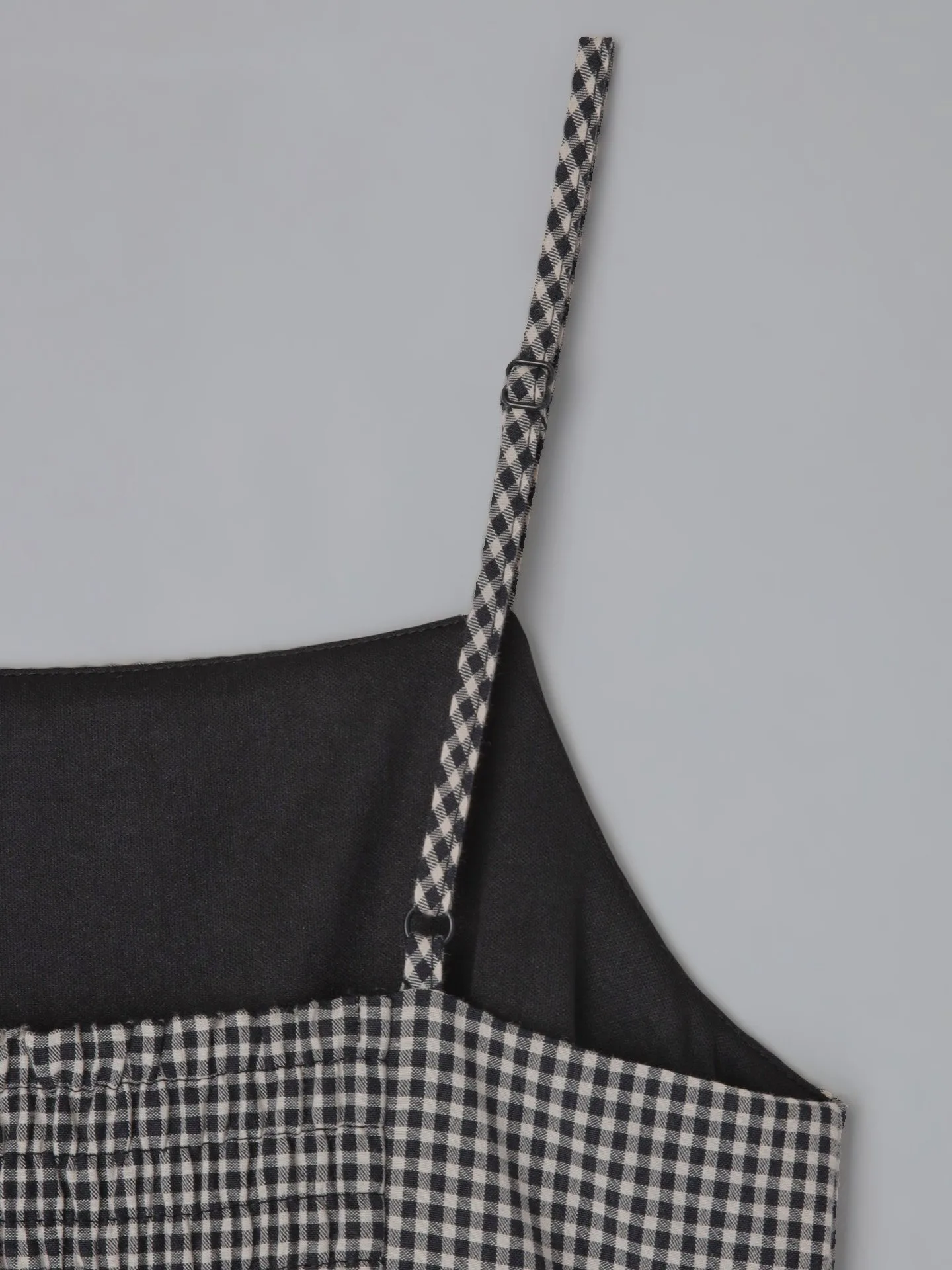 Это длинное платье-майка в клетку имеет шнуровку, которая добавляет ему очарования.