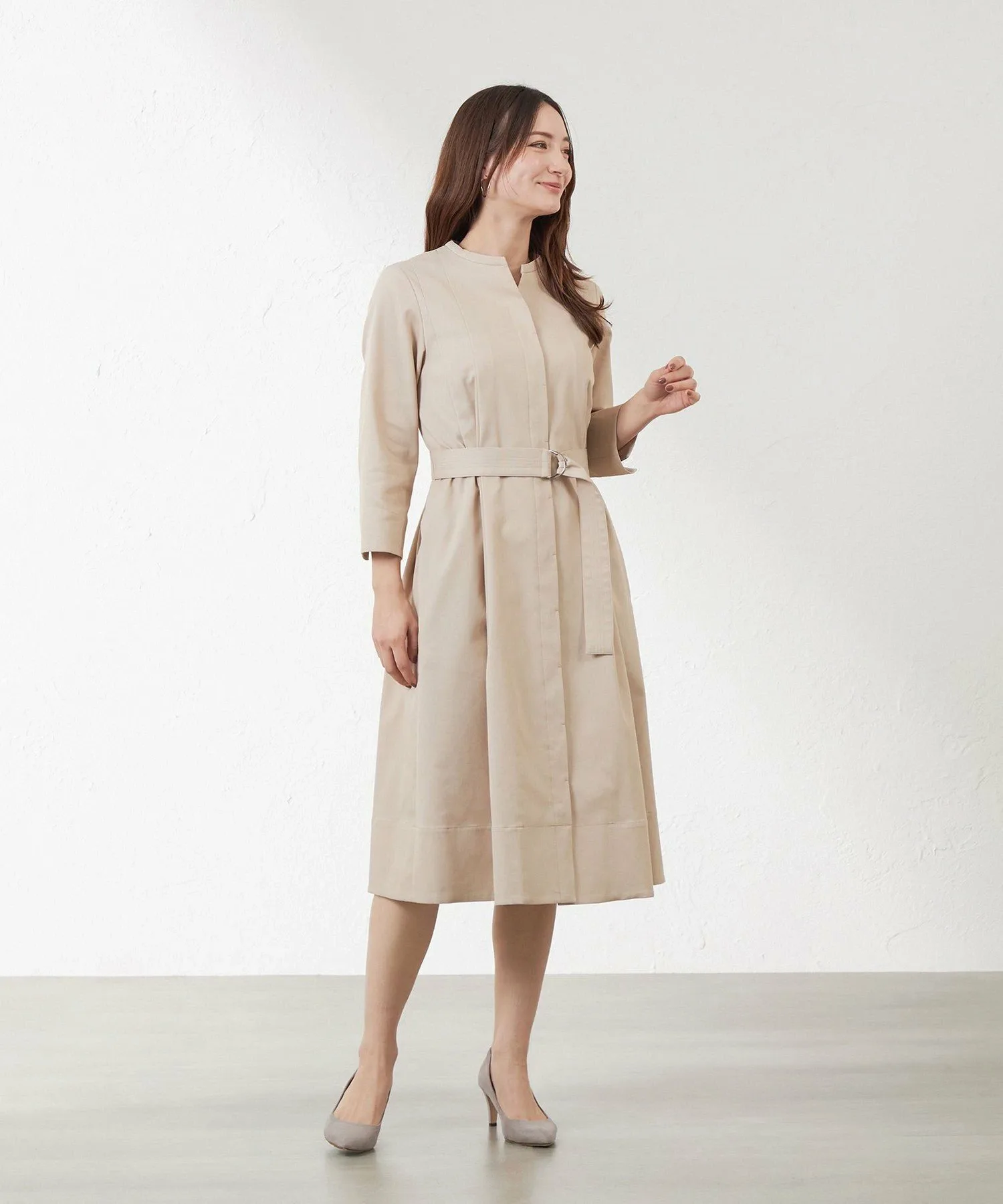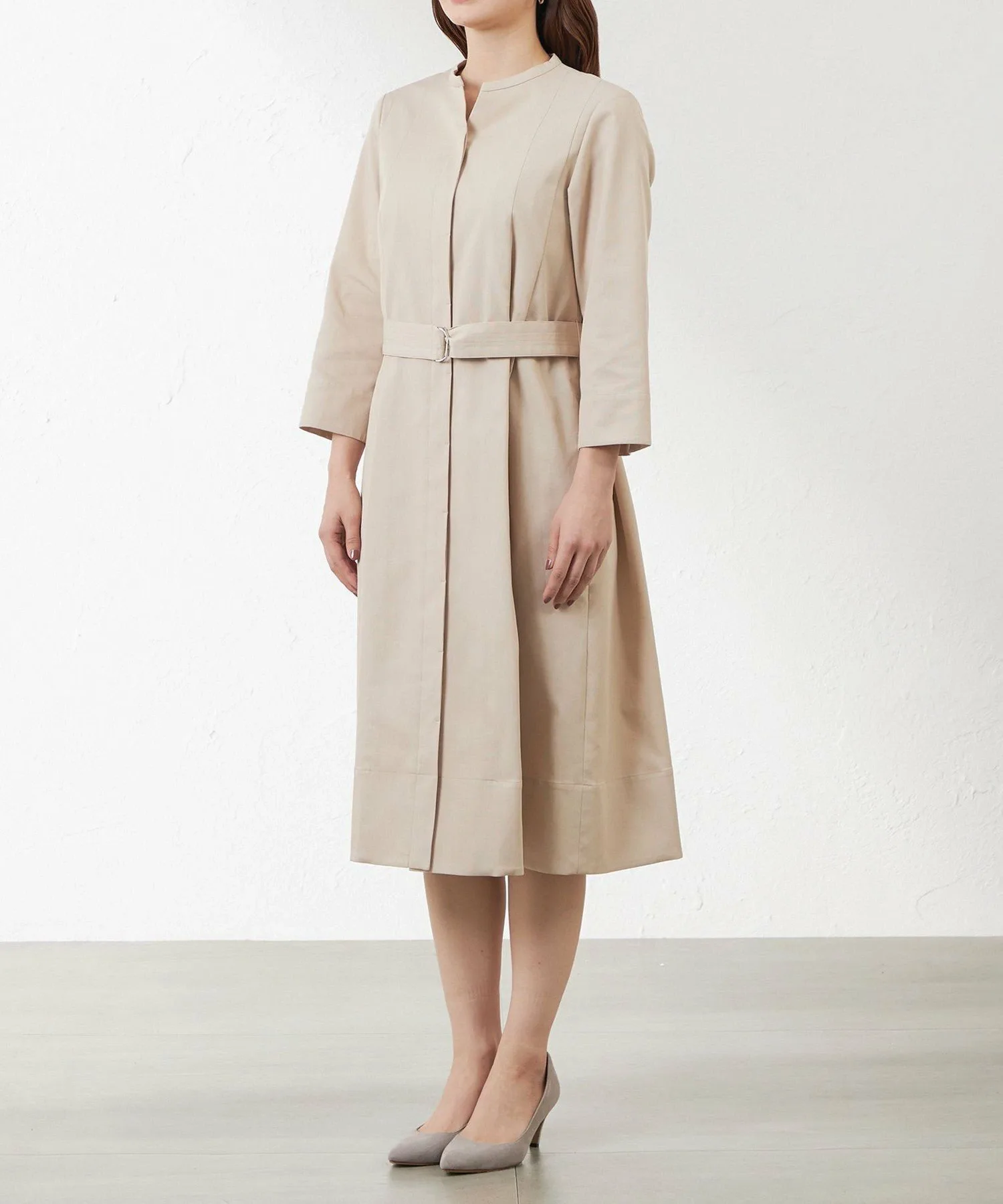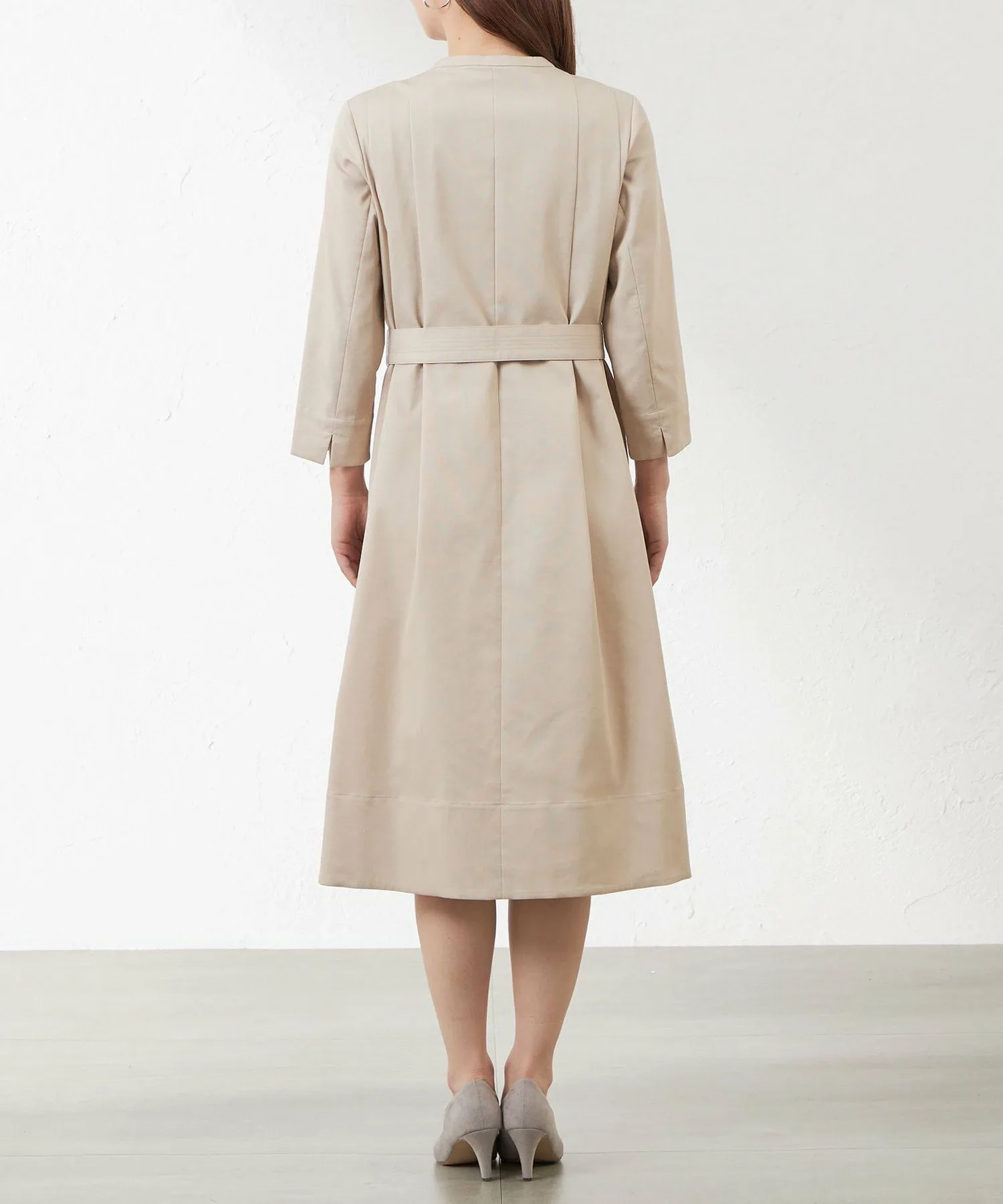 Это платье-скиппер. Прочная ткань позволяет использовать его как платье-пальто. Складки спереди открываются ниже талии. Тщательно разработанный крой создает красивый силуэт при ношении пояса.