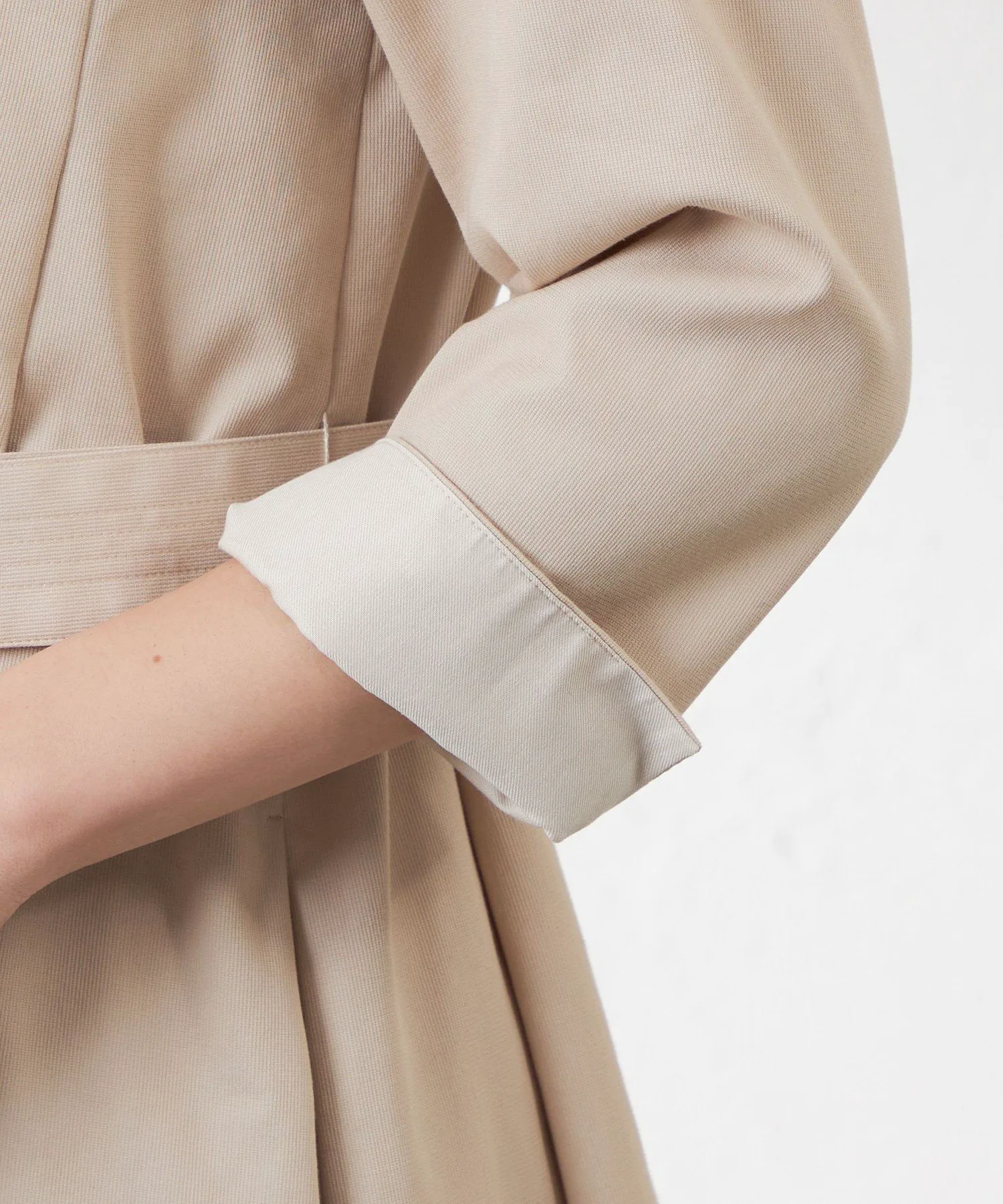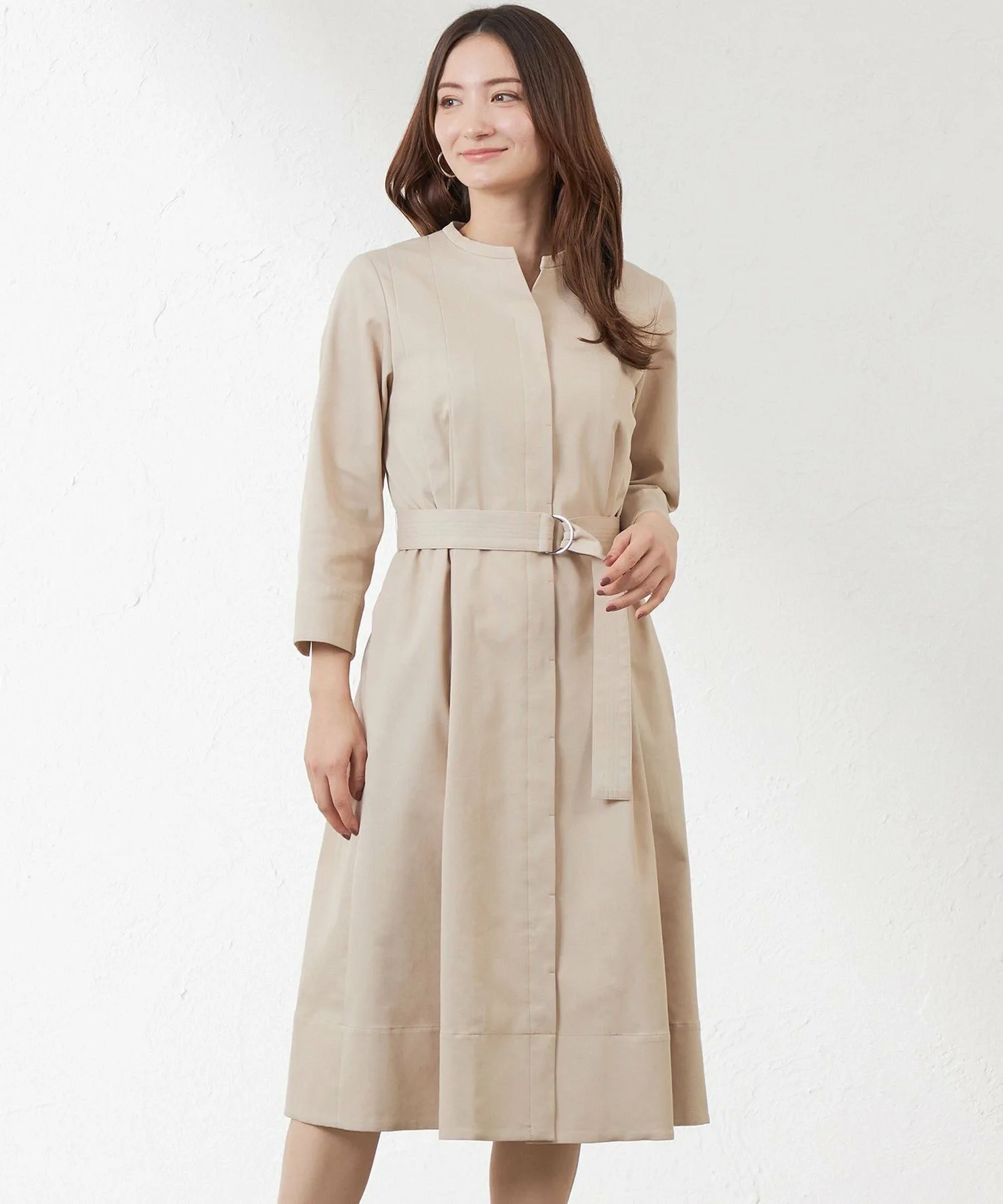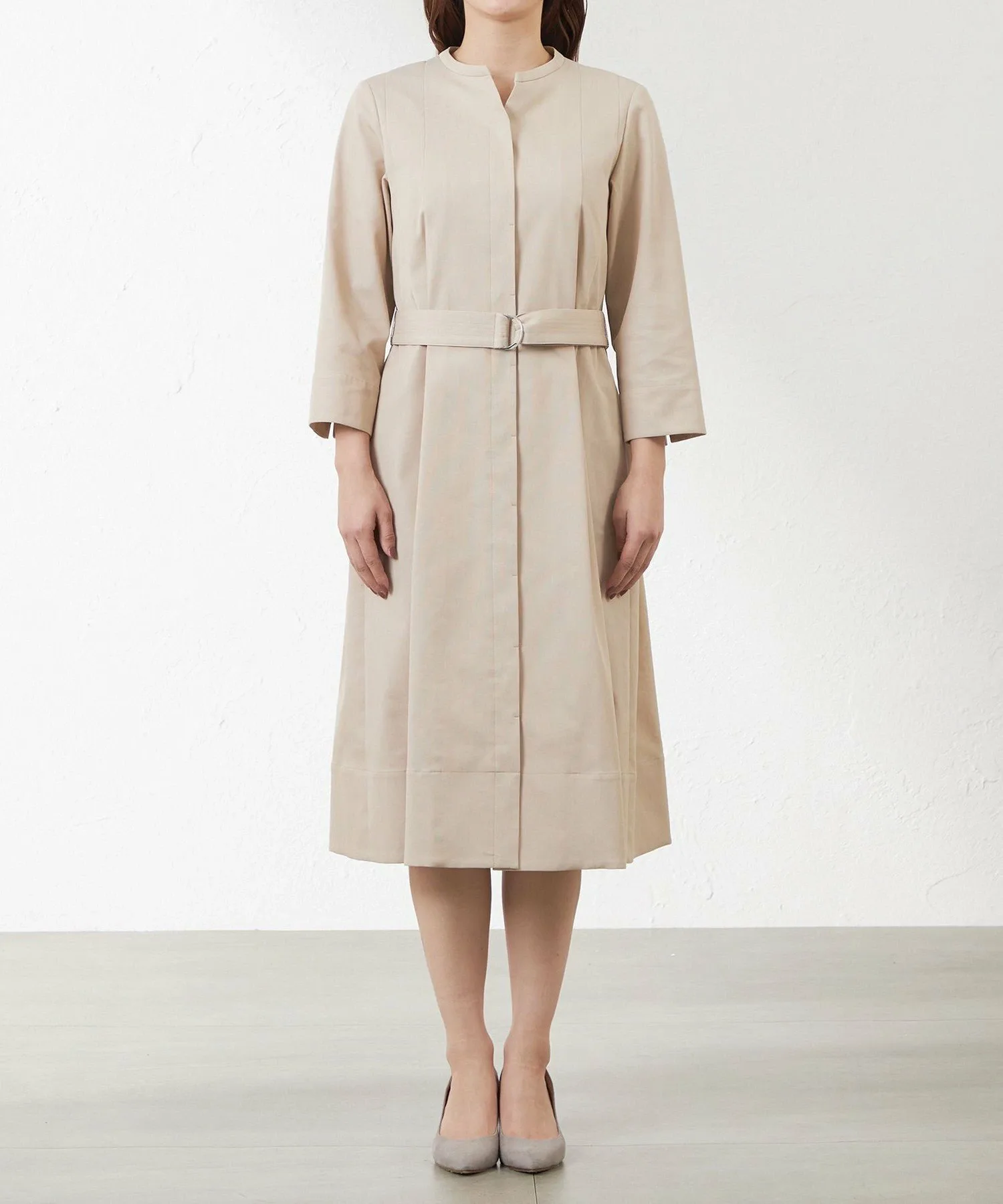 Это платье-скиппер. Прочная ткань позволяет использовать его как платье-пальто. Складки спереди открываются ниже талии. Тщательно разработанный крой создает красивый силуэт при ношении пояса.