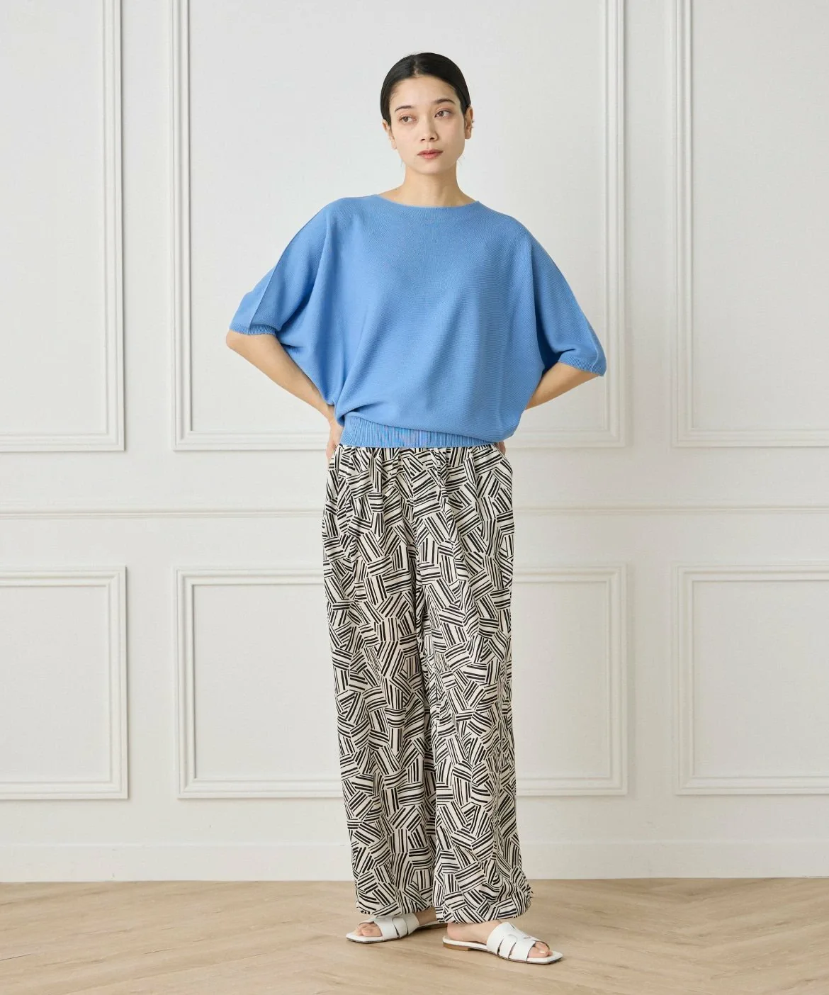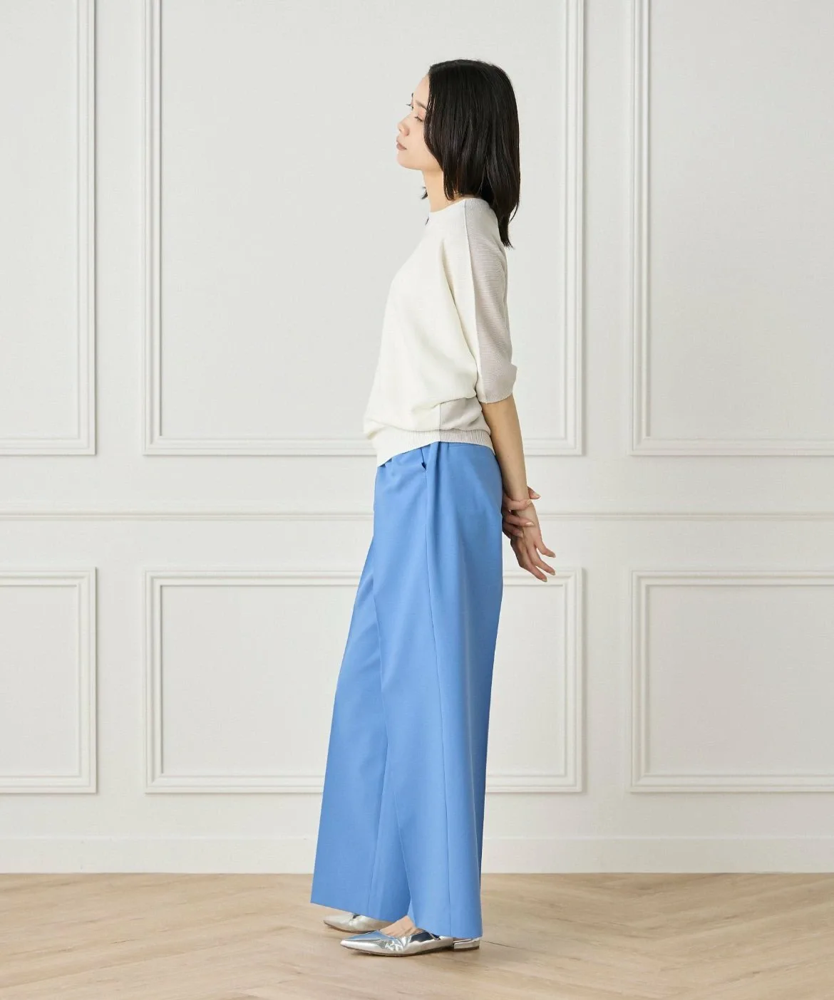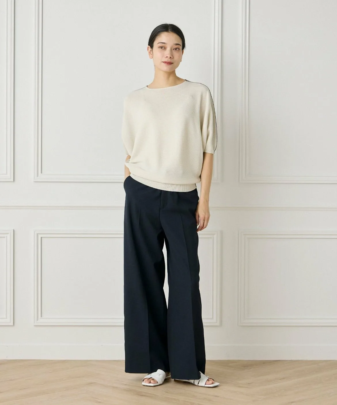 Бесшовный трикотаж, связанный на первой в мире бесшовной плосковязальной машине, разработанной эксклюзивно компанией Shima Seiki Mfg. Co., Ltd. Это усиливает естественное ощущение и легкость трикотажа, улучшает драпировку и устраняет швы, которые могут вызывать жесткость, обеспечивая более комфортную посадку.