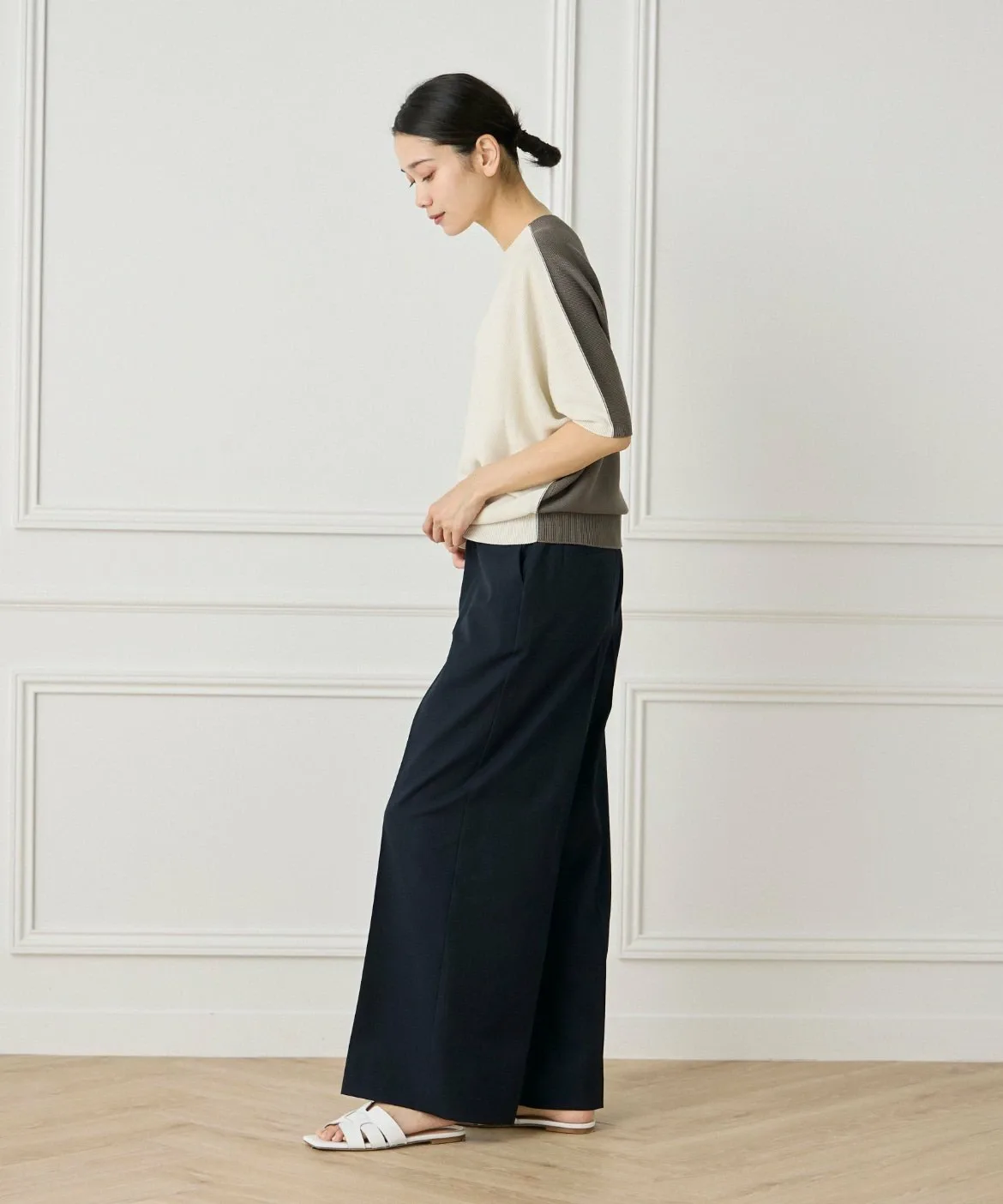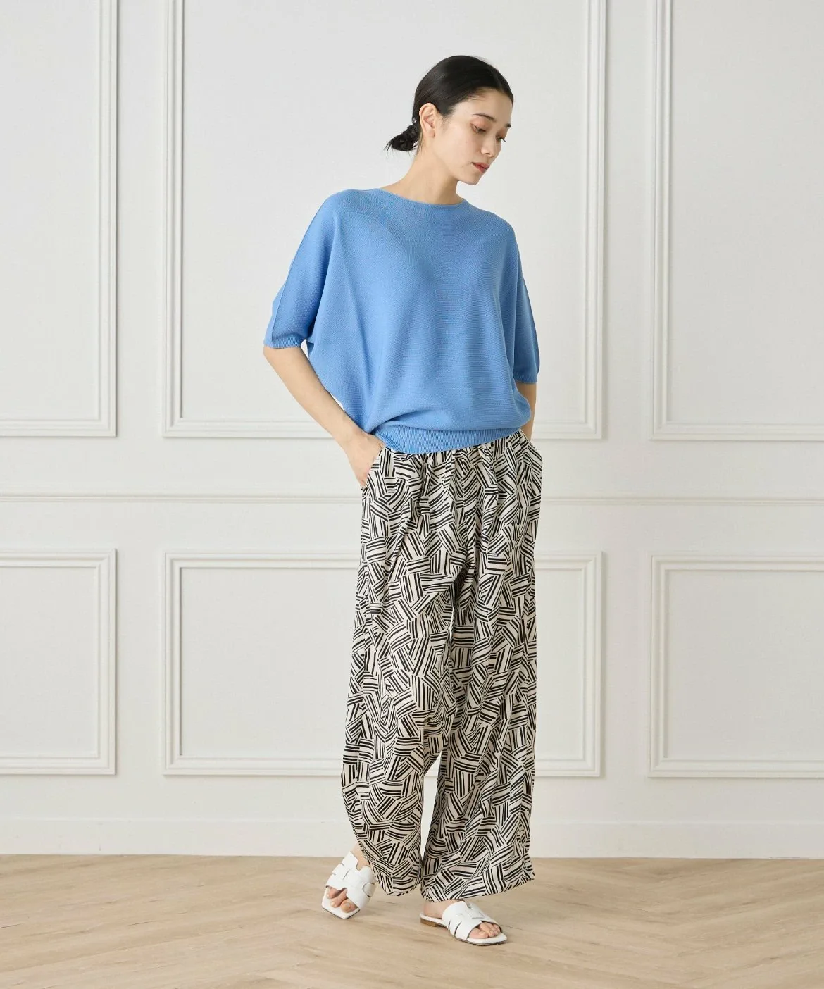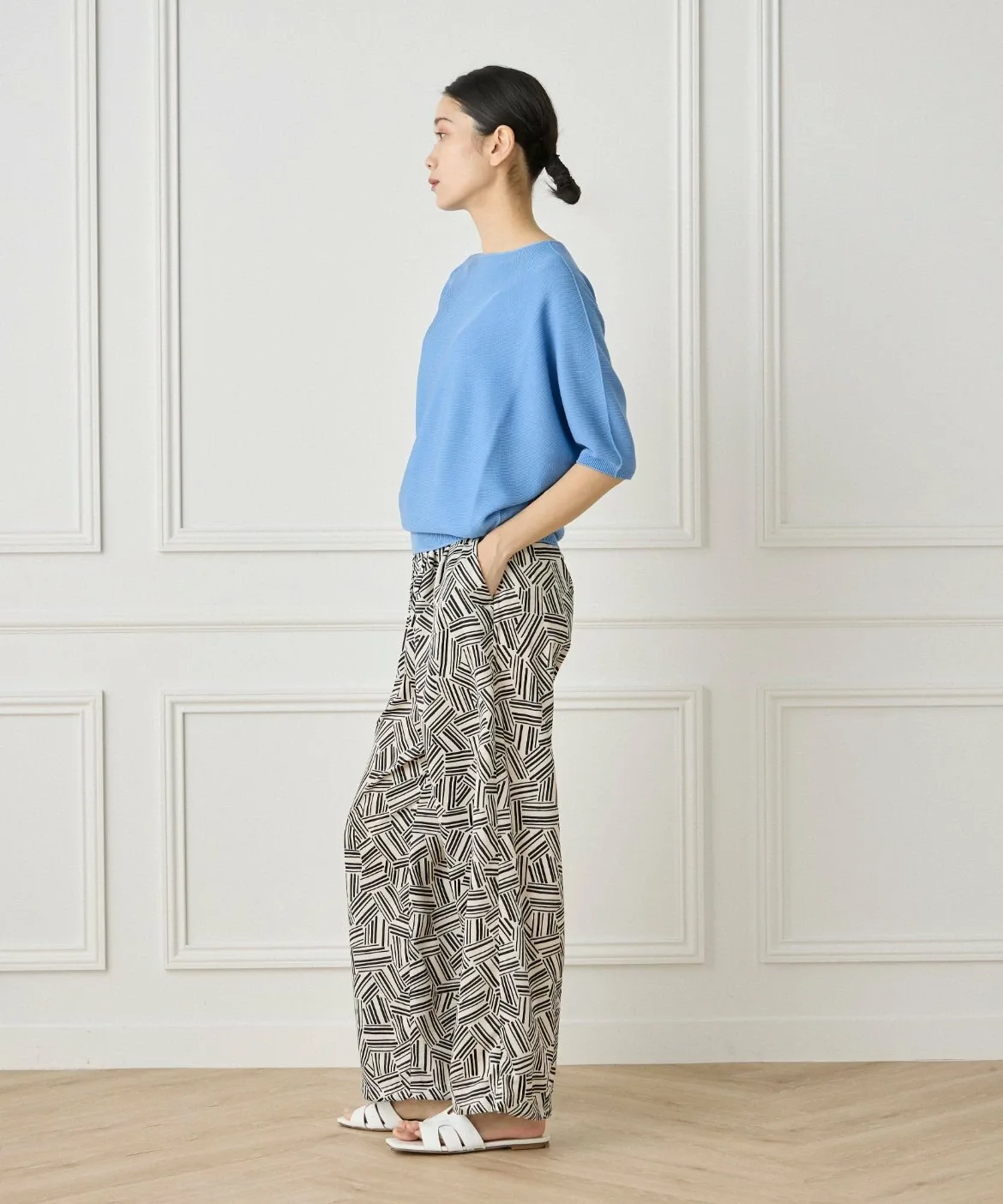 Бесшовный трикотаж, связанный на первой в мире бесшовной плосковязальной машине, разработанной эксклюзивно компанией Shima Seiki Mfg. Co., Ltd. Это усиливает естественное ощущение и легкость трикотажа, улучшает драпировку и устраняет швы, которые могут вызывать жесткость, обеспечивая более комфортную посадку.