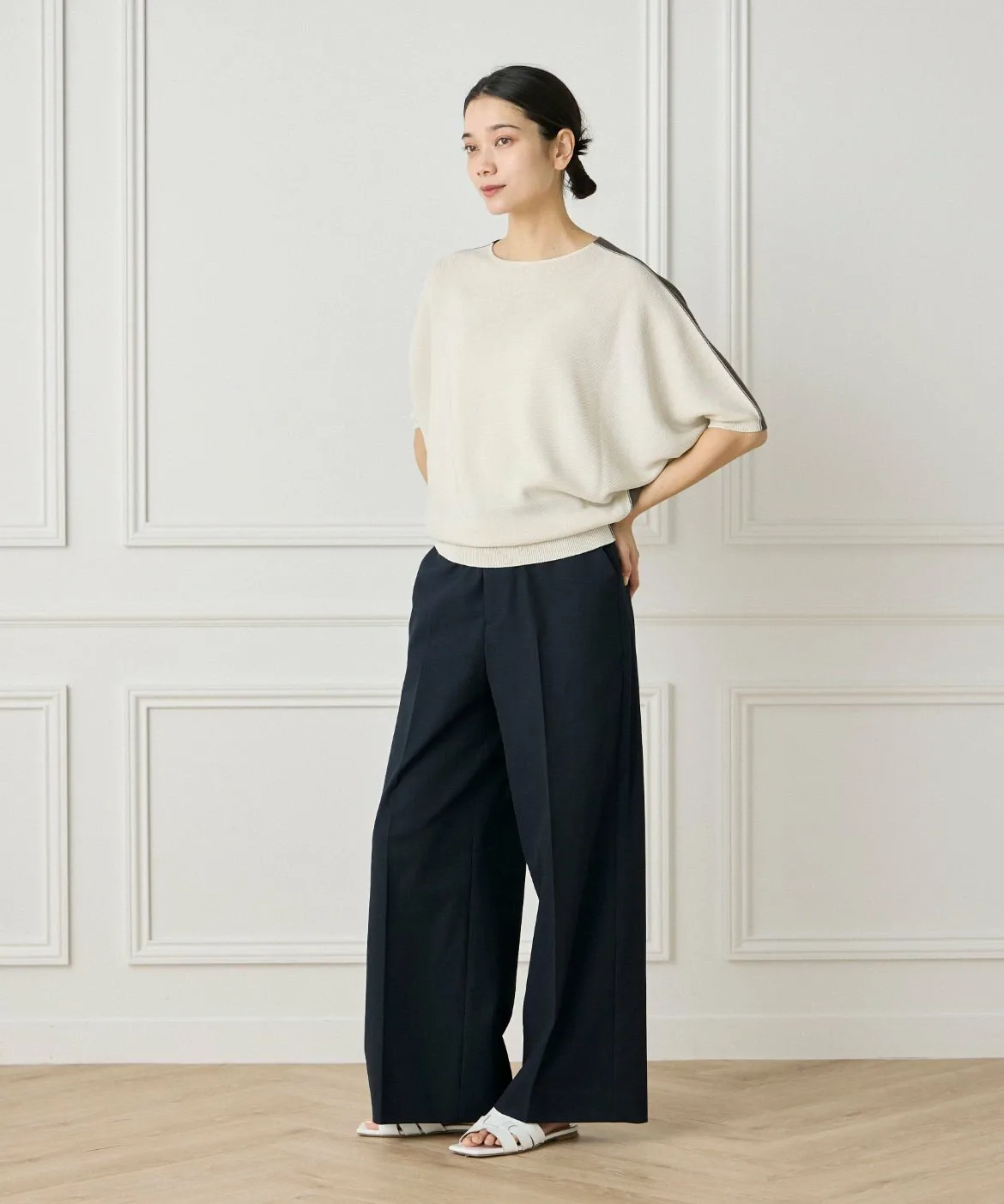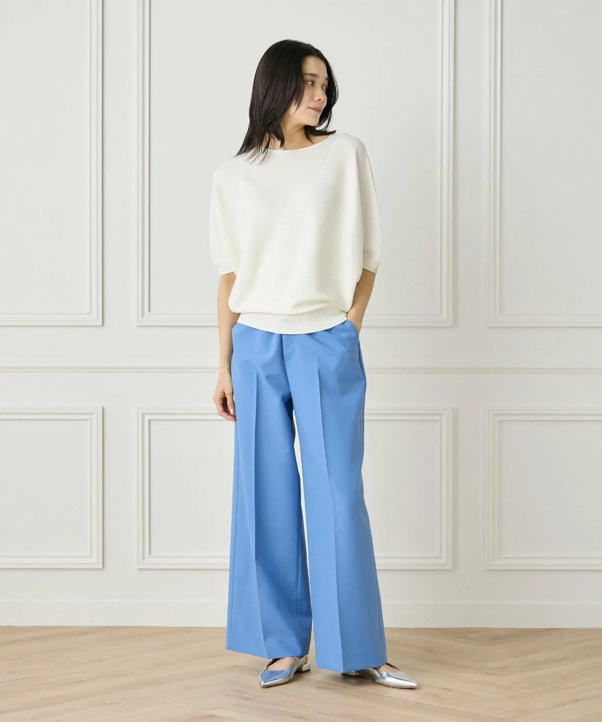 Вязаный пуловер свободного силуэта, связанный с использованием бесшовной техники WHOLEGARMENT. Вырез горловины и драпированный силуэт тщательно продуманы, чтобы создать изделие, сочетающее в себе женскую элегантность и изысканность.