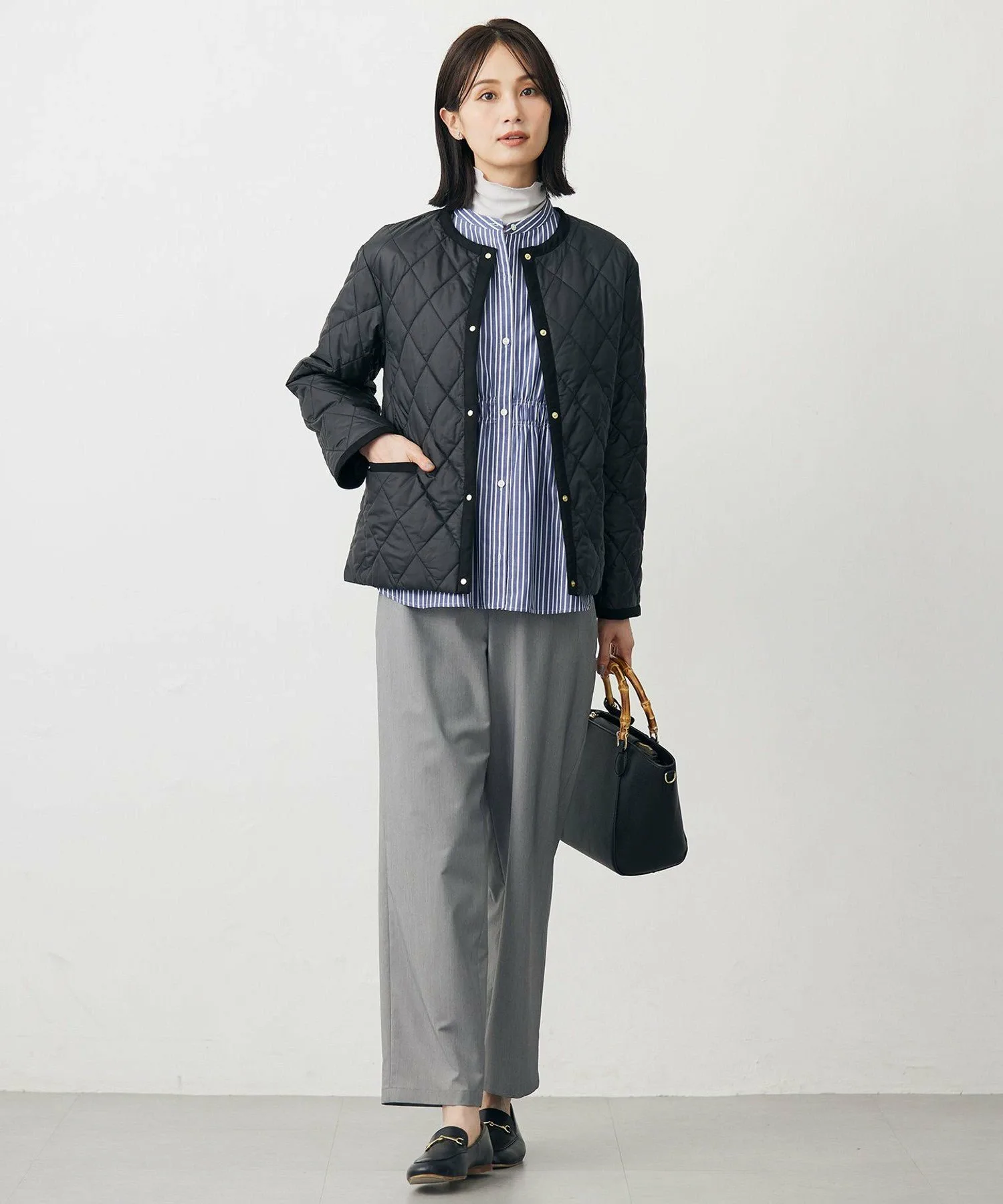 Дизайн: Эта укороченная блузон сочетает в себе легкость и тепло. Умеренный объем защищает от холодного ветра, оставаясь при этом легкой и комфортной. Это универсальная вещь, которую можно носить в любое время года, от начала осени до начала зимы. Планка украшена точечными пуговицами и замшевым материалом, добавляя тонкий акцент к простому дизайну. Это надежная верхняя одежда, которую легко сочетать как с повседневной, так и с нарядной одеждой. Полностью на подкладке. Доступна в пяти цветах: слоновая кость (#002), сочетающая элегантность и естественность; сланцево-коричневый (#004), обладающий сдержанным и изысканным оттенком; черный (#005), который легко сочетается с любым цветом; бежевый (#005), создающий мягкое и женственное впечатление; и темно-синий (#075), универсальный и подходящий для любой ситуации.